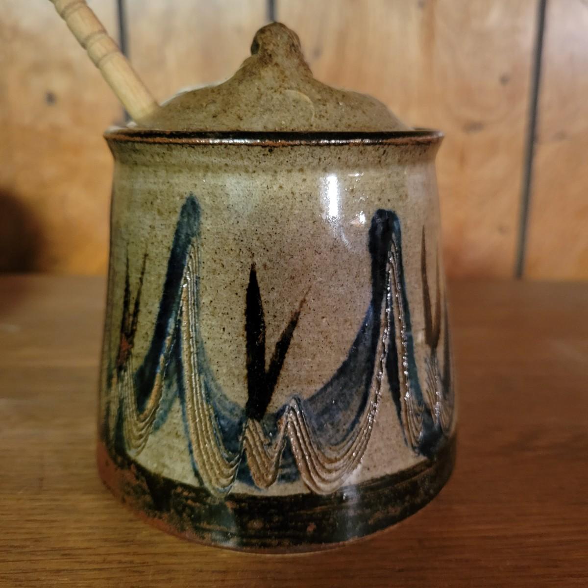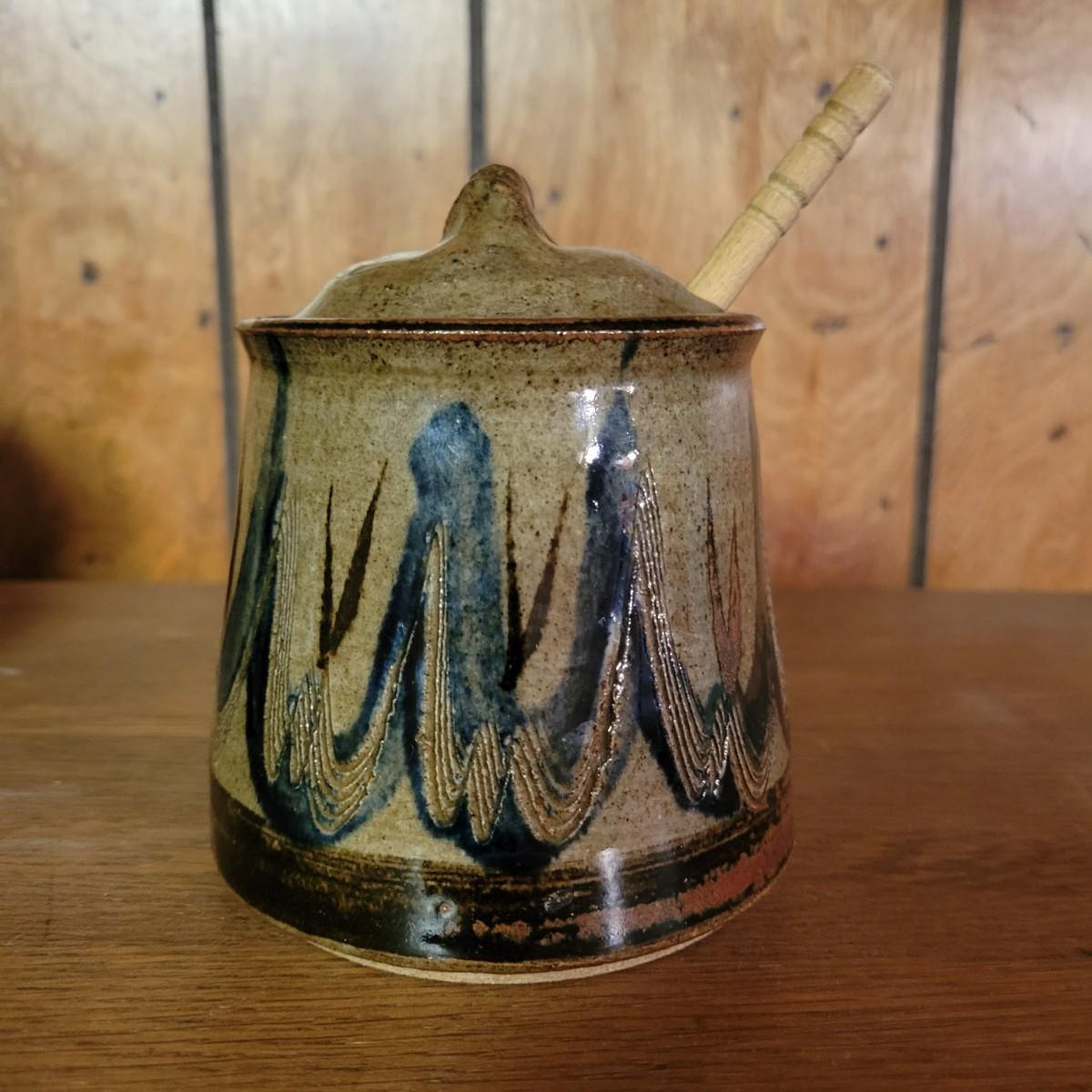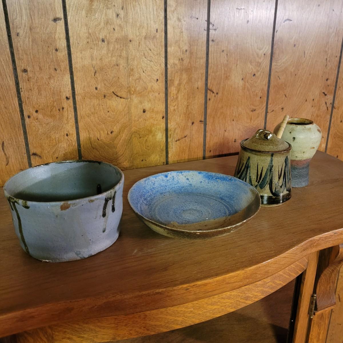 An assortment of four pieces of pottery. Included is a small vase, bowl, honey pot and plate. The honey pot is signed. The plate does have a small section that the glaze is chipping and measures approximately 8"D x 1.5"H. Local pickup only