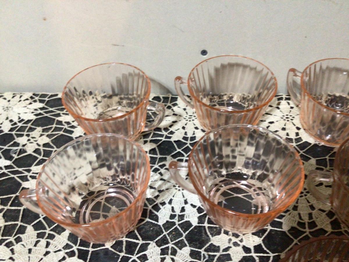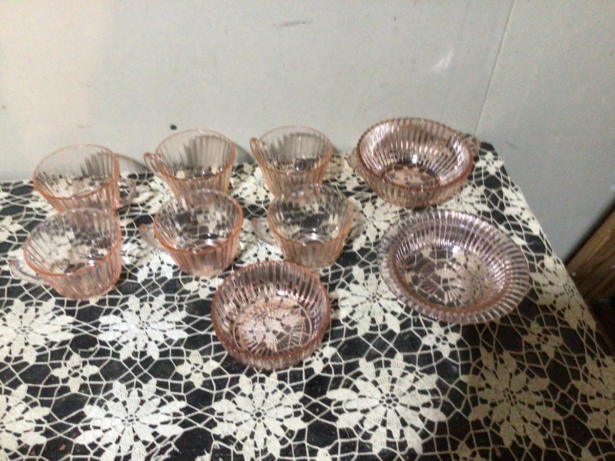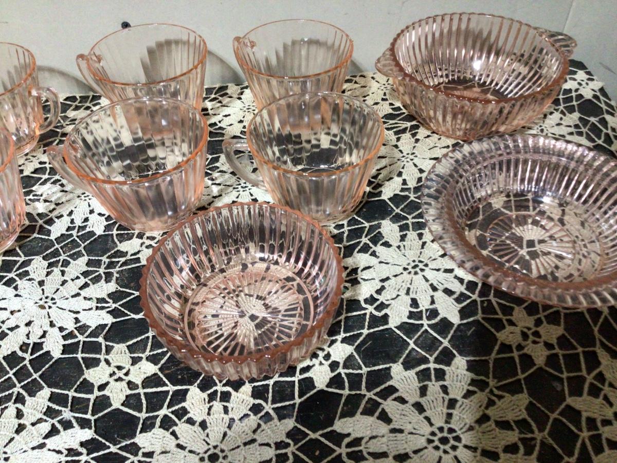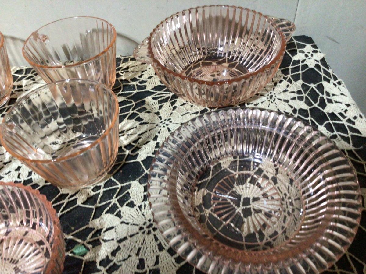 You get three nice pink glass Queen Mary bowls and 6 pink glass Peteware cups.