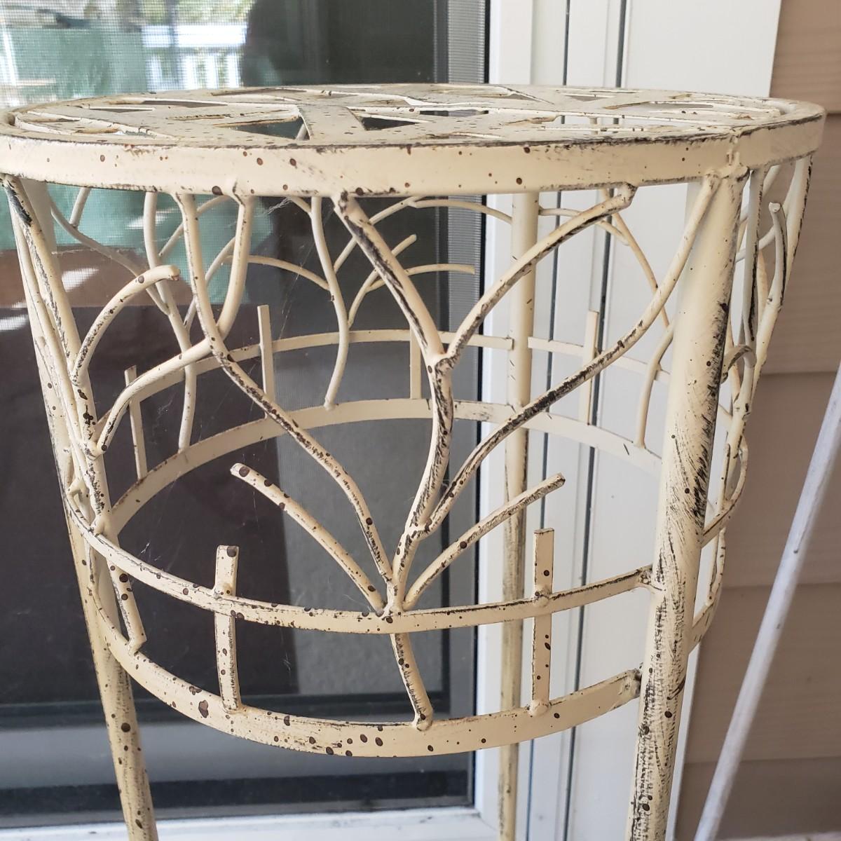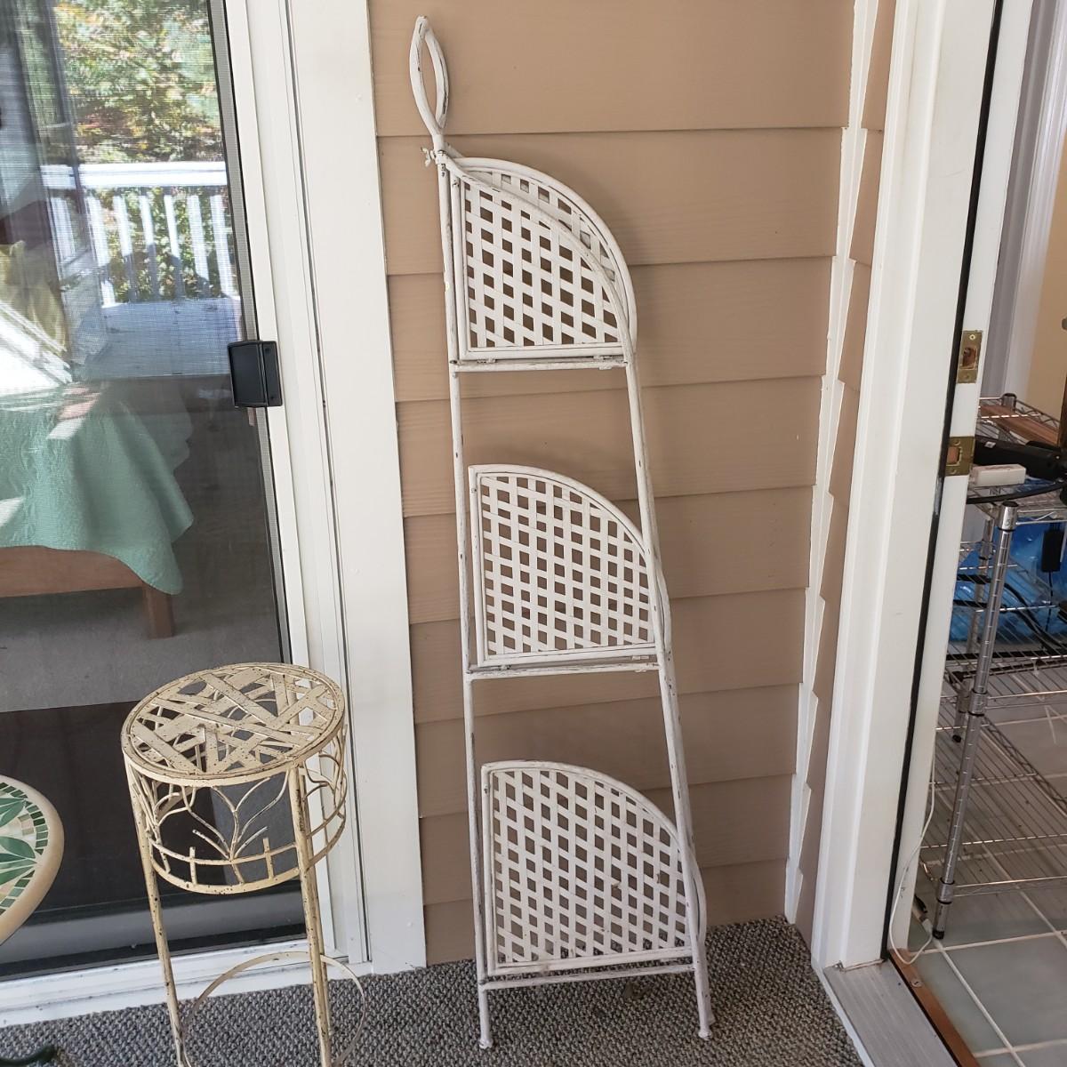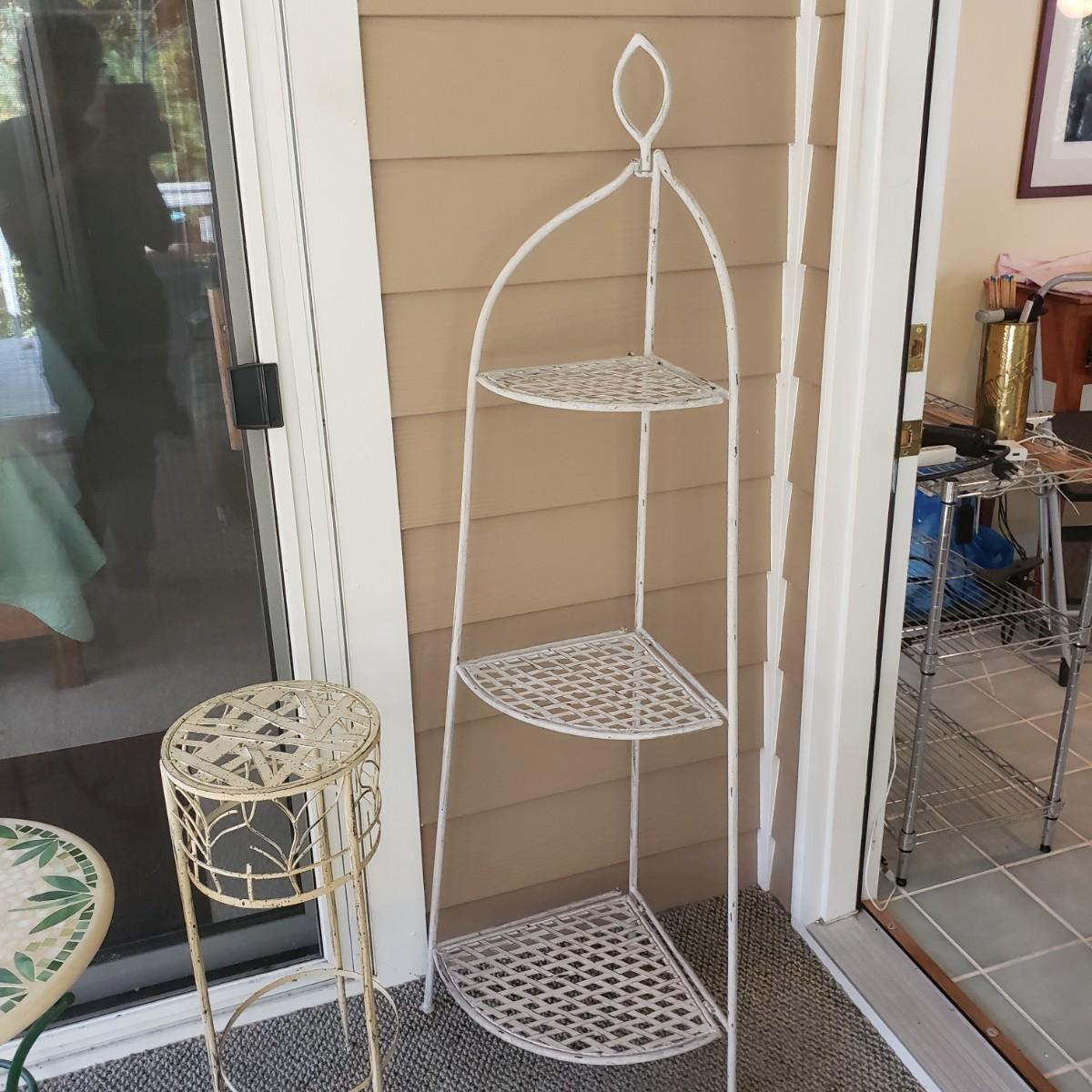 This plant stand lot features three different styles. The metal, tall three tiered corner stand measures 14" x 15"x 48"H. The corner stand folds up for easy storage. The metal single plant stand (11" x 27"H) has a woven pattern on the top and branches on the sides.