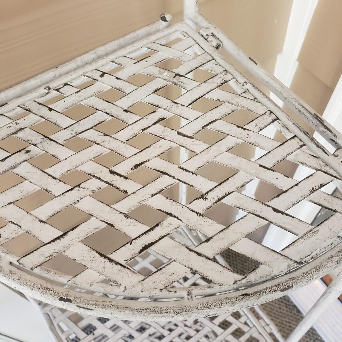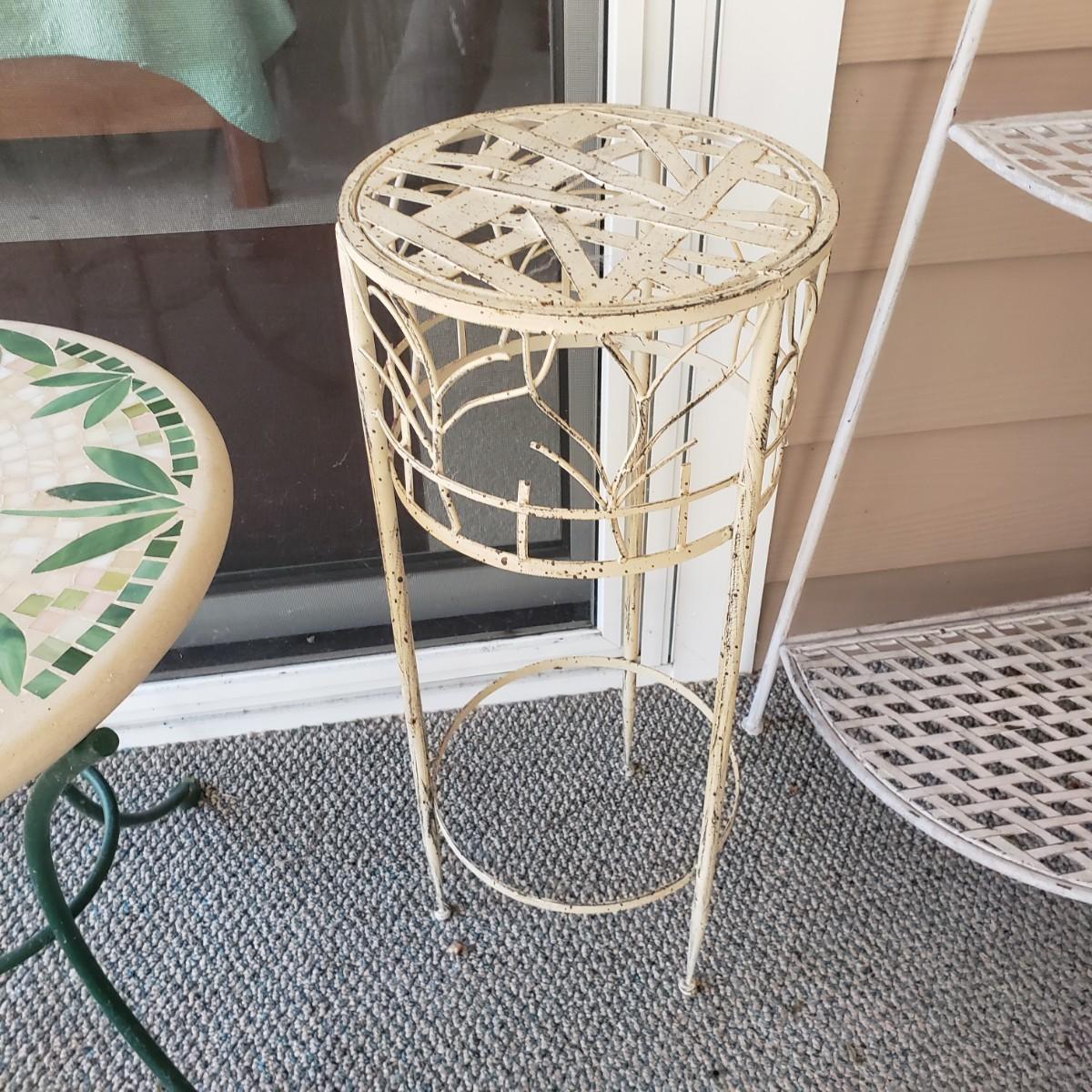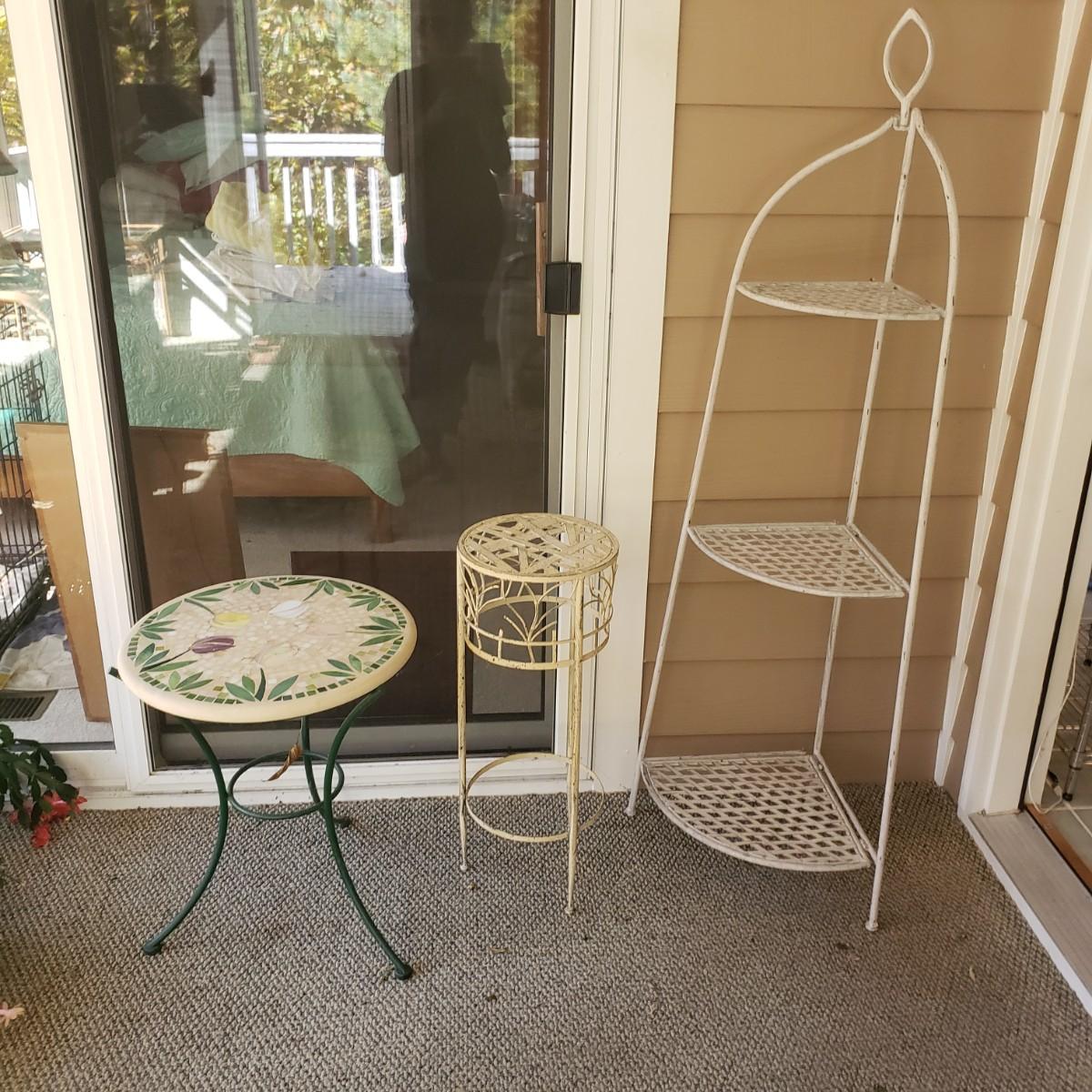 This plant stand lot features three different styles. The metal, tall three tiered corner stand measures 14" x 15"x 48"H. The corner stand folds up for easy storage. The metal single plant stand (11" x 27"H) has a woven pattern on the top and branches on the sides.