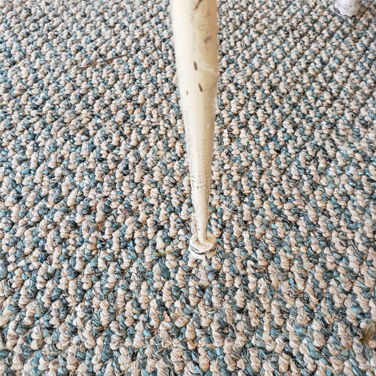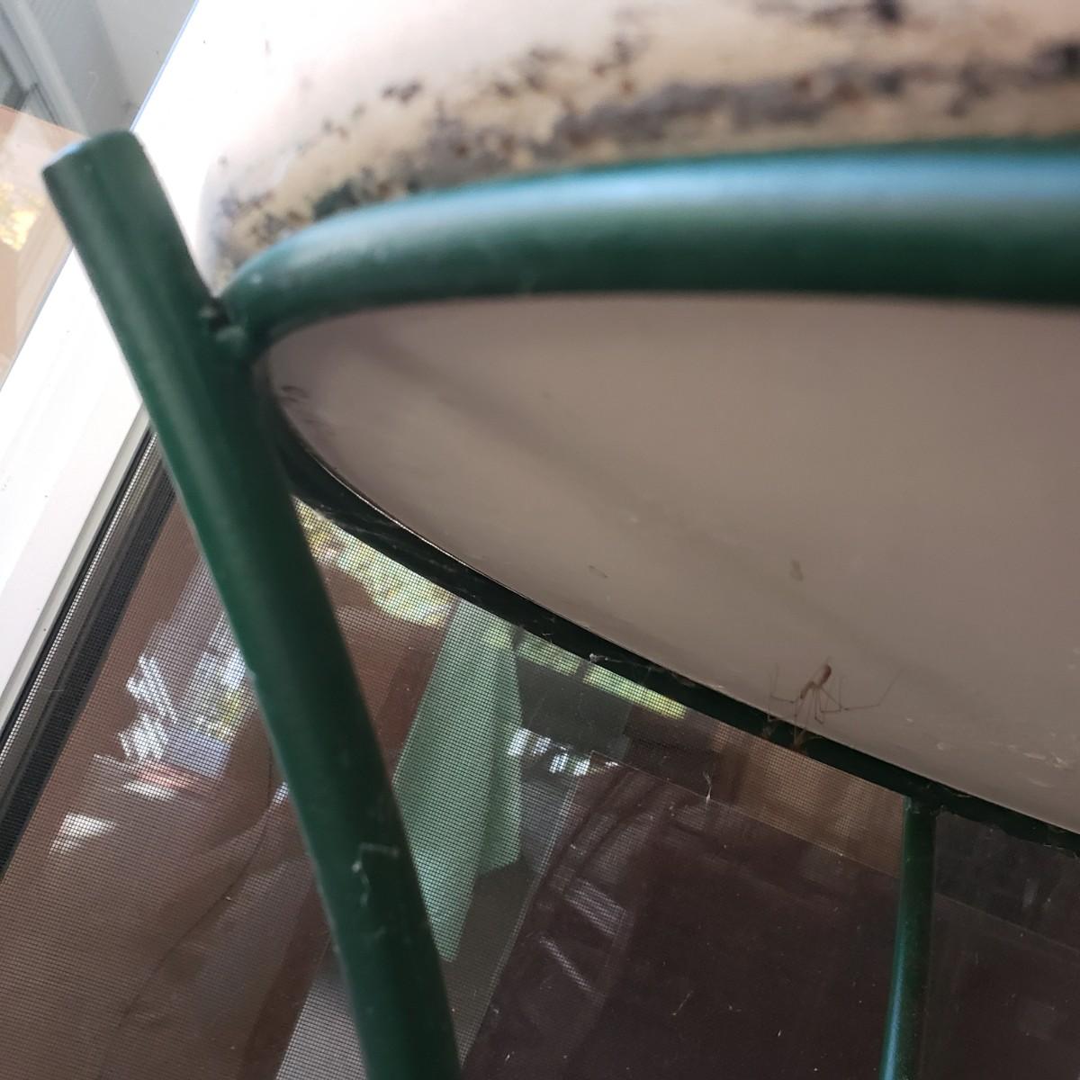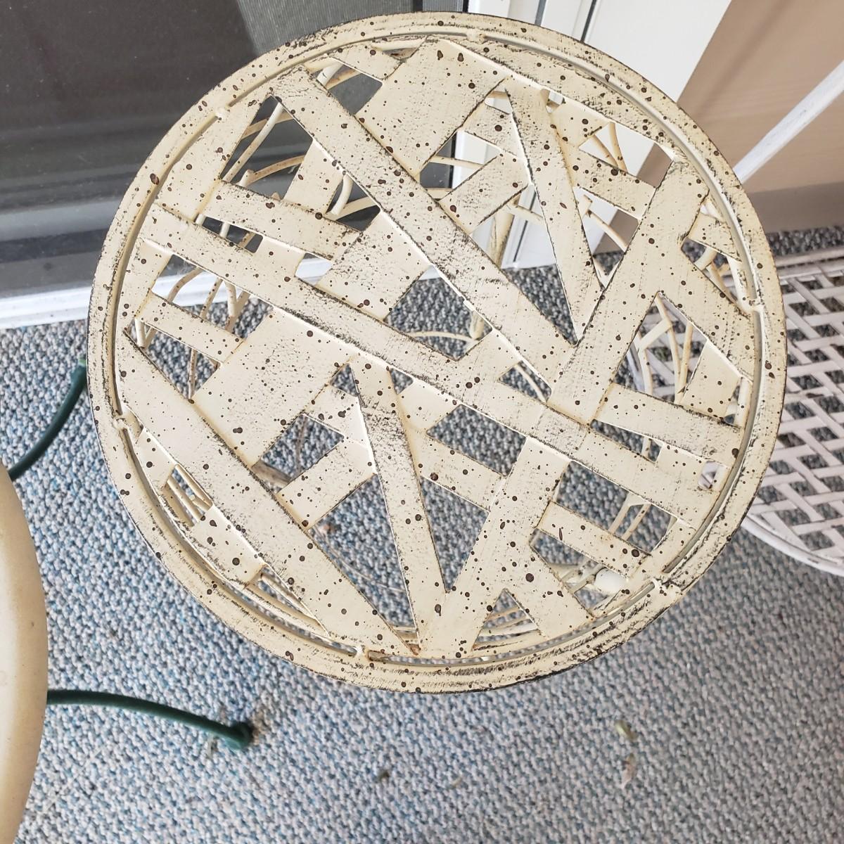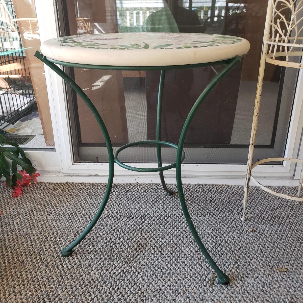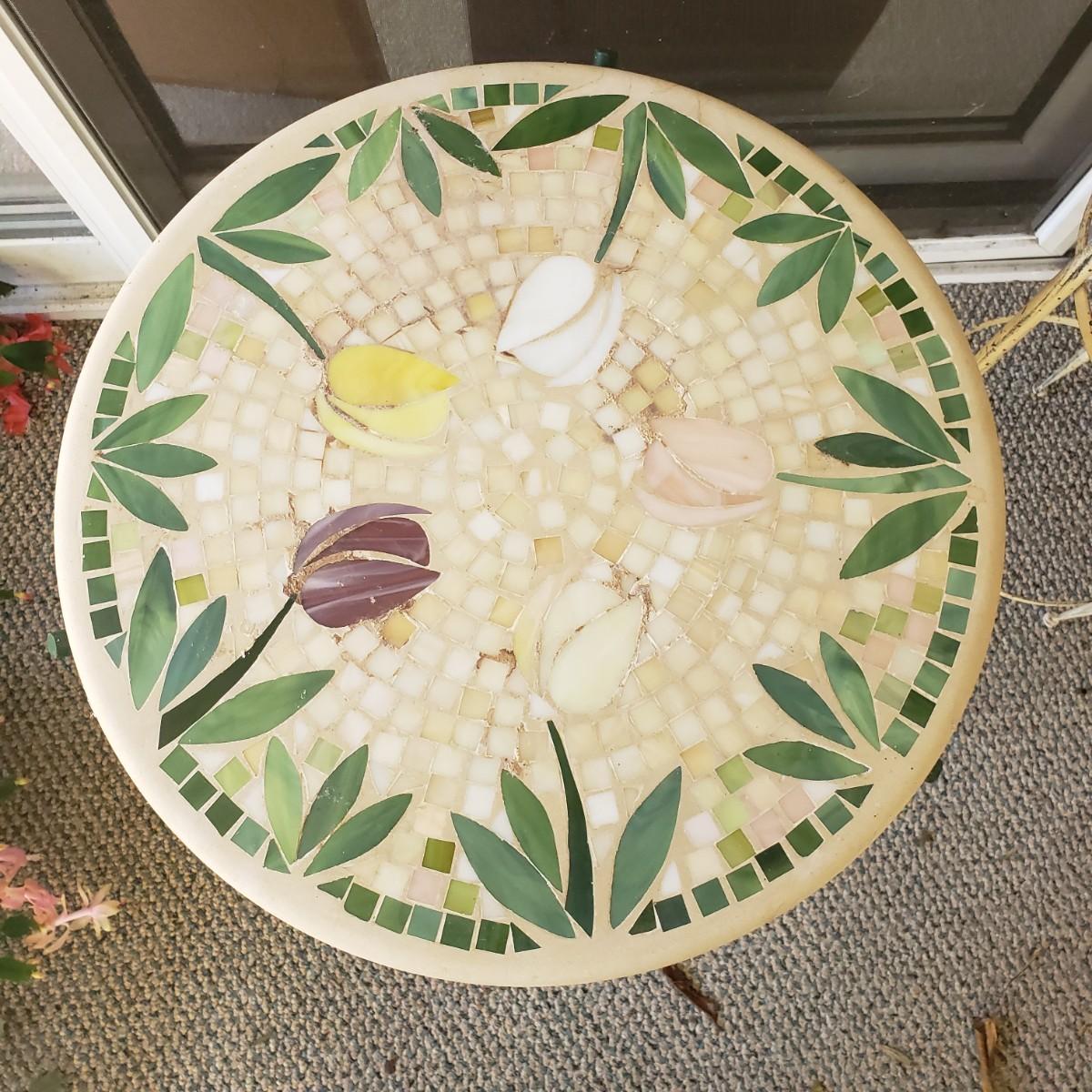 The mosaic tulip table has a sturdy metal base with a cement table top with glass mosaic decoration. The top can be removed, but it's heavy.