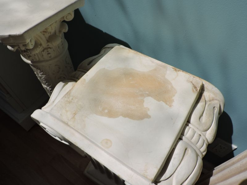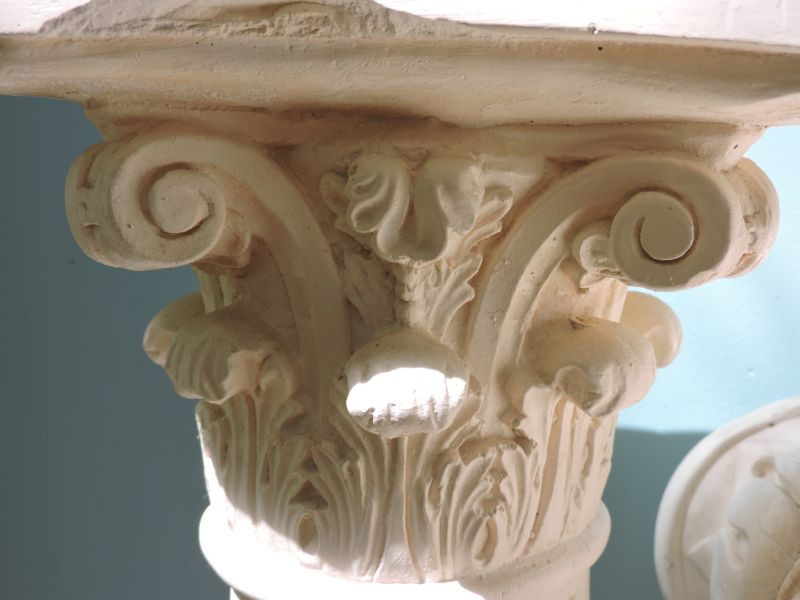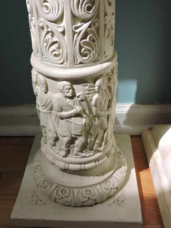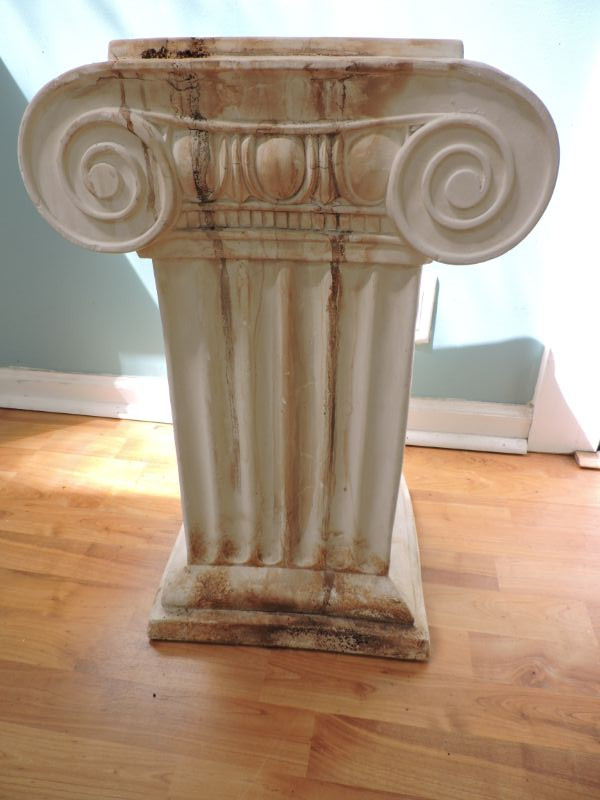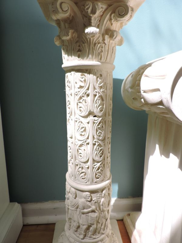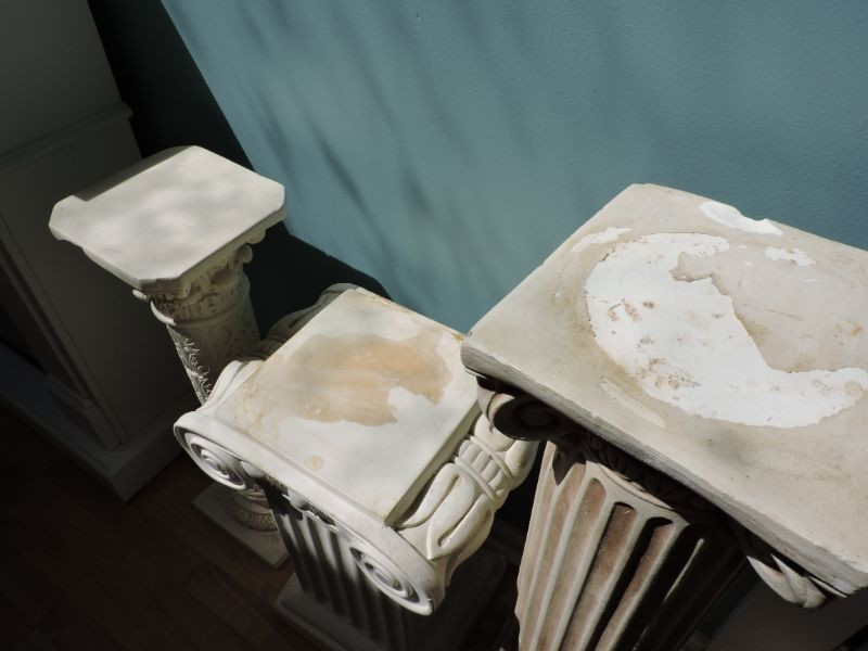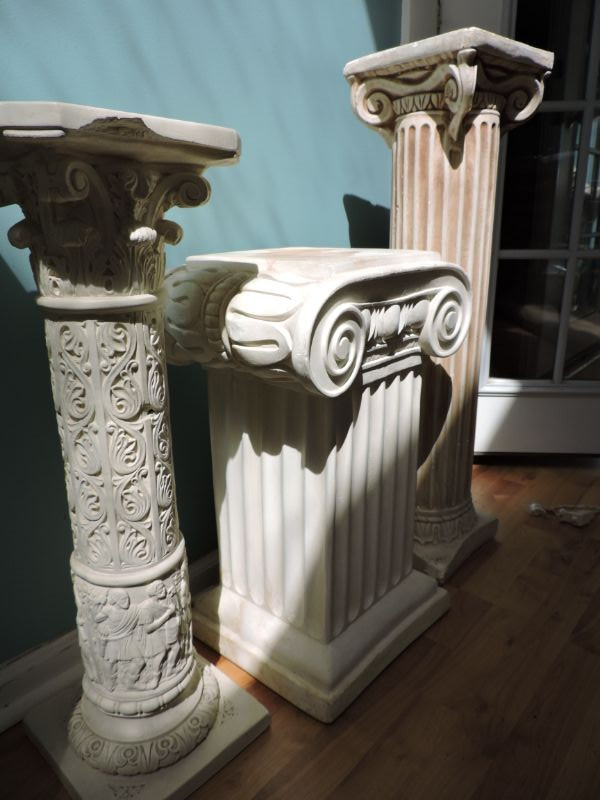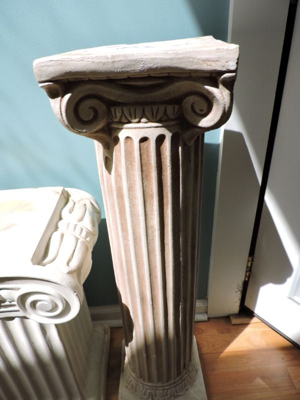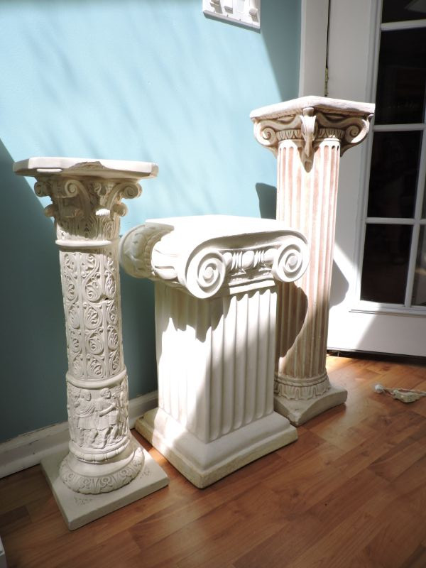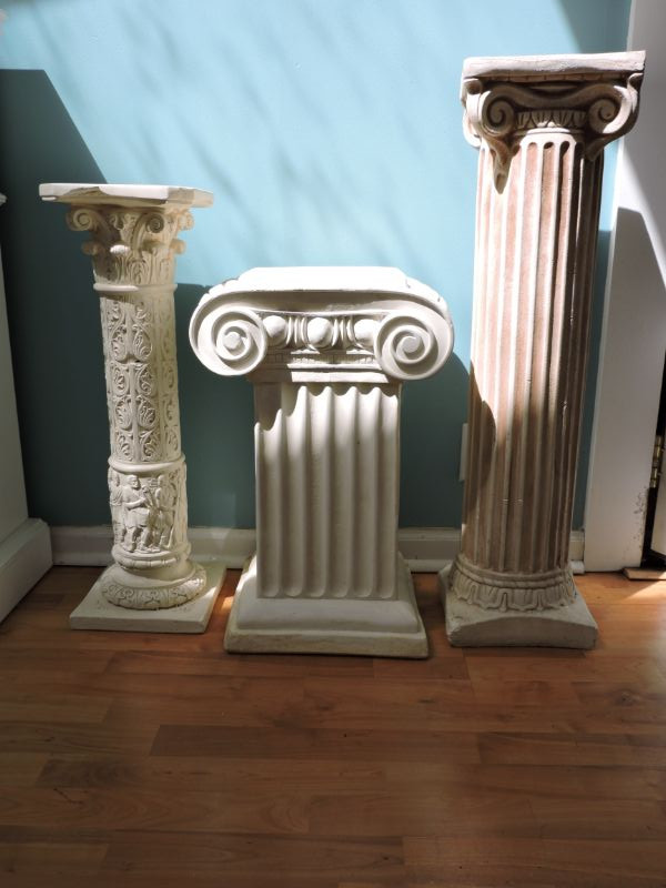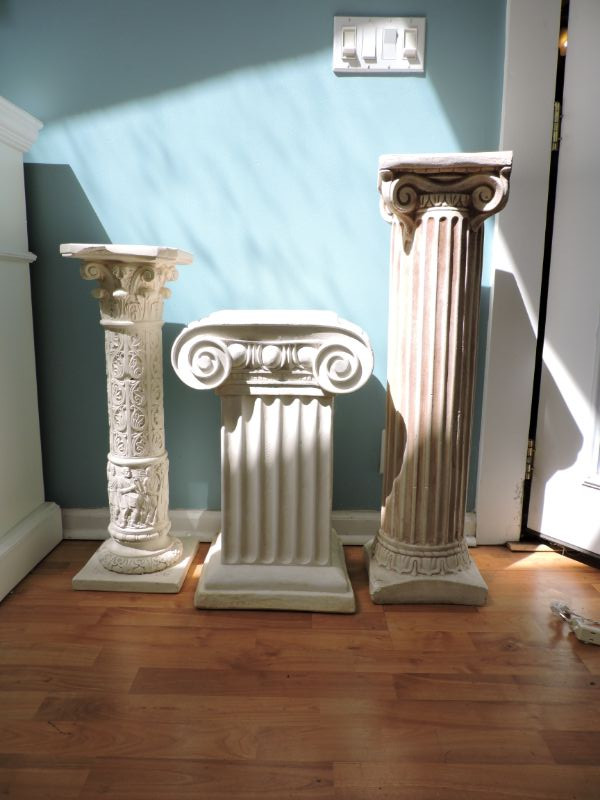 Three tall plaster pillar plant stands. Beautiful way to raise your plants up to the sunlight and away from playful pets and kids! Made of sturdy cast plaster these beauties will look great in any room! These are cast to have some imperfections, but the top of the taller one does have a chip on the side with some chipping paint, and there is some staining on one.