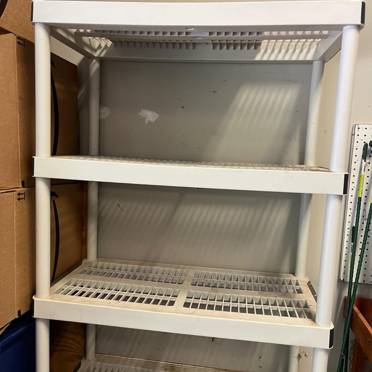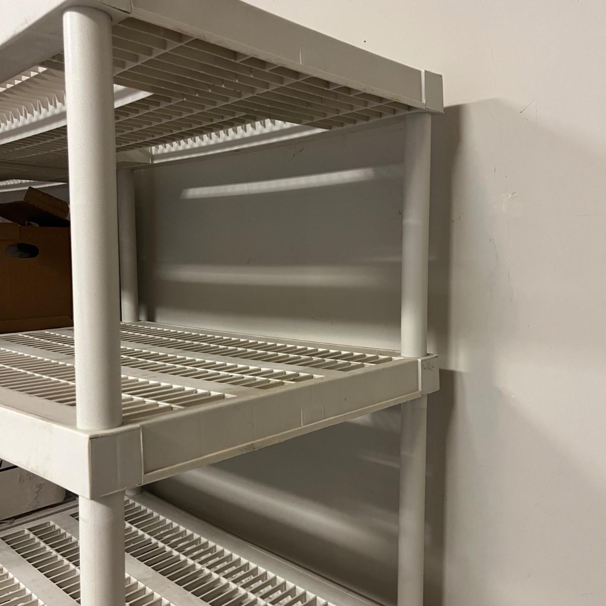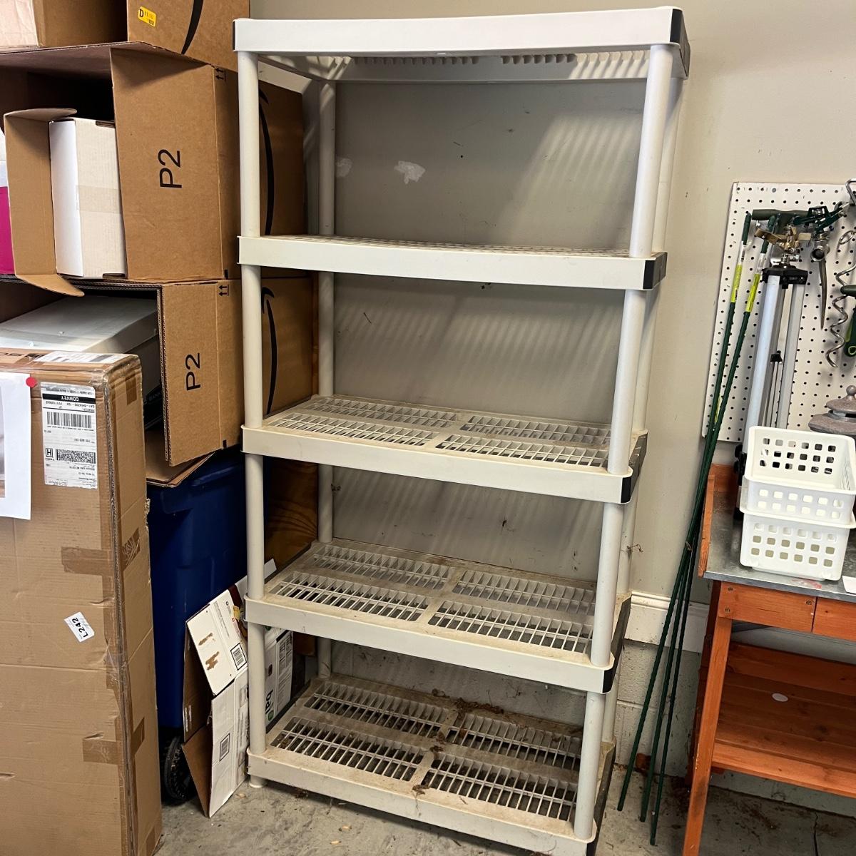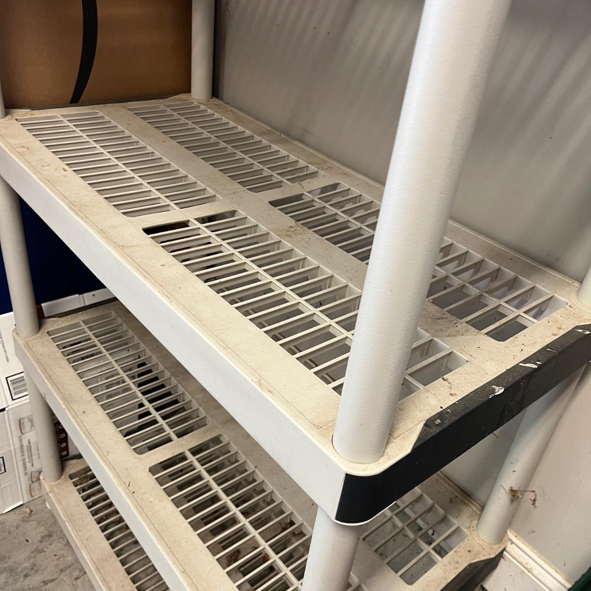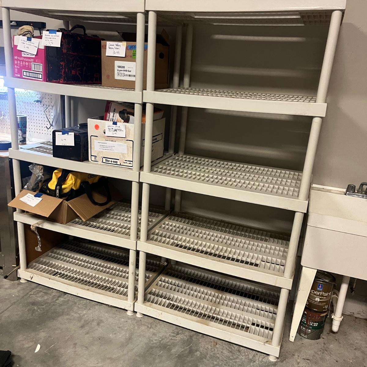 Lot includes four plastic shelving units. Two measure 36” x 24” x 73”H and two measures 36” x 18” x 73”H. Items on shelf are not included.