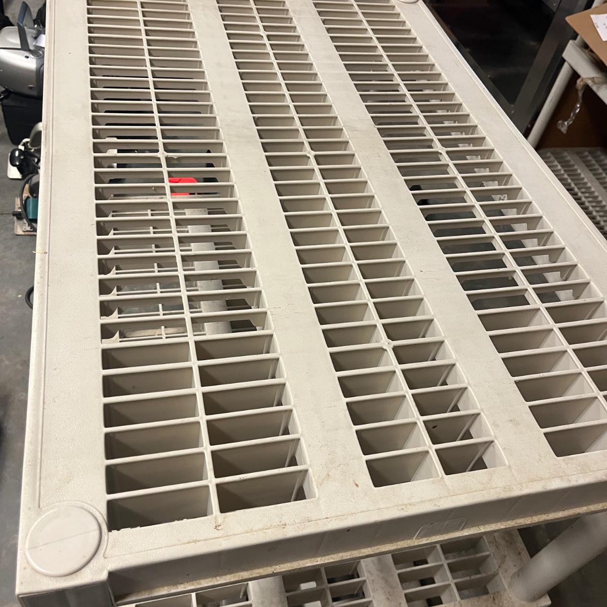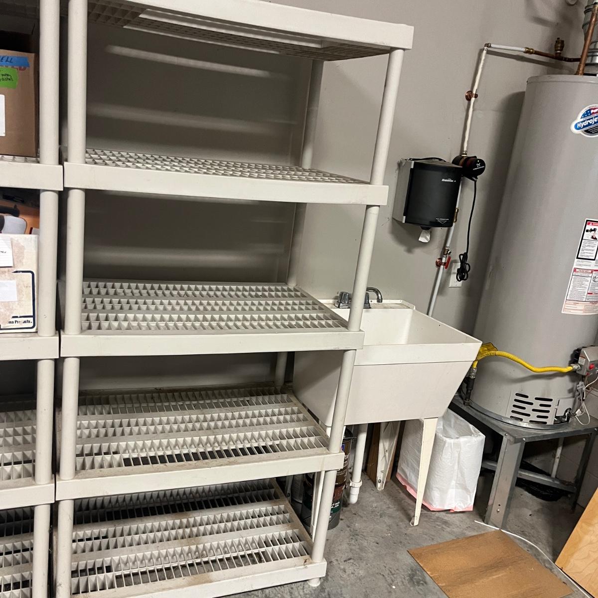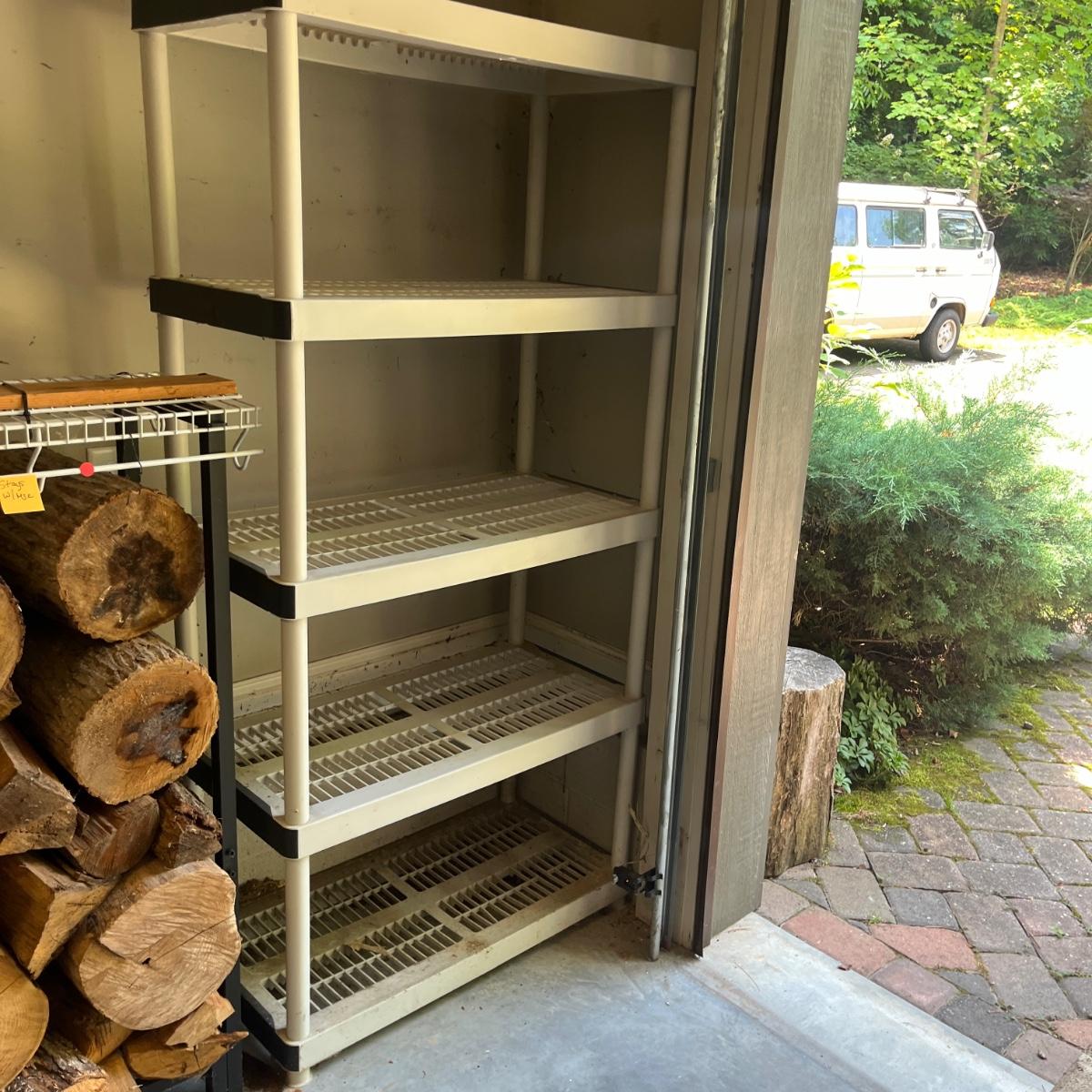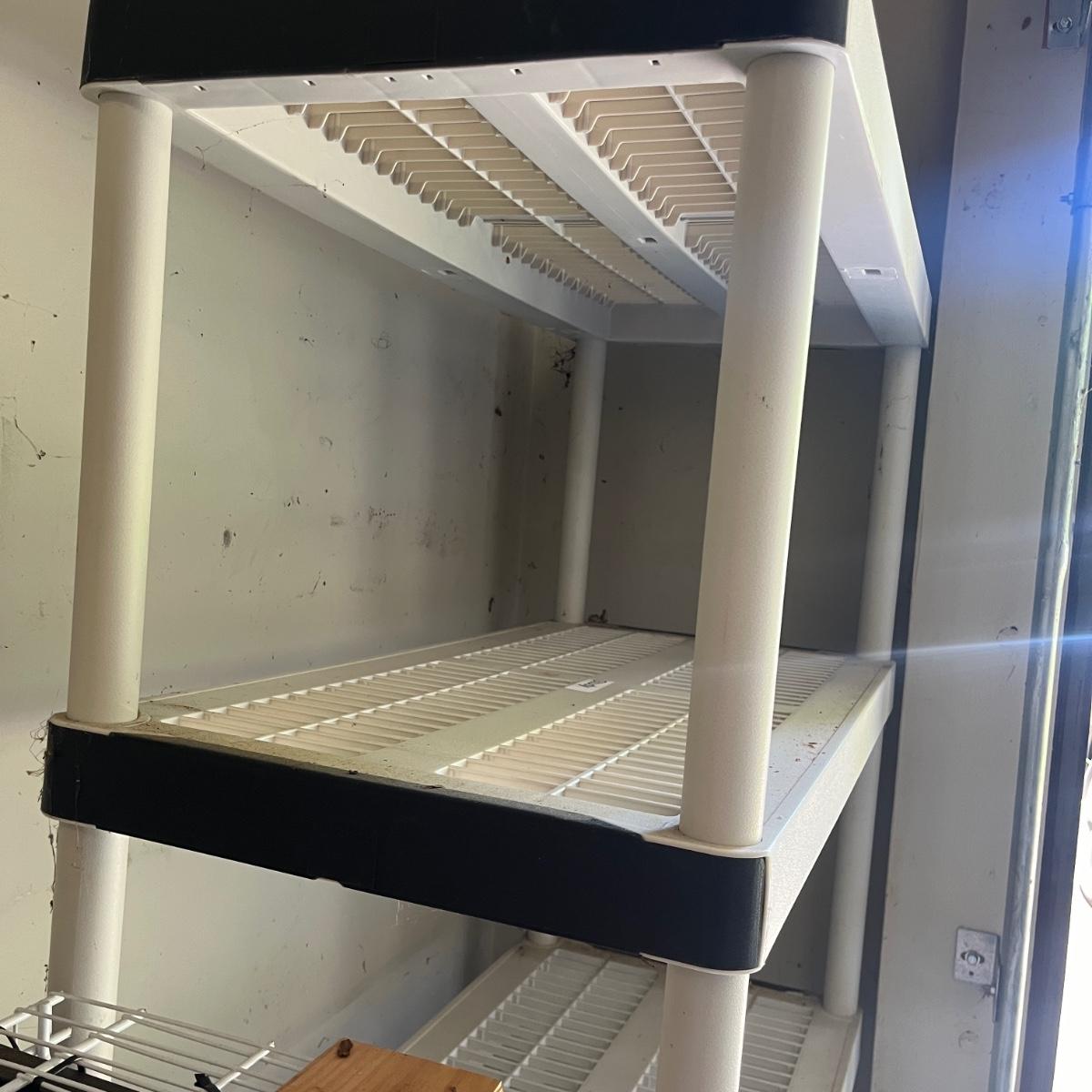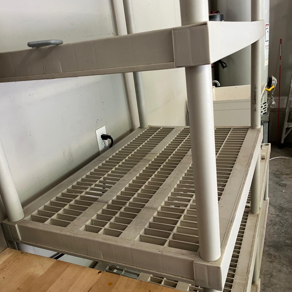 Lot includes four plastic shelving units. Two measure 36” x 24” x 73”H and two measures 36” x 18” x 73”H. Items on shelf are not included.
