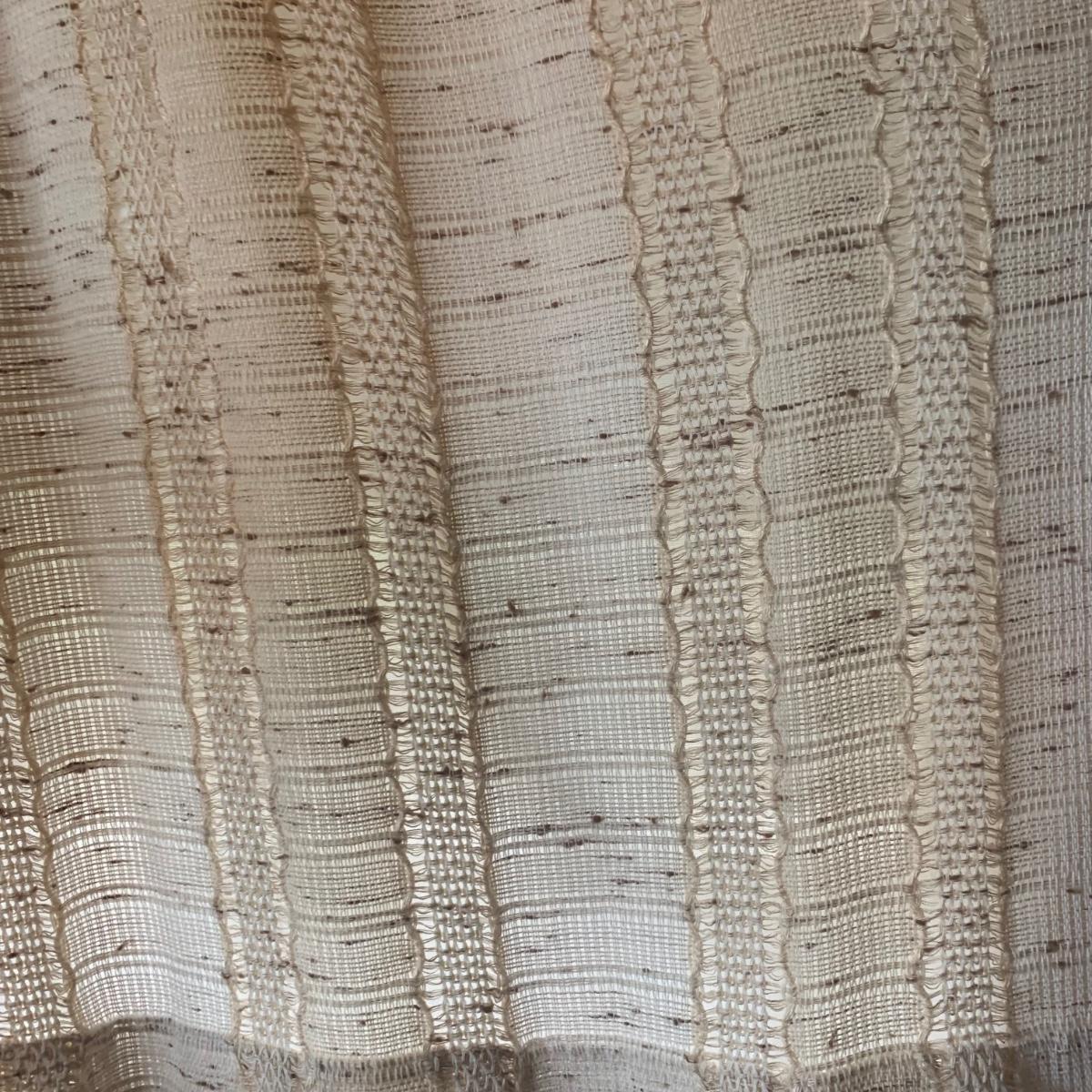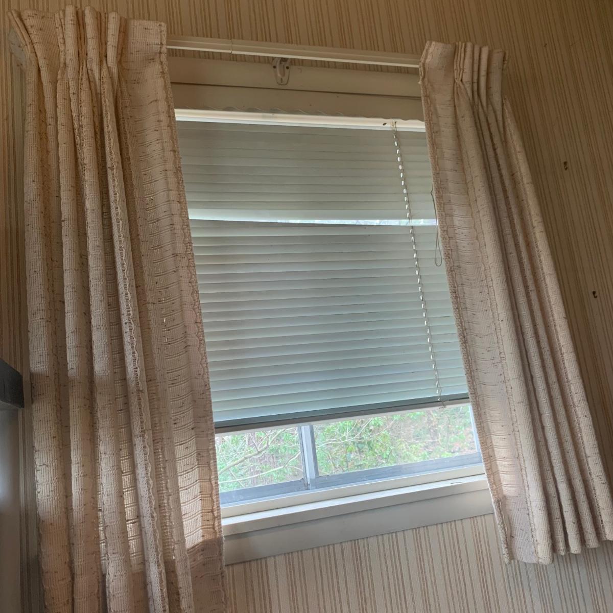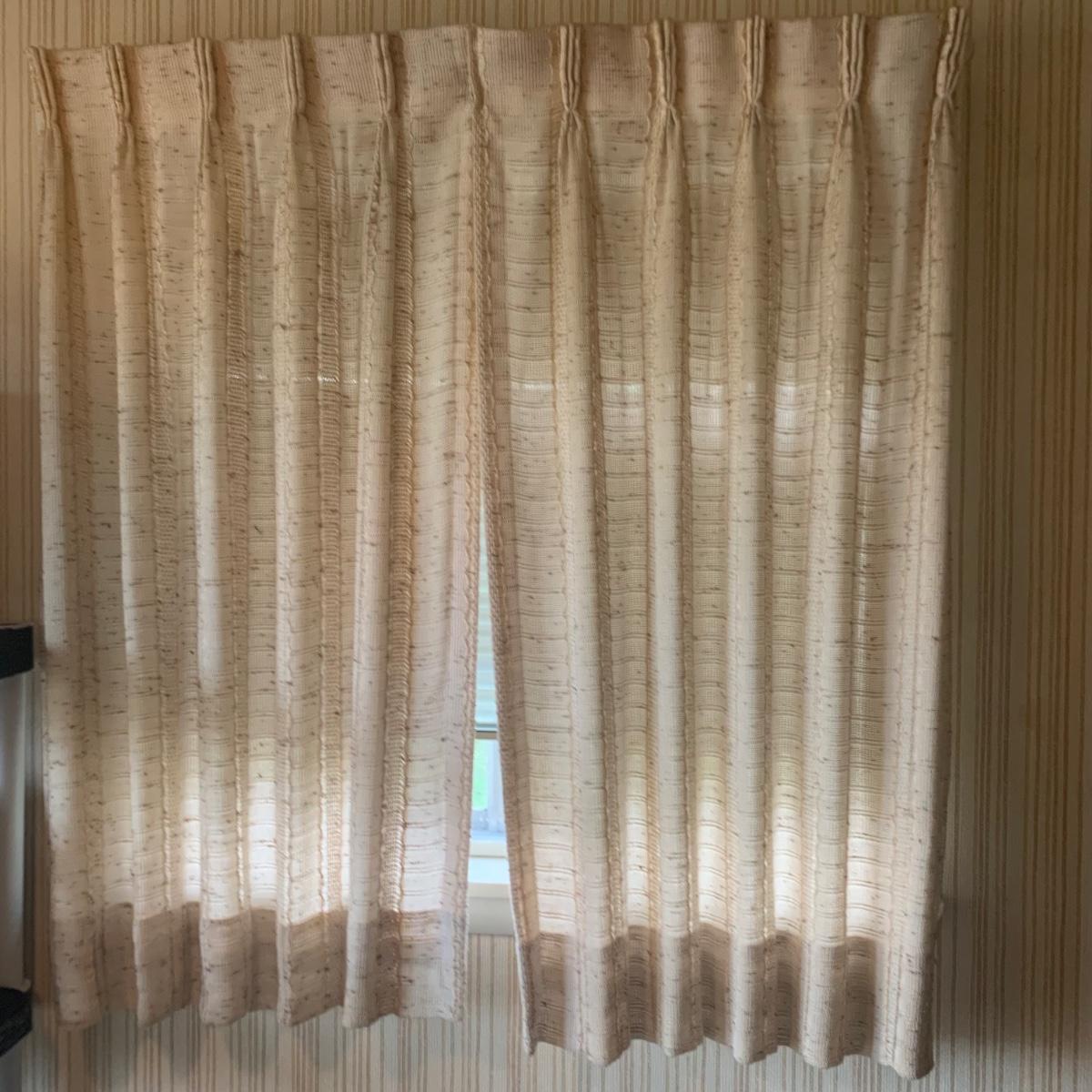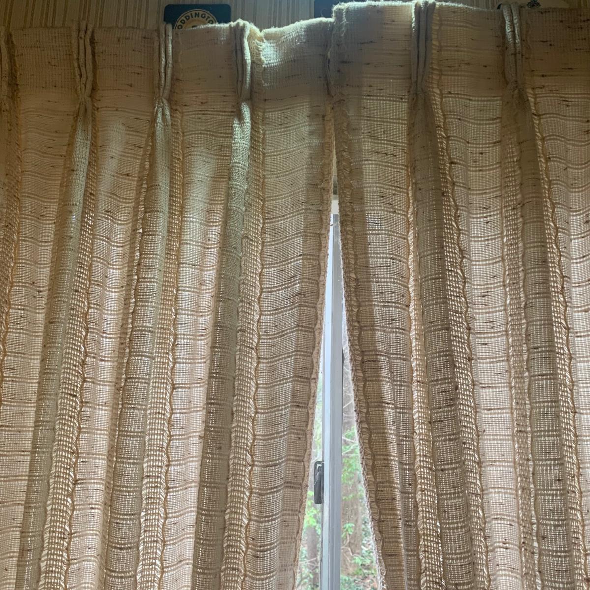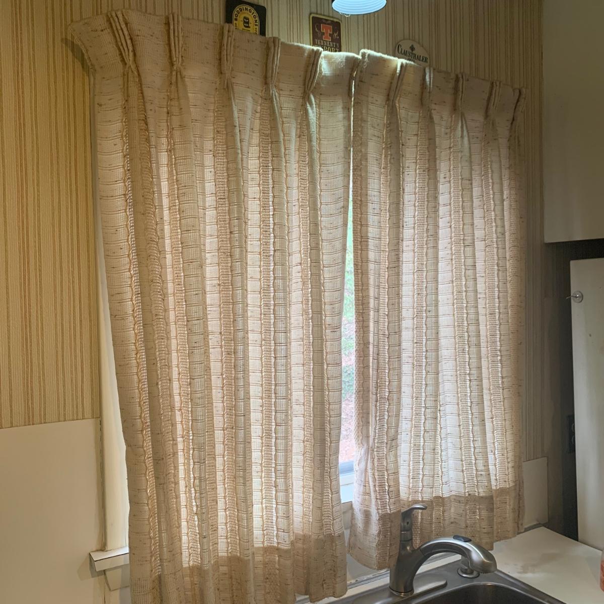 This lot contains three sets of short window curtains. Two of the sets are matching. These are a linen color with a woven pattern and have JC Penney tags. Each of these four panels measures approximately 42” x 44”H. They are currently on windows that are 41” x 38”H. One of the ropes used to open and close the panels is frayed; please see photos. It appears to be replaceable. There is a stain inside one of the curtains, not seen from the front.