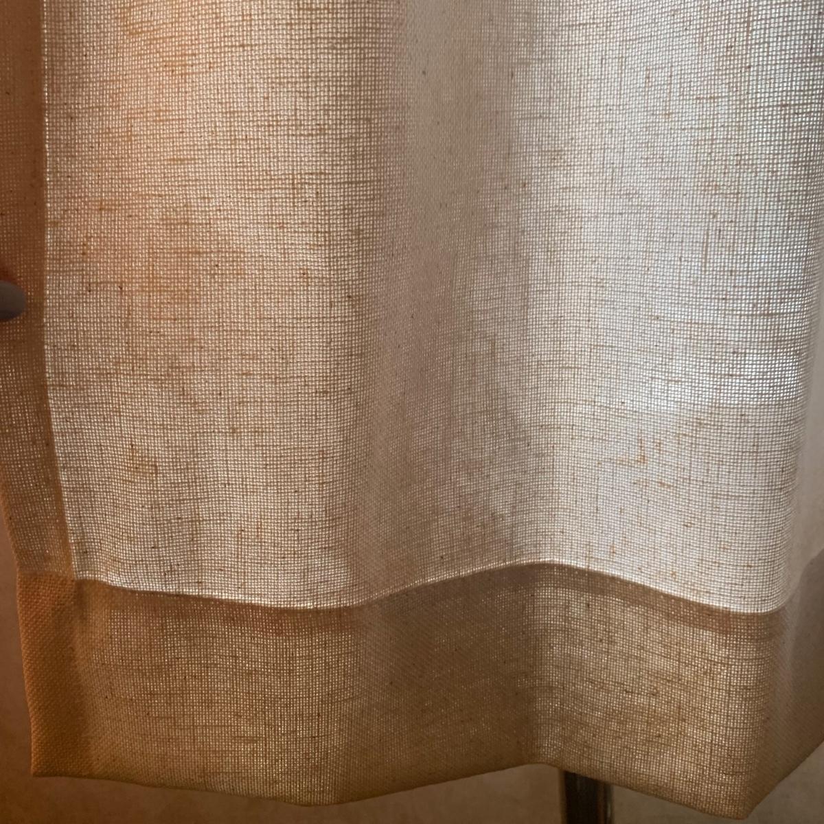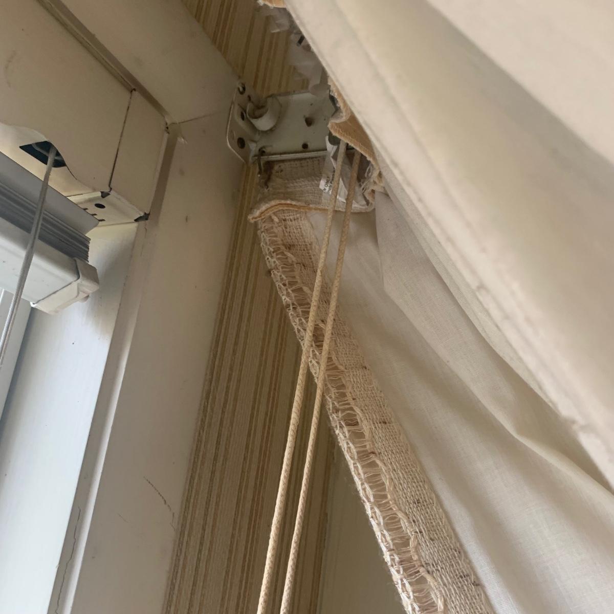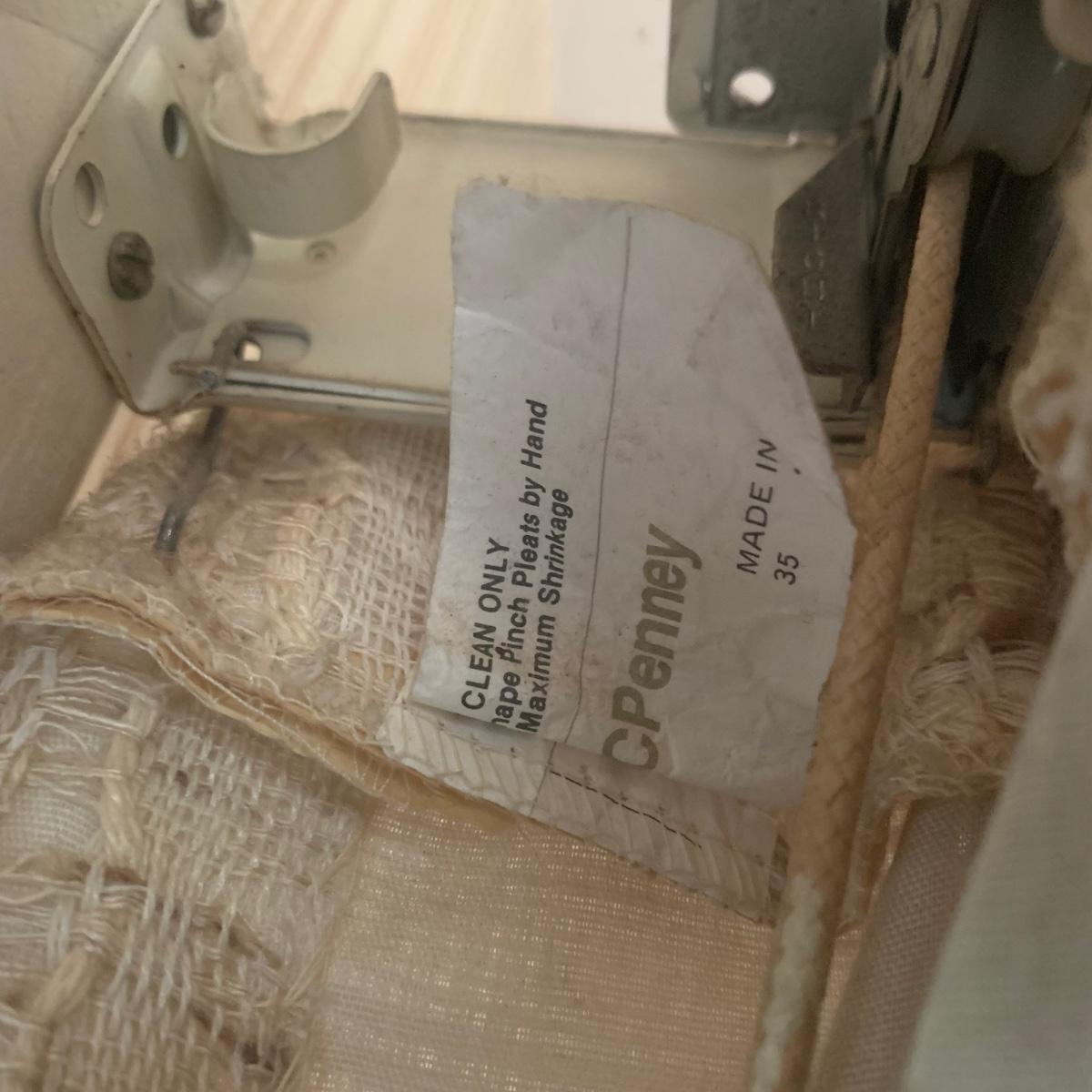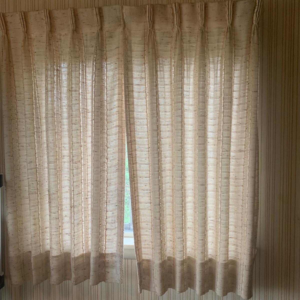 This lot contains three sets of short window curtains. Two of the sets are matching. These are a linen color with a woven pattern and have JC Penney tags. Each of these four panels measures approximately 42” x 44”H. They are currently on windows that are 41” x 38”H. One of the ropes used to open and close the panels is frayed; please see photos. It appears to be replaceable. There is a stain inside one of the curtains, not seen from the front.