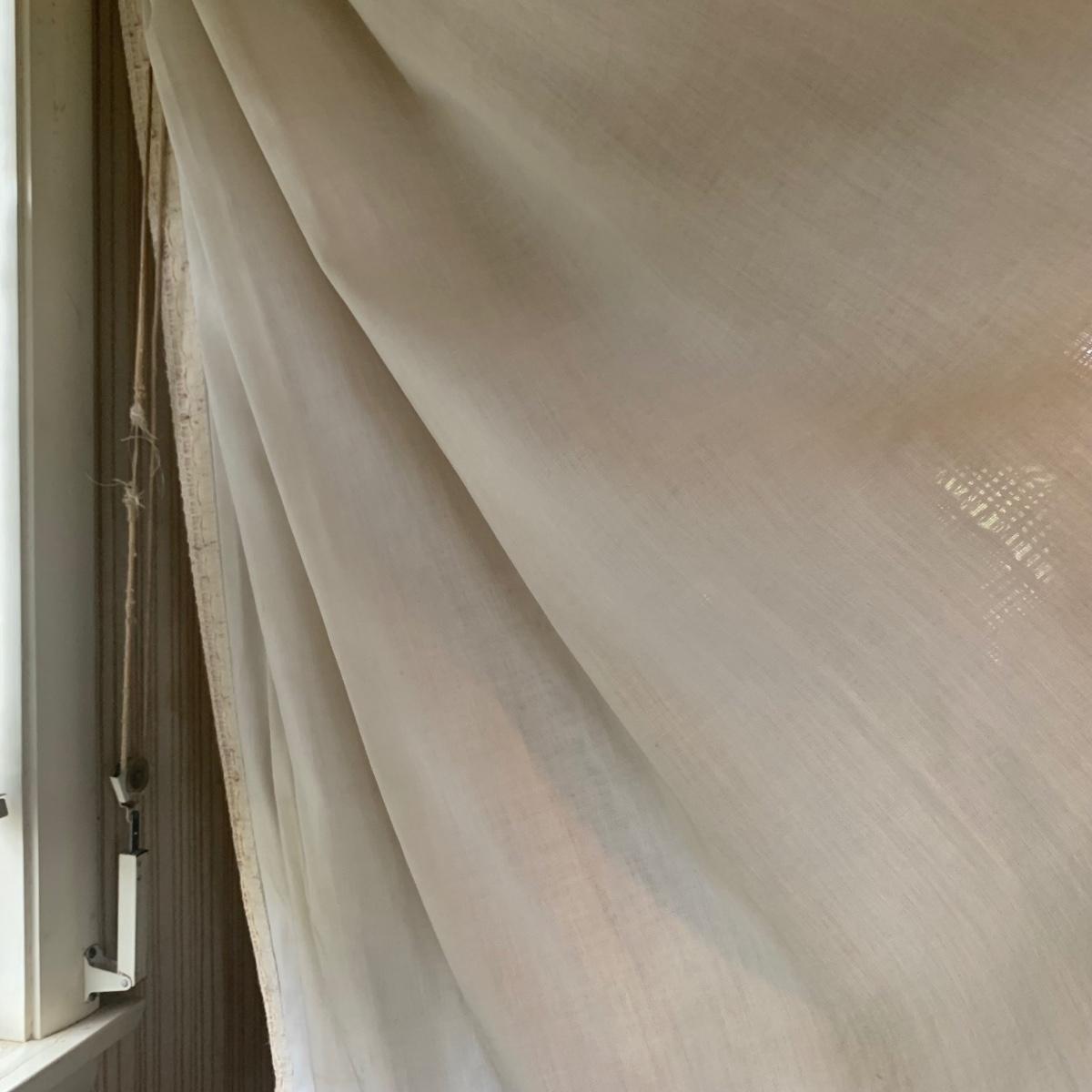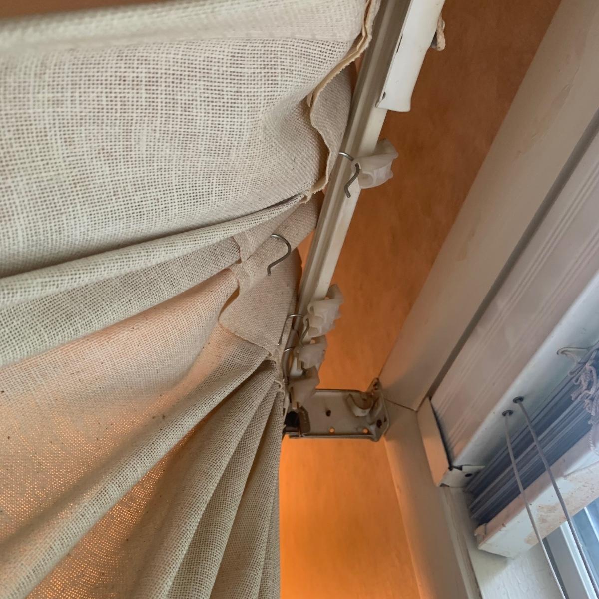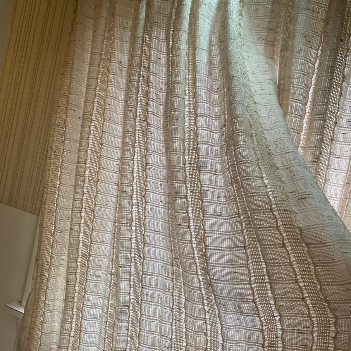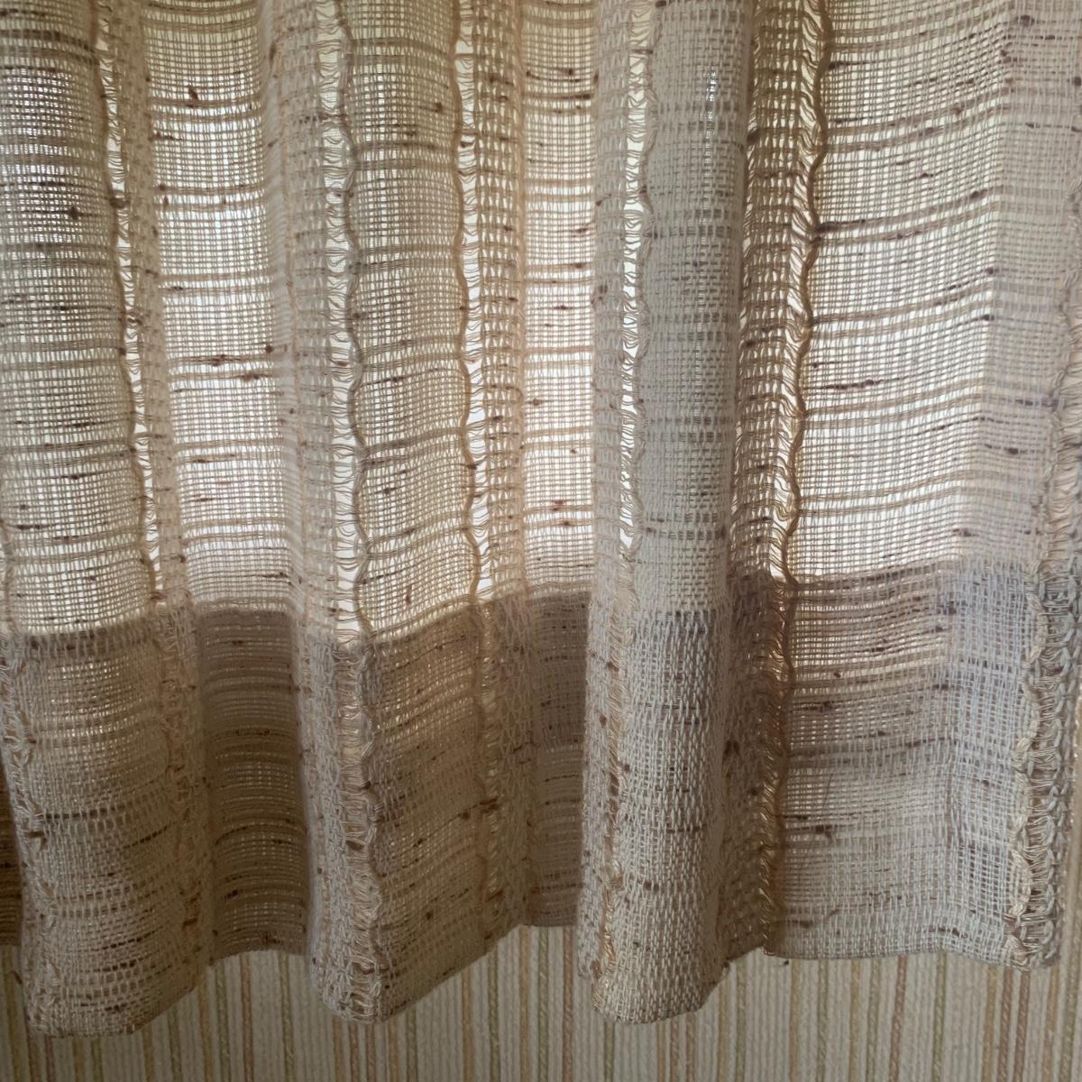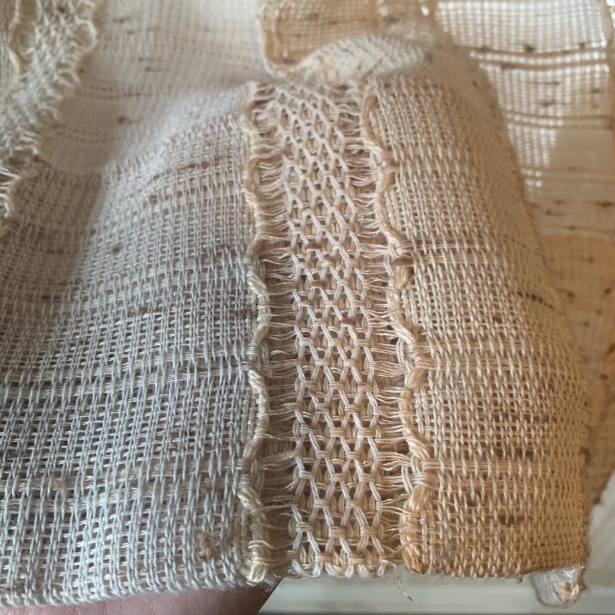This lot contains three sets of short window curtains. Two of the sets are matching. These are a linen color with a woven pattern and have JC Penney tags. Each of these four panels measures approximately 42” x 44”H. They are currently on windows that are 41” x 38”H. One of the ropes used to open and close the panels is frayed; please see photos. It appears to be replaceable. There is a stain inside one of the curtains, not seen from the front.
