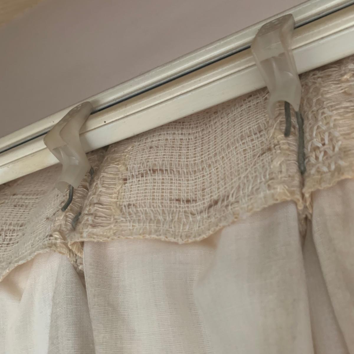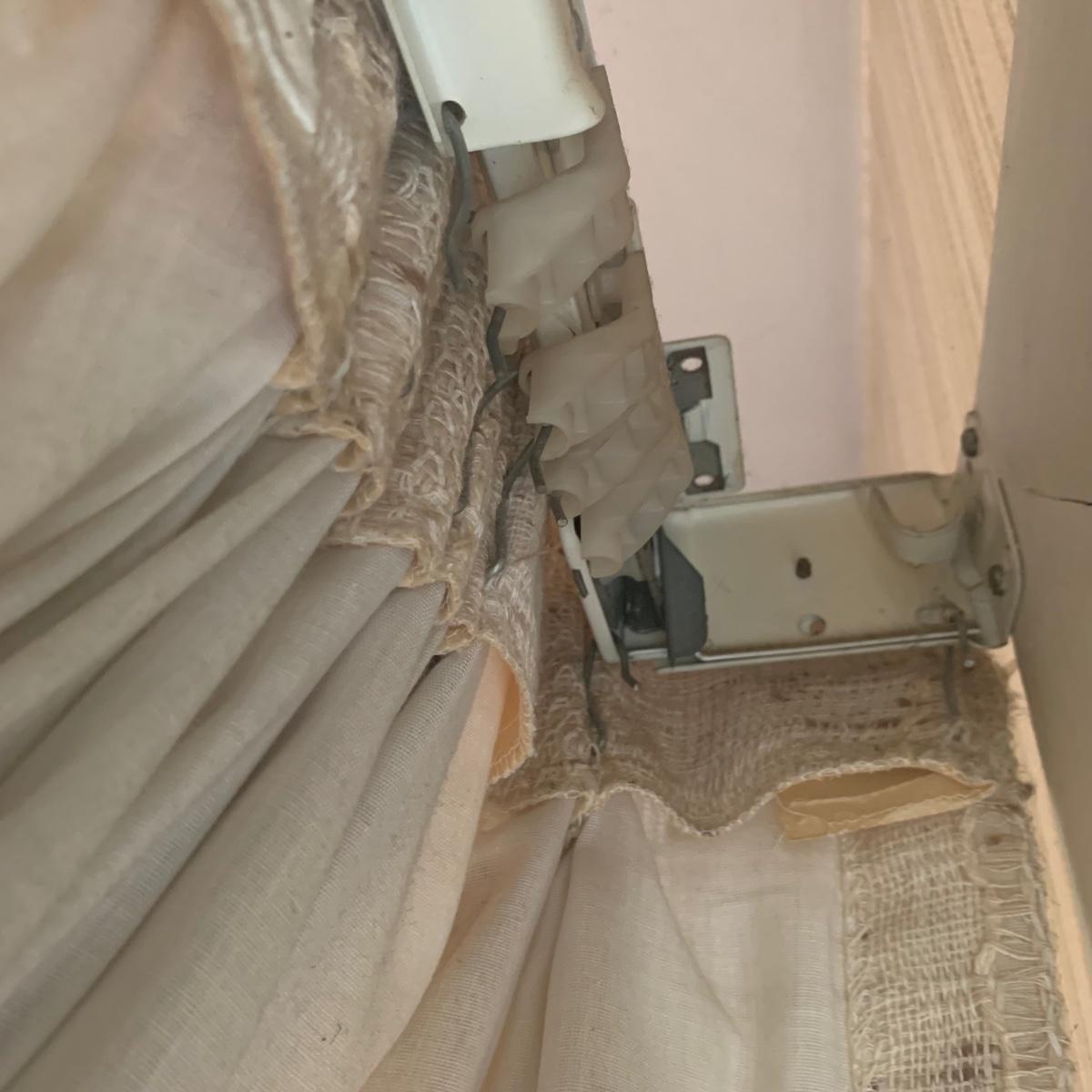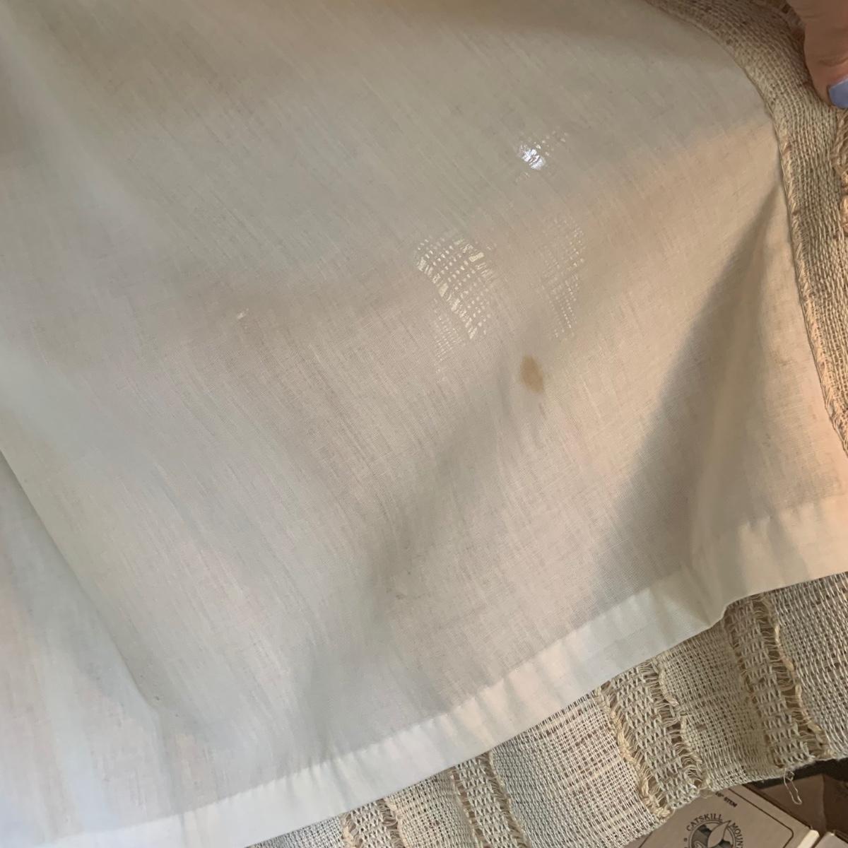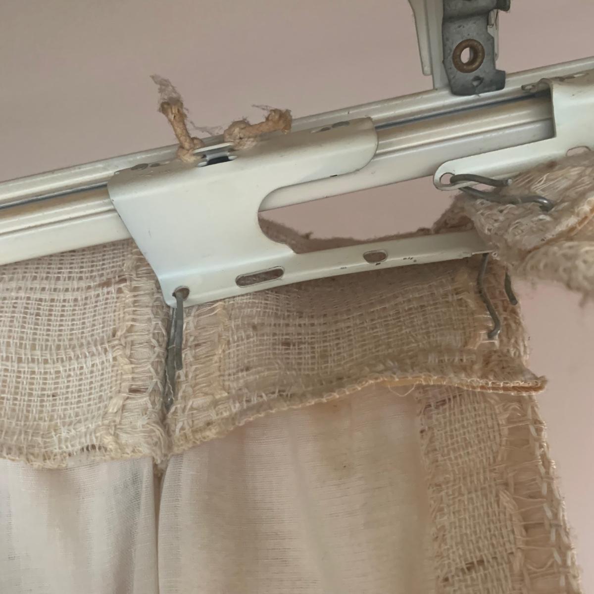 This lot contains three sets of short window curtains. Two of the sets are matching. These are a linen color with a woven pattern and have JC Penney tags. Each of these four panels measures approximately 42” x 44”H. They are currently on windows that are 41” x 38”H. One of the ropes used to open and close the panels is frayed; please see photos. It appears to be replaceable. There is a stain inside one of the curtains, not seen from the front.