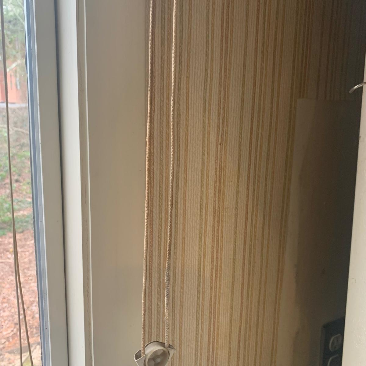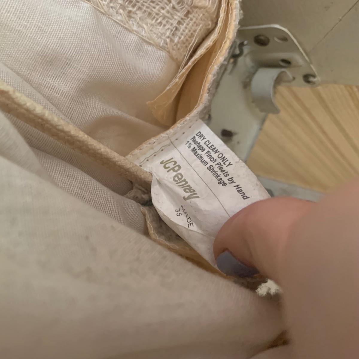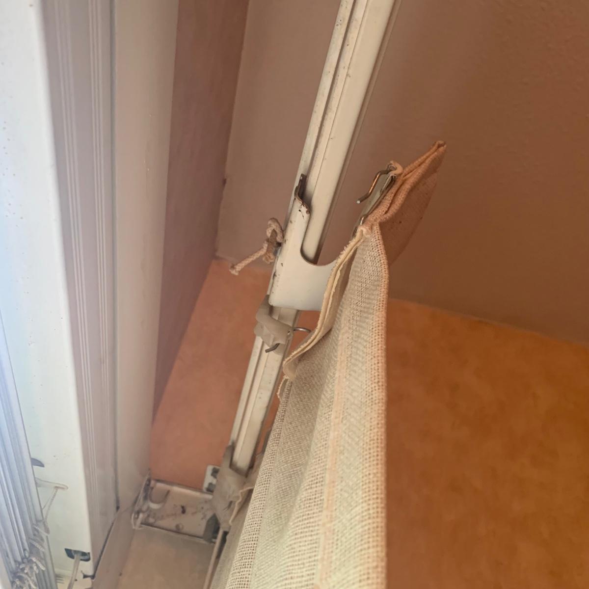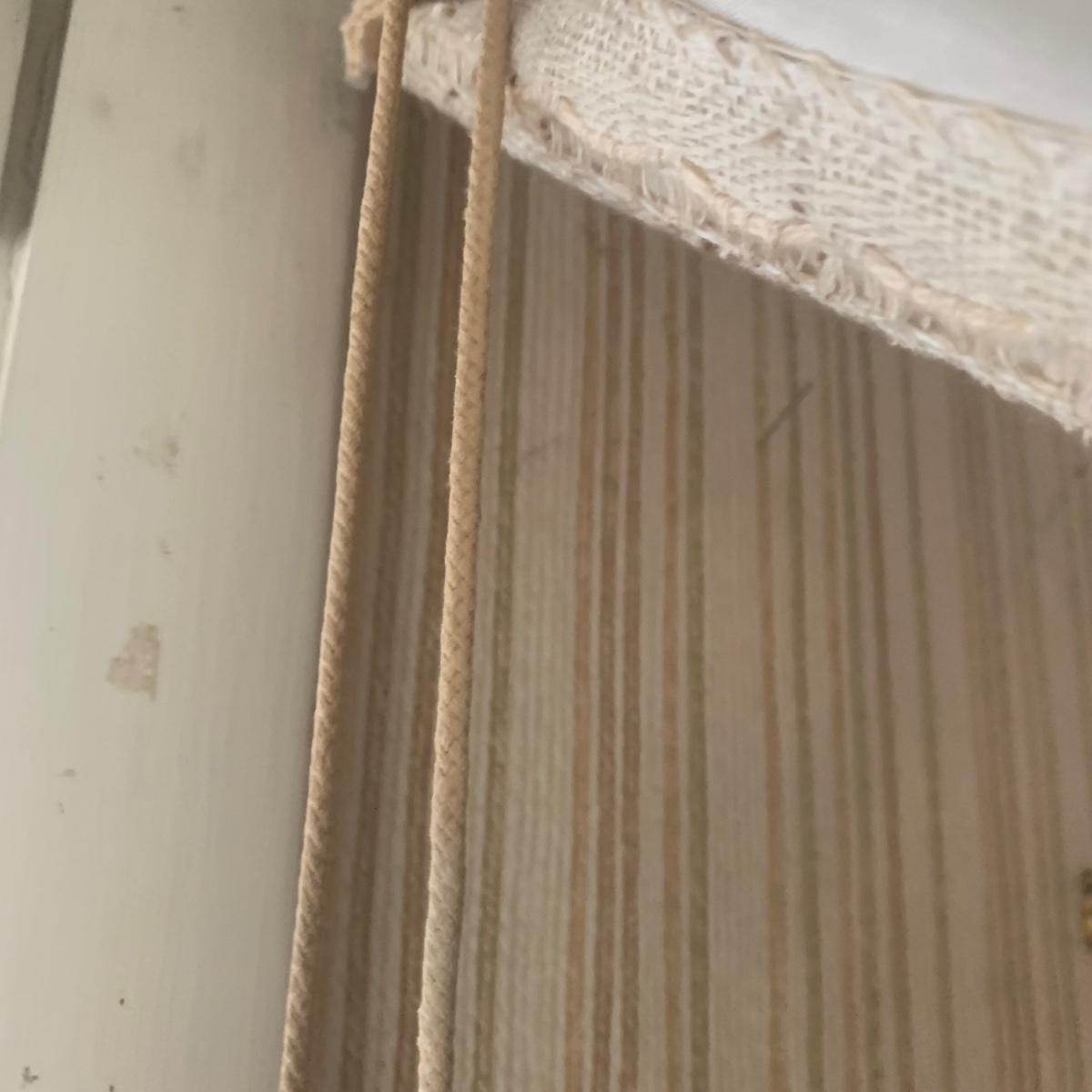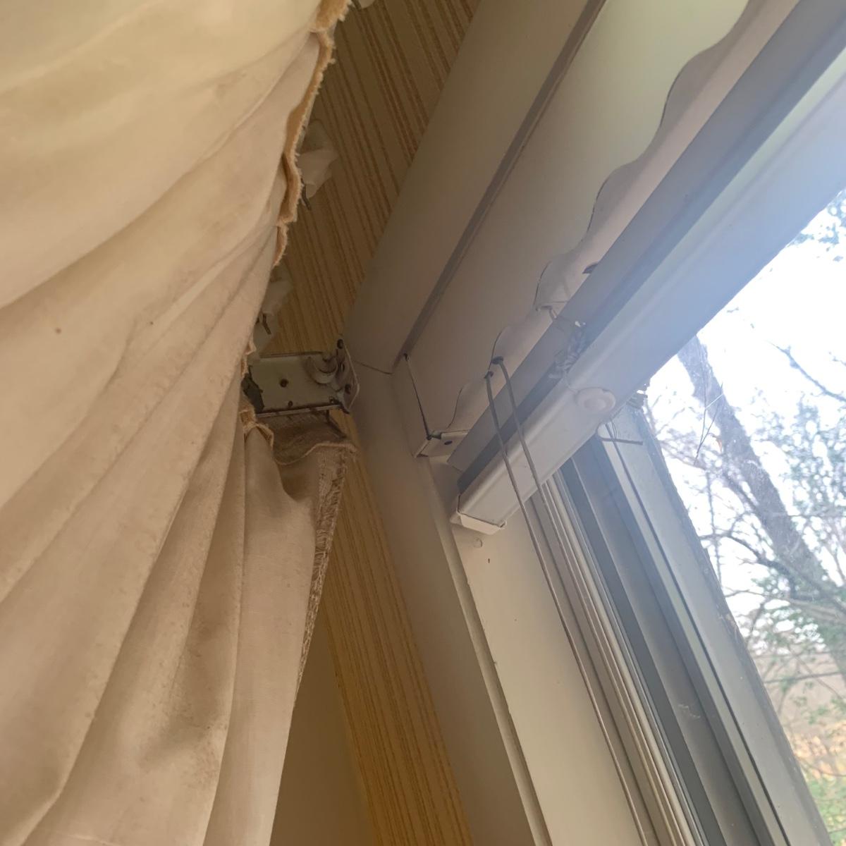 This lot contains three sets of short window curtains. Two of the sets are matching. These are a linen color with a woven pattern and have JC Penney tags. Each of these four panels measures approximately 42” x 44”H. They are currently on windows that are 41” x 38”H. One of the ropes used to open and close the panels is frayed; please see photos. It appears to be replaceable. There is a stain inside one of the curtains, not seen from the front.