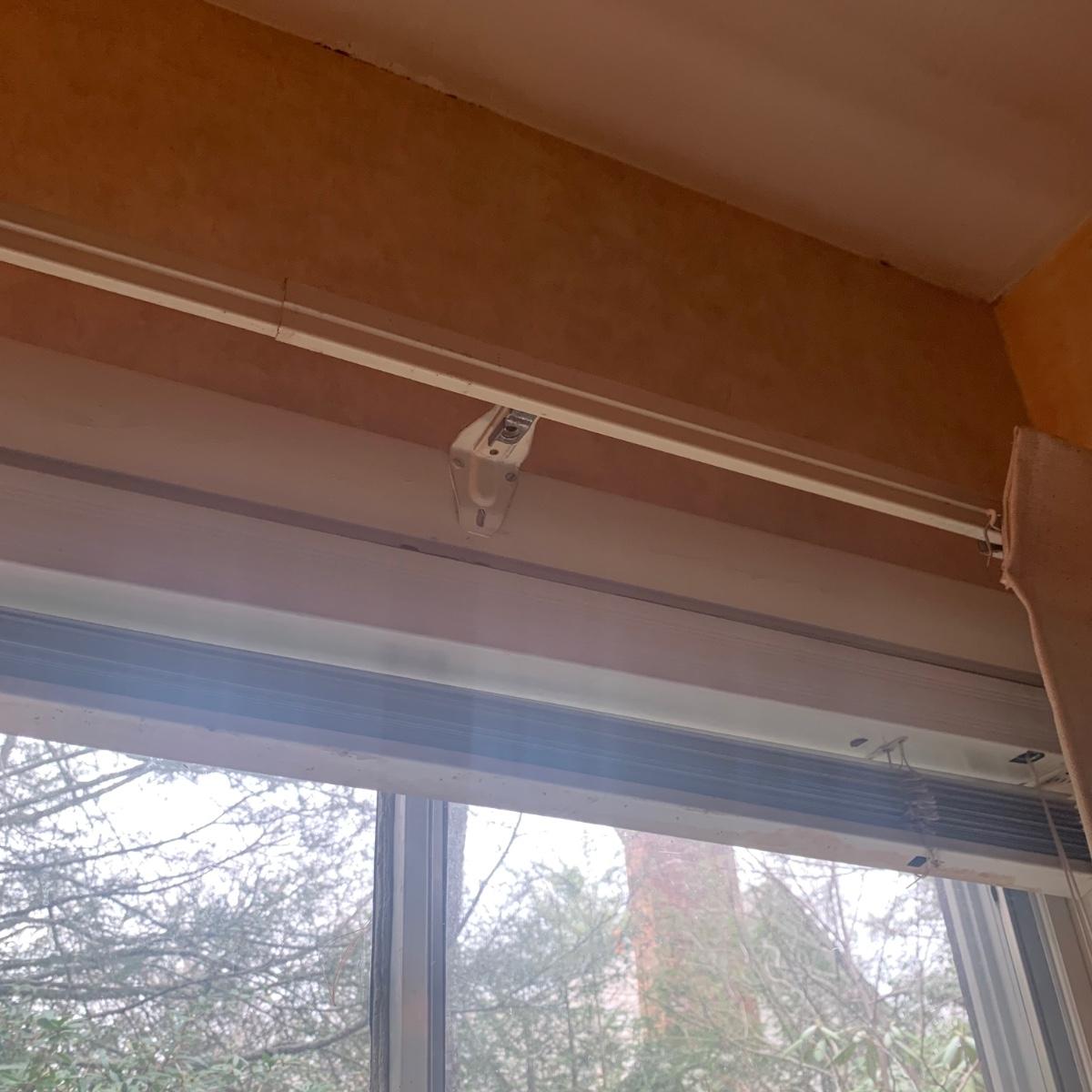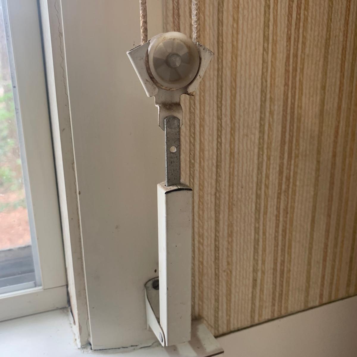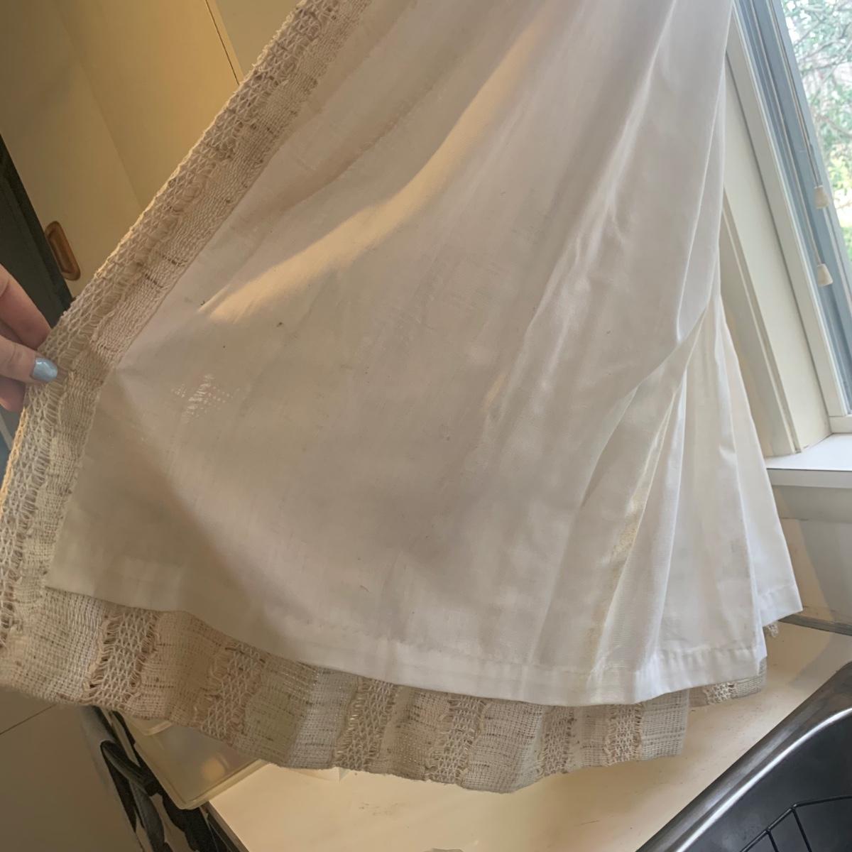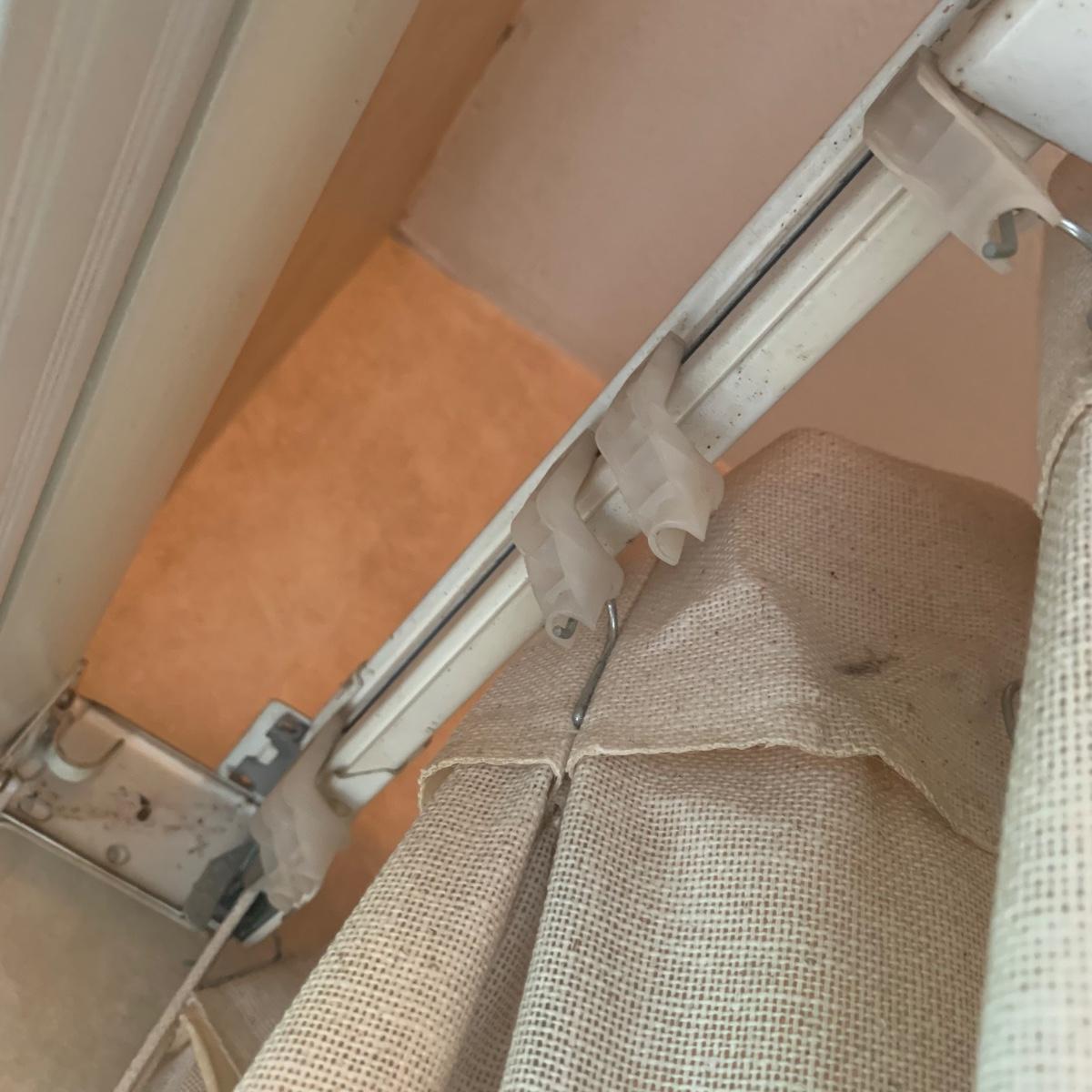This lot contains three sets of short window curtains. Two of the sets are matching. These are a linen color with a woven pattern and have JC Penney tags. Each of these four panels measures approximately 42” x 44”H. They are currently on windows that are 41” x 38”H. One of the ropes used to open and close the panels is frayed; please see photos. It appears to be replaceable. There is a stain inside one of the curtains, not seen from the front.