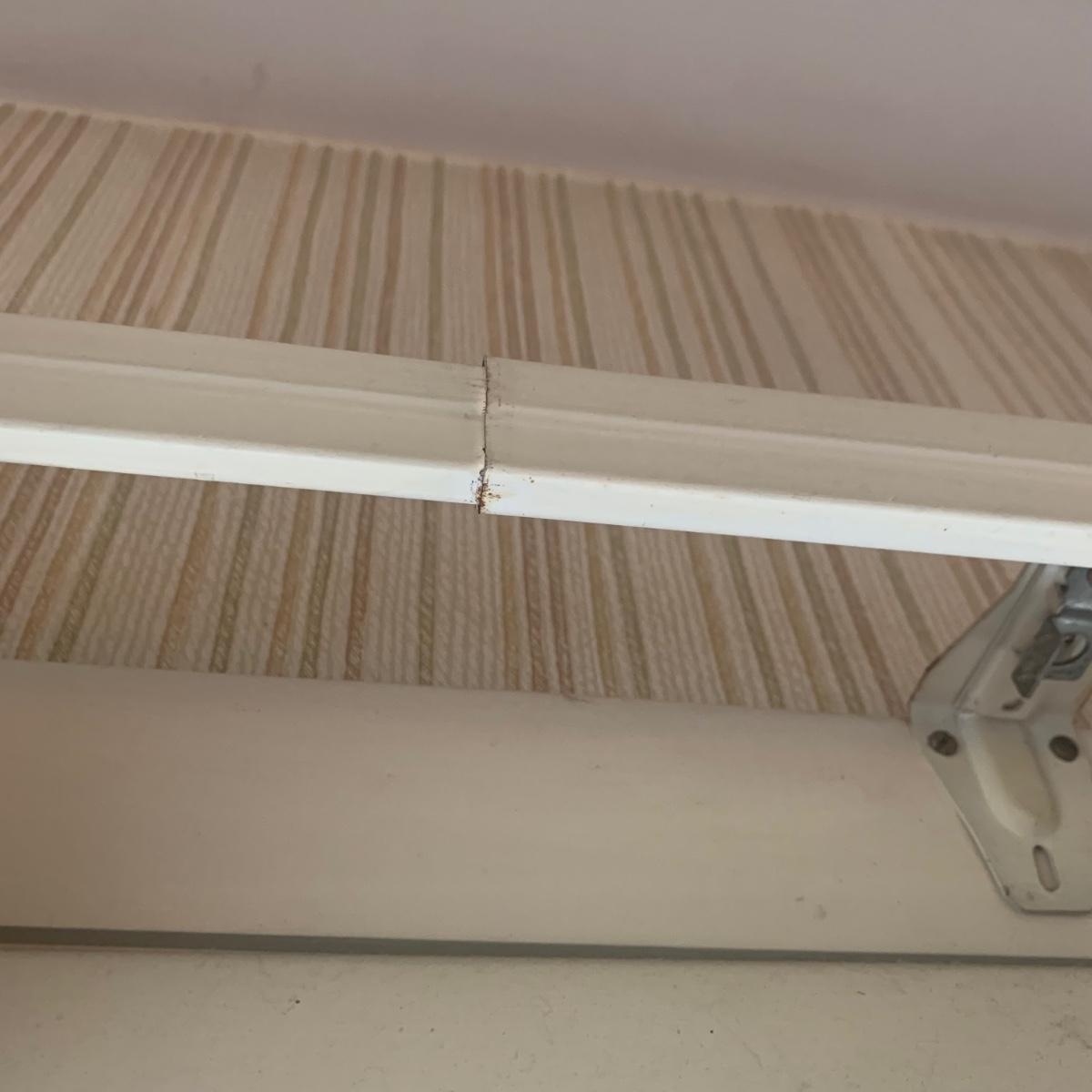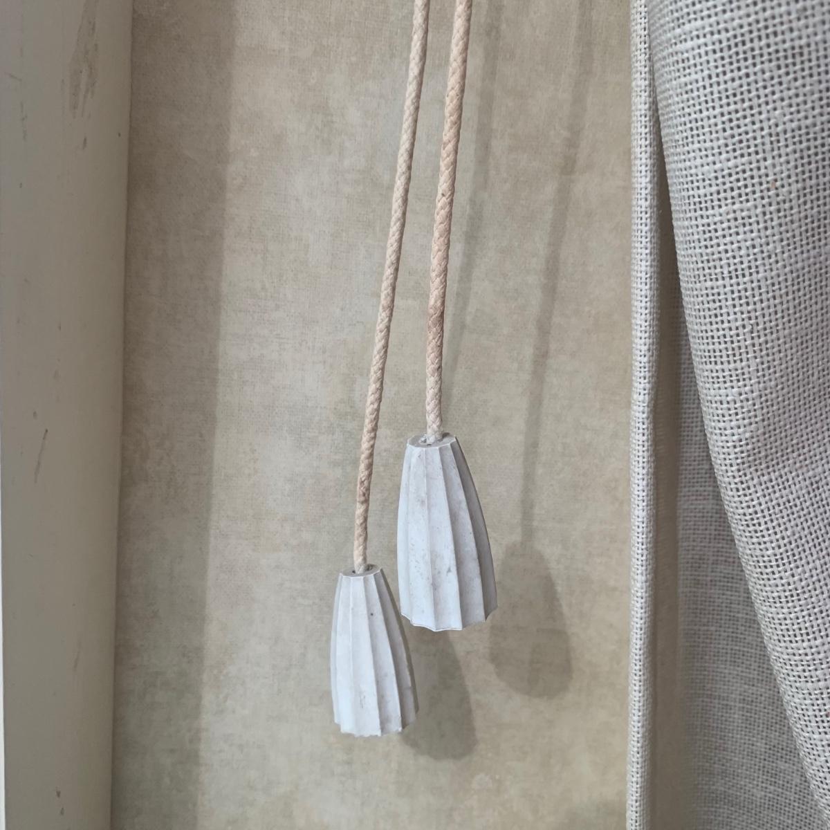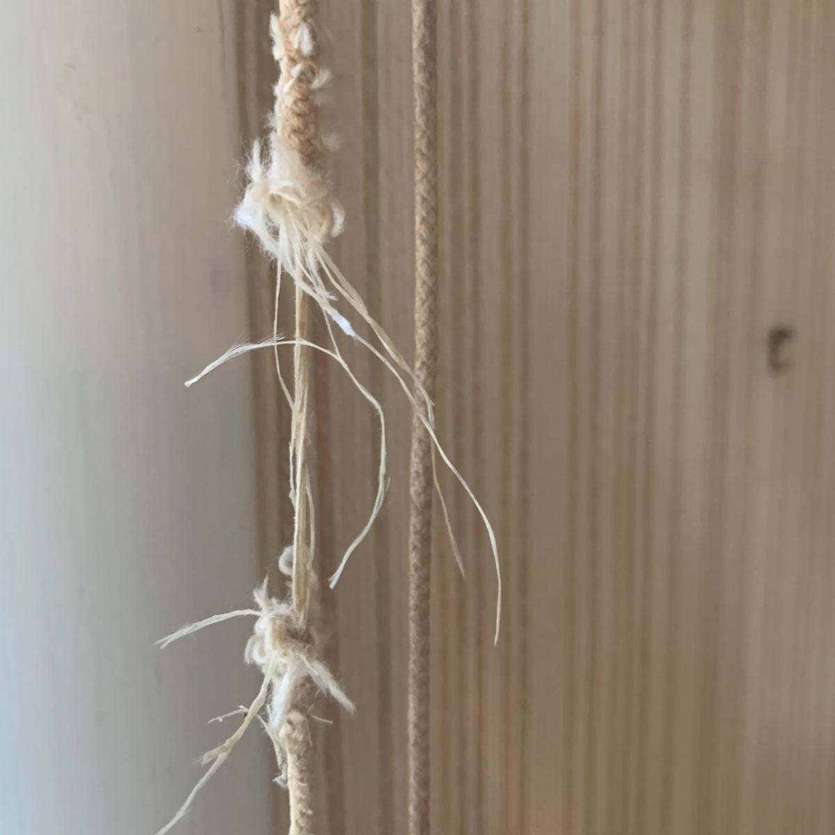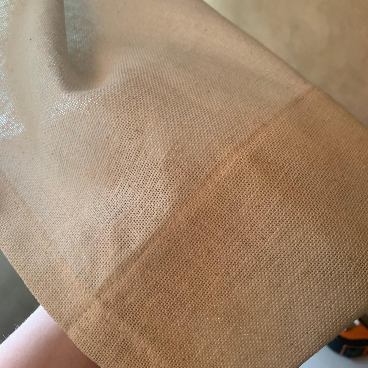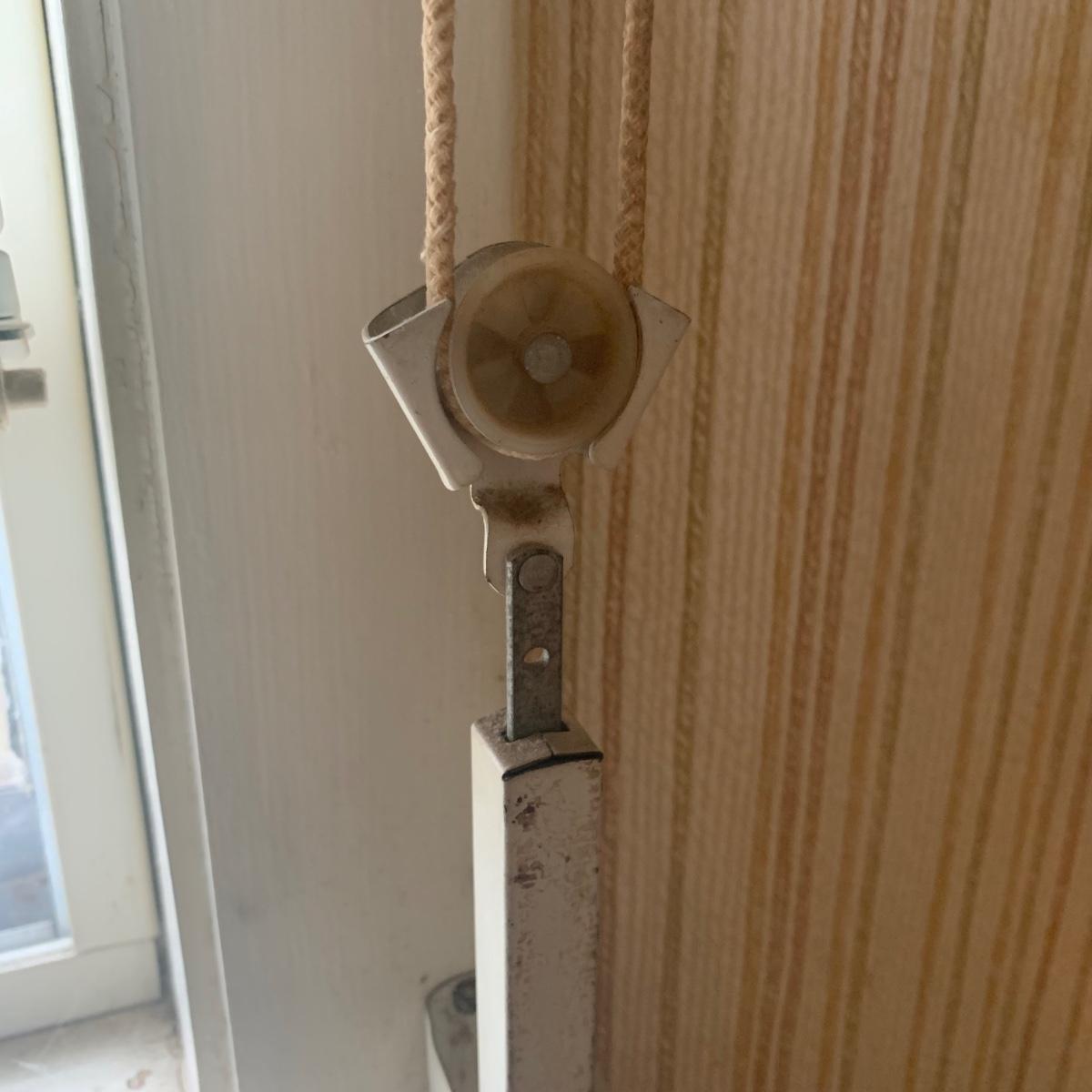 This lot contains three sets of short window curtains. Two of the sets are matching. These are a linen color with a woven pattern and have JC Penney tags. Each of these four panels measures approximately 42” x 44”H. They are currently on windows that are 41” x 38”H. One of the ropes used to open and close the panels is frayed; please see photos. It appears to be replaceable. There is a stain inside one of the curtains, not seen from the front.