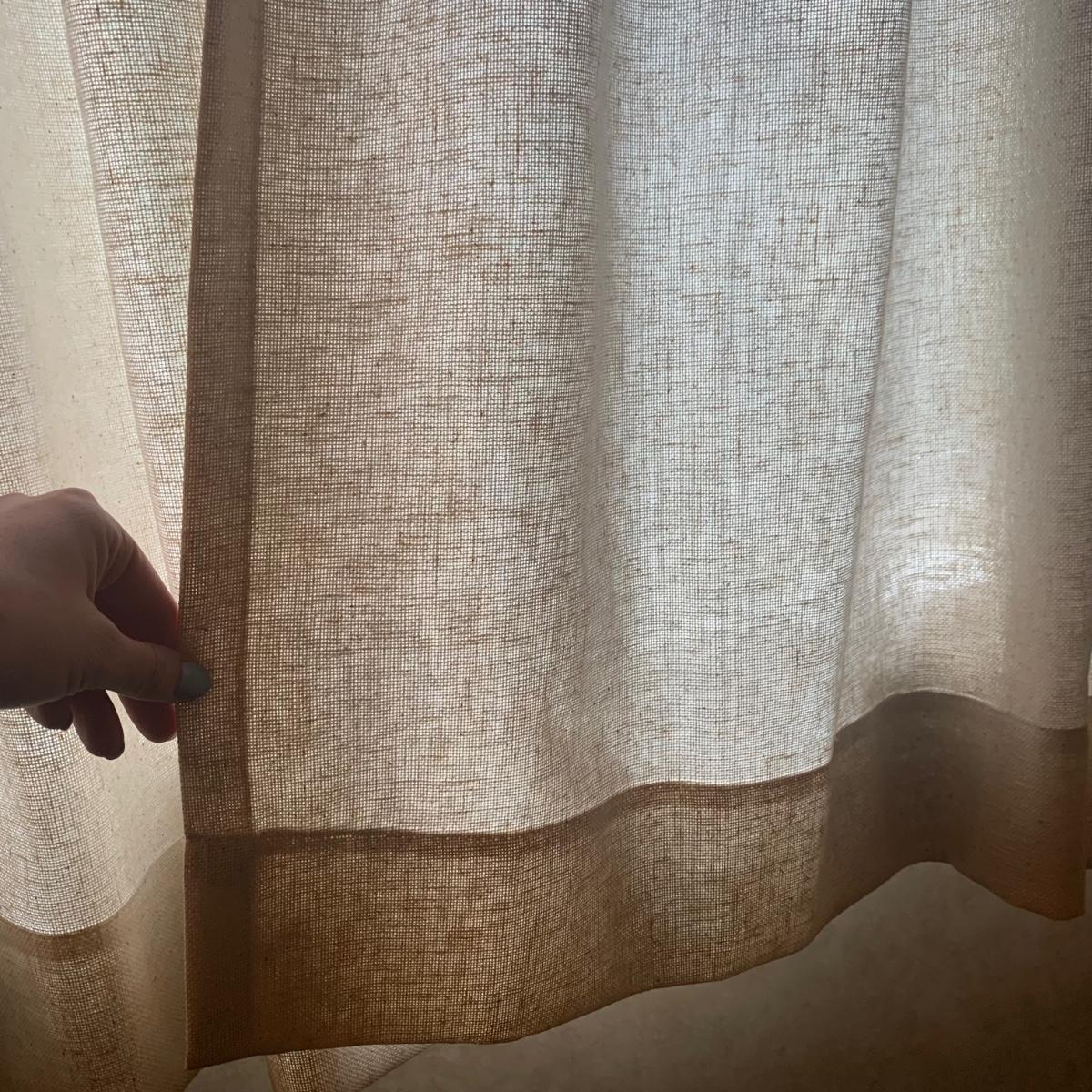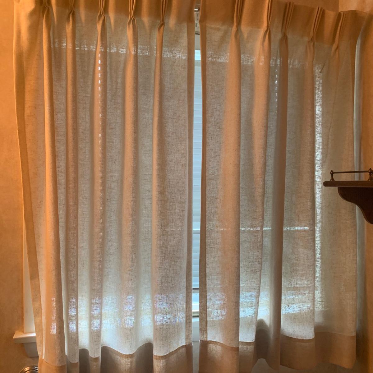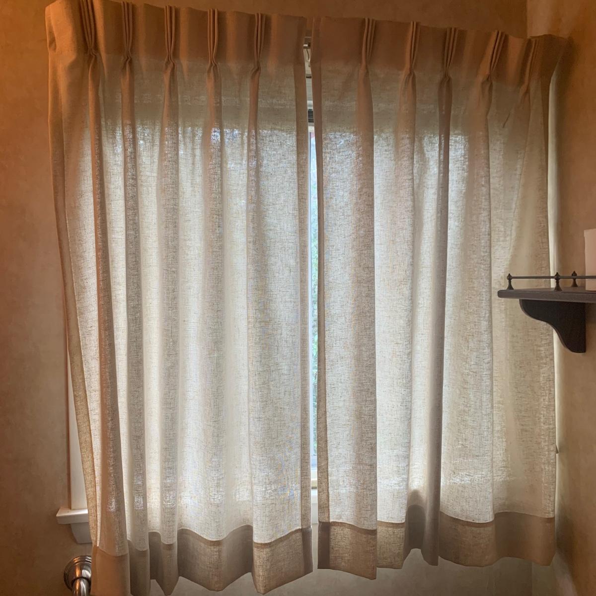 The third set is a similar linen color but does not have the woven patterning as the others; simply a natural weave. Each panel is approximately 40” x 44”H. This set is currently on a window that is 41” x 38”H.