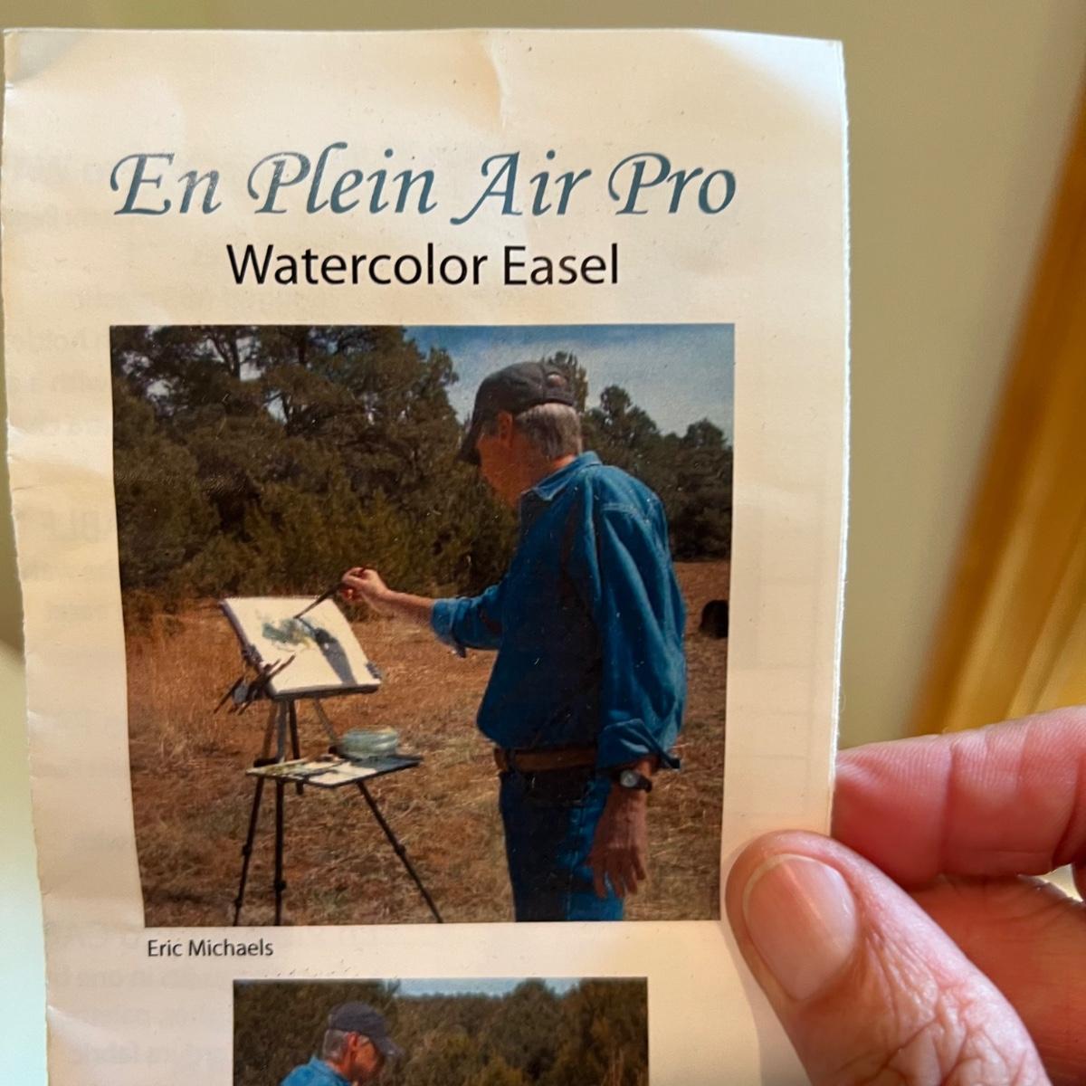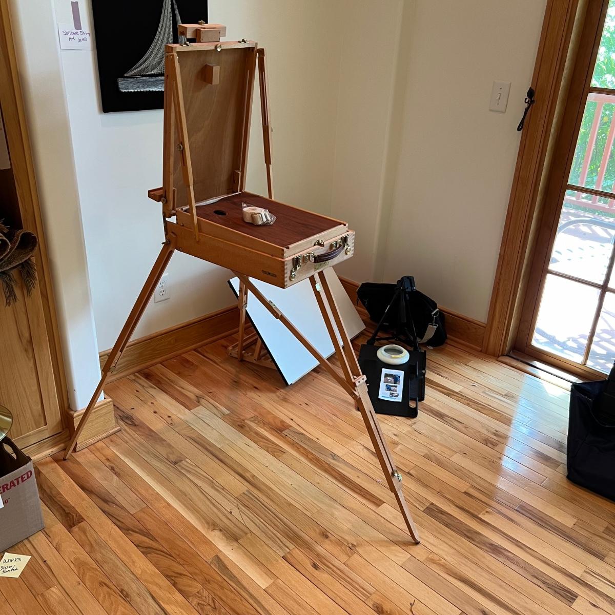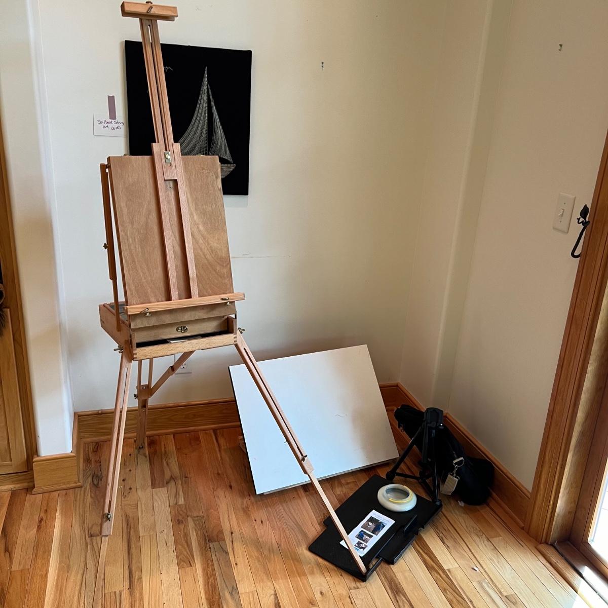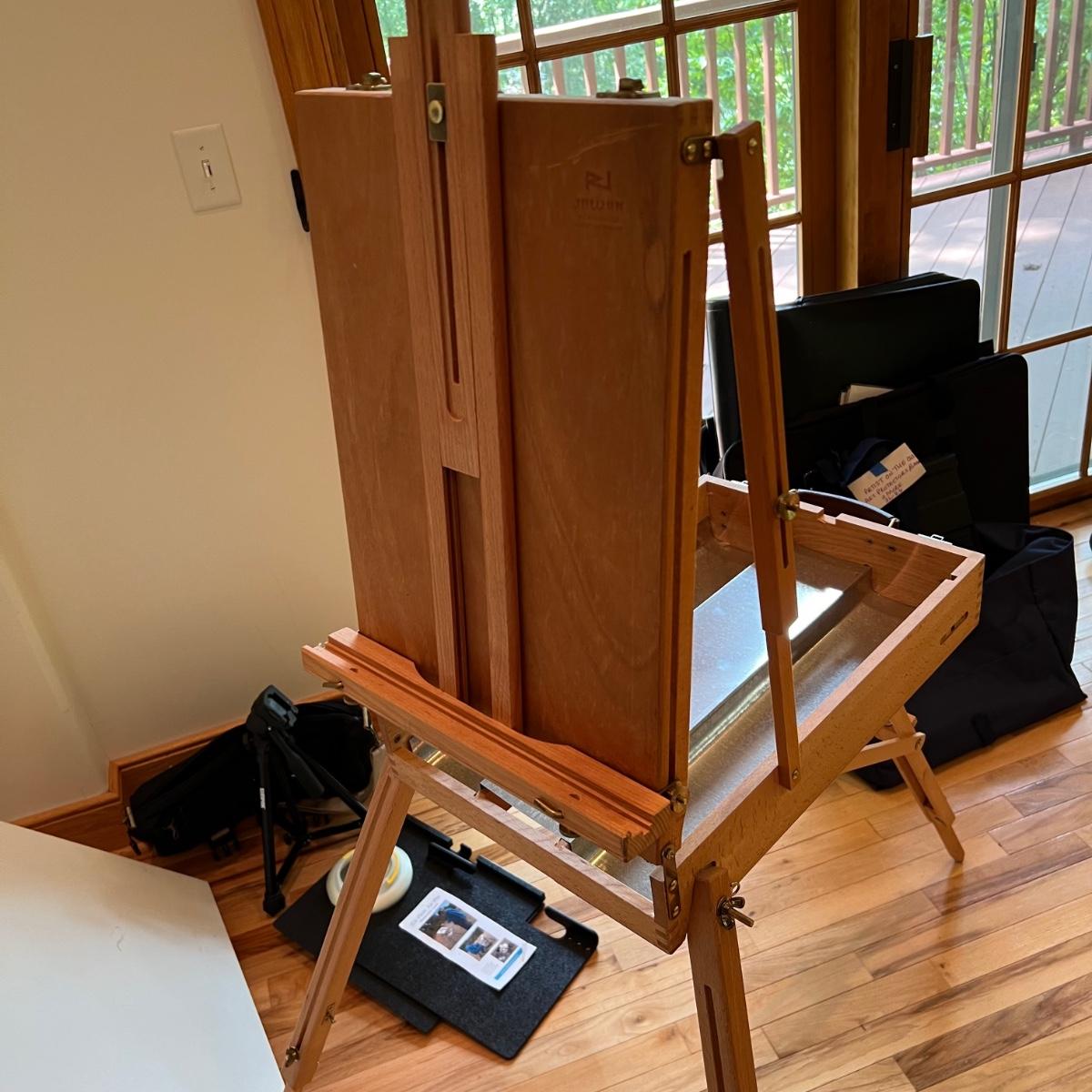 A total of three easels that are lightweight and fold up for easy mobility. The Jullian easel is wood, the white easel has a wood adjustable base and the En Plein Air Pro easel folds nicely into a small duffel style carrying bag.