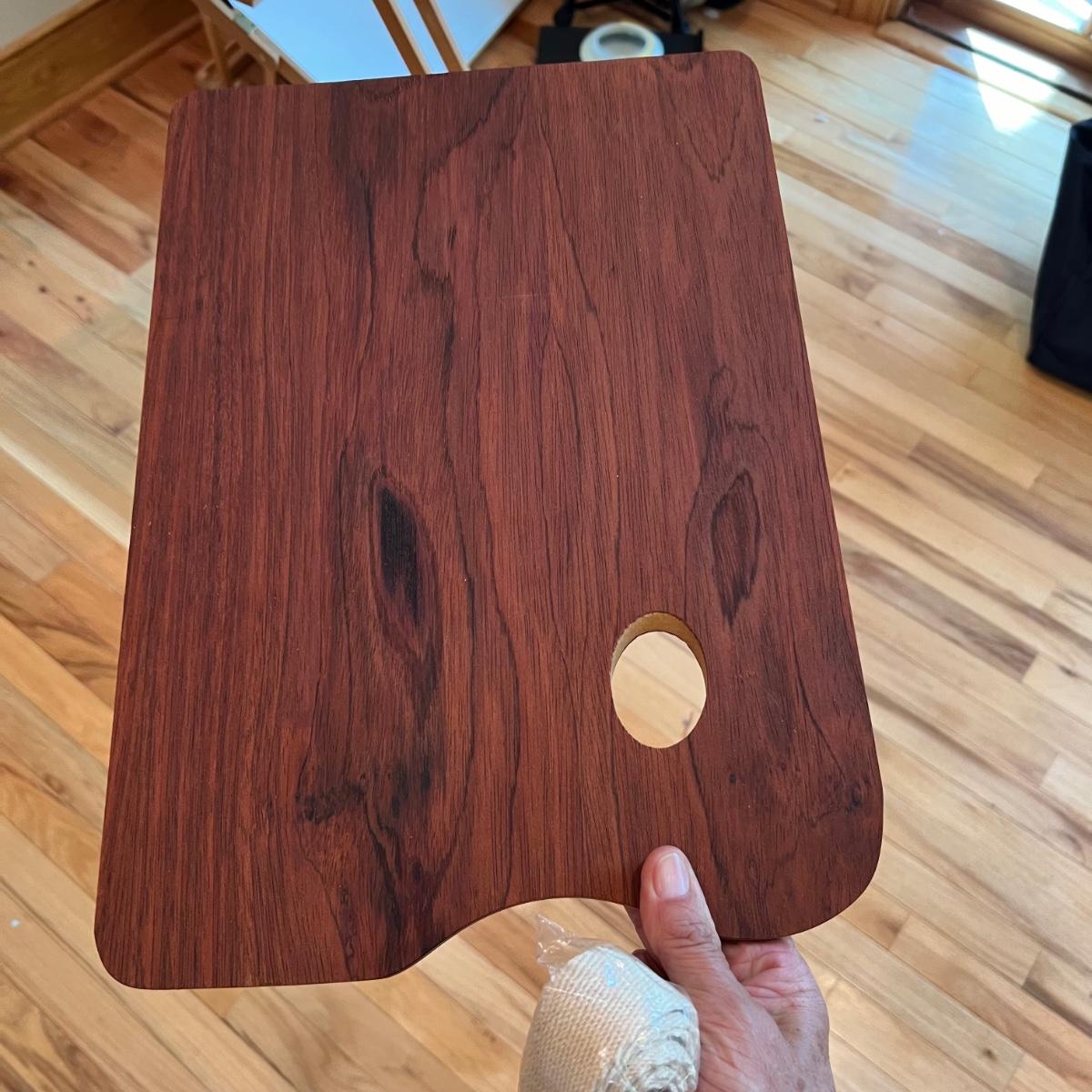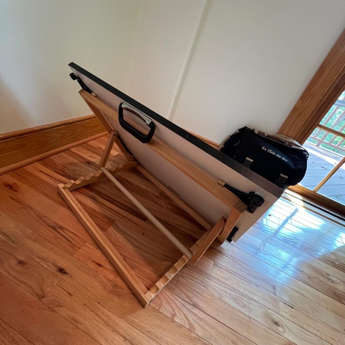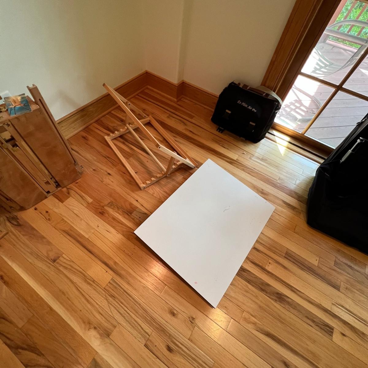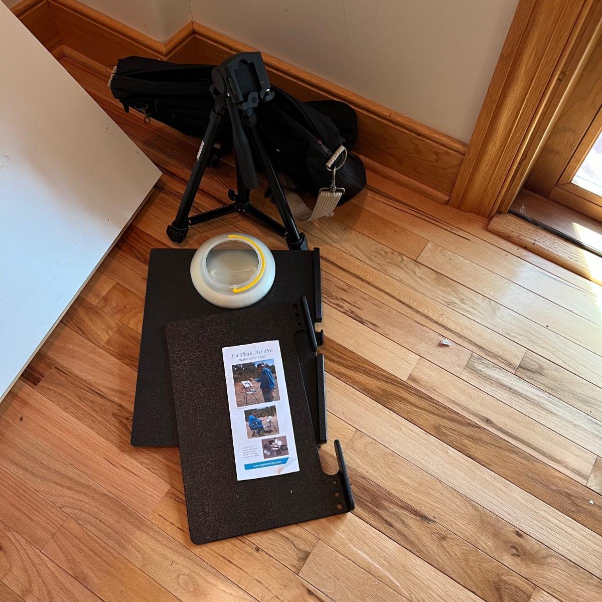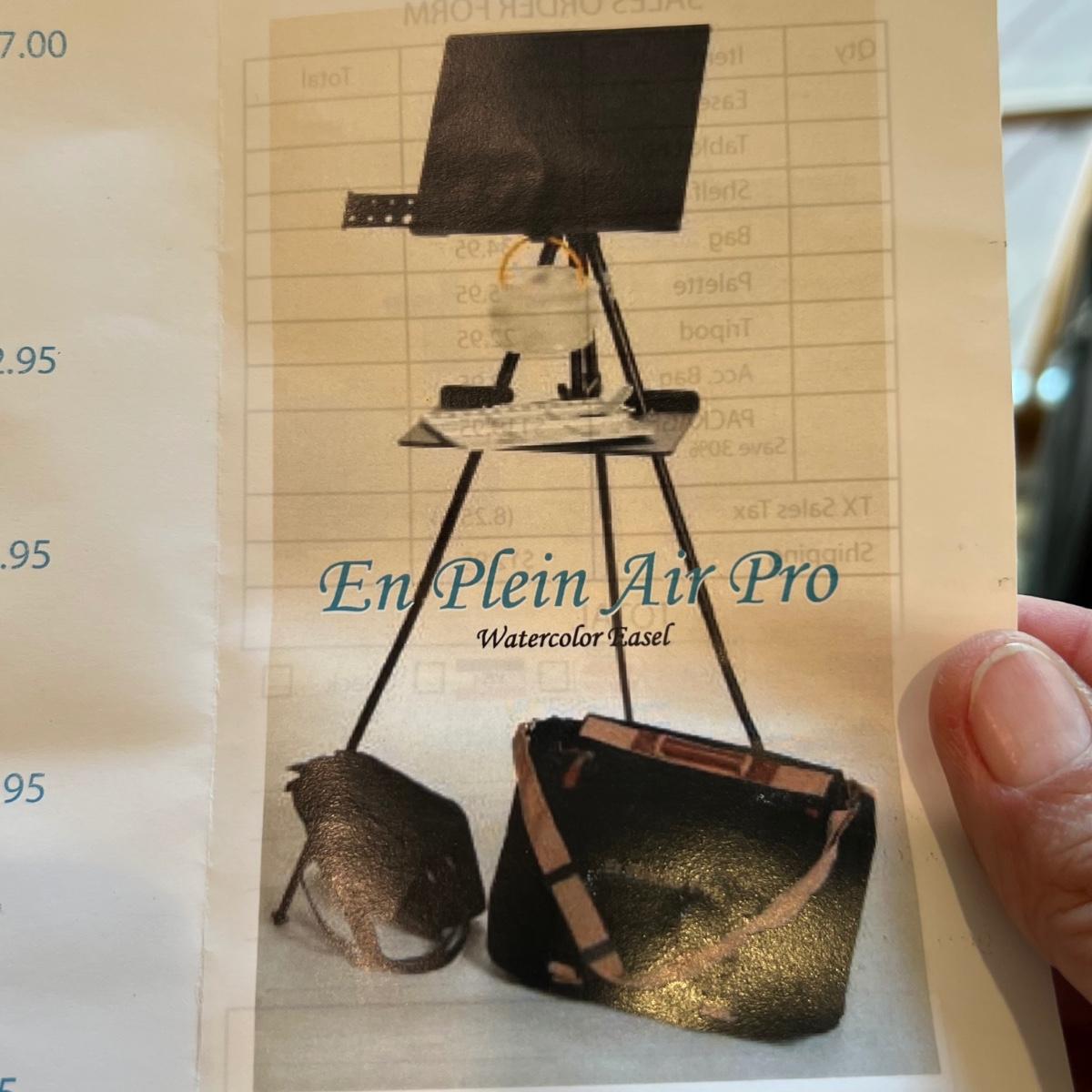 A total of three easels that are lightweight and fold up for easy mobility. The Jullian easel is wood, the white easel has a wood adjustable base and the En Plein Air Pro easel folds nicely into a small duffel style carrying bag.