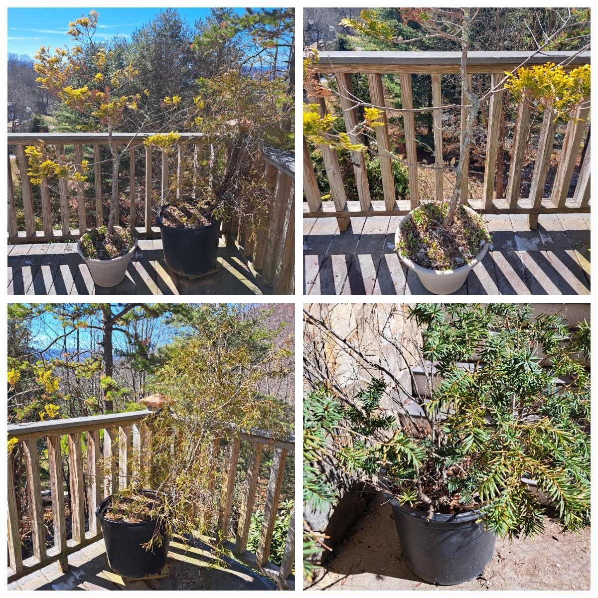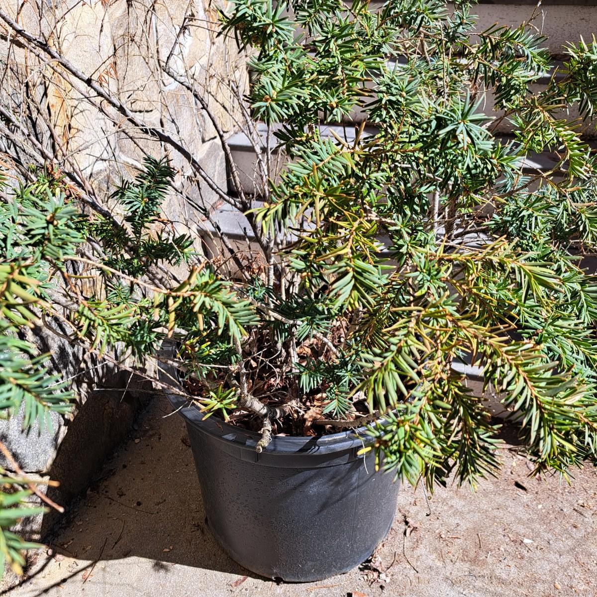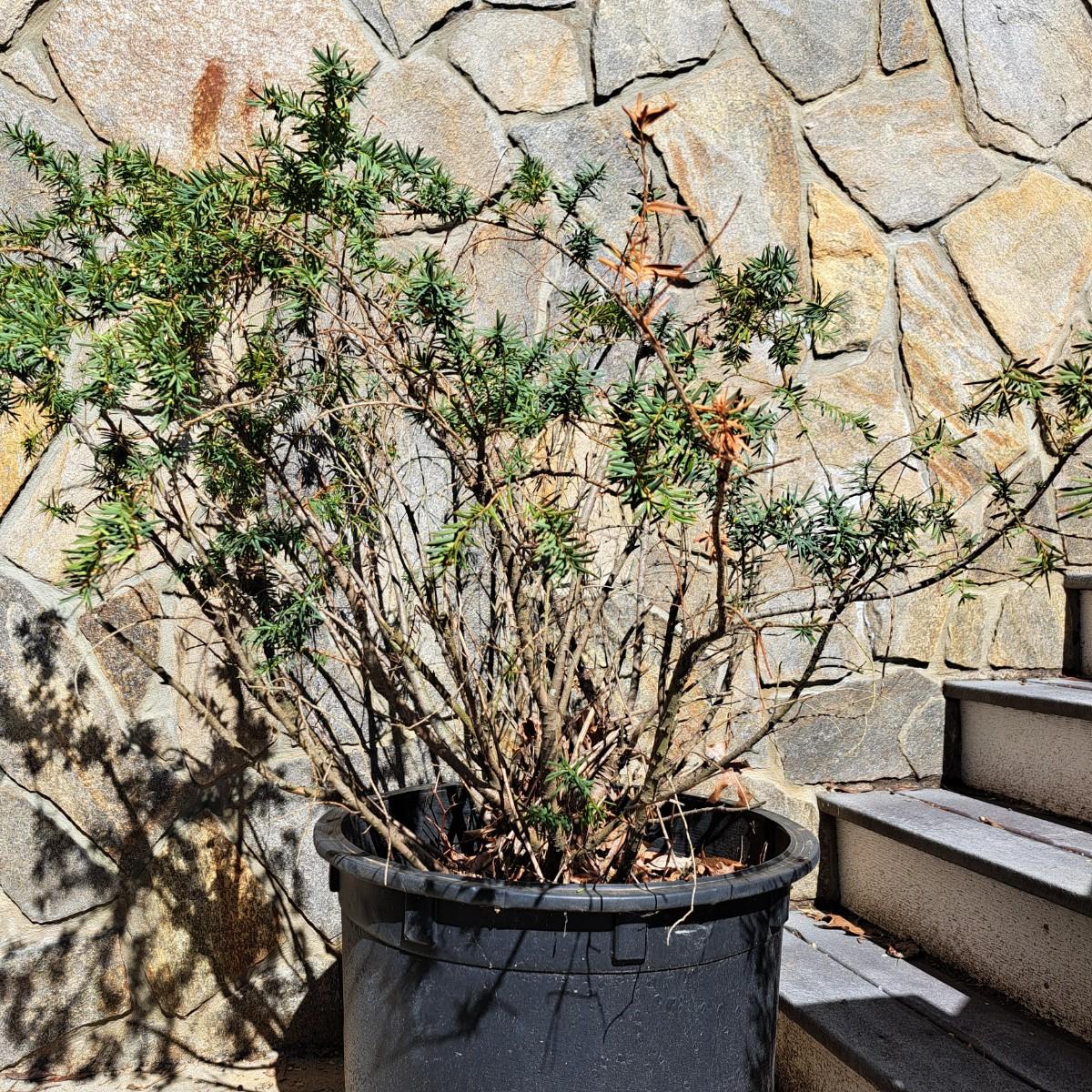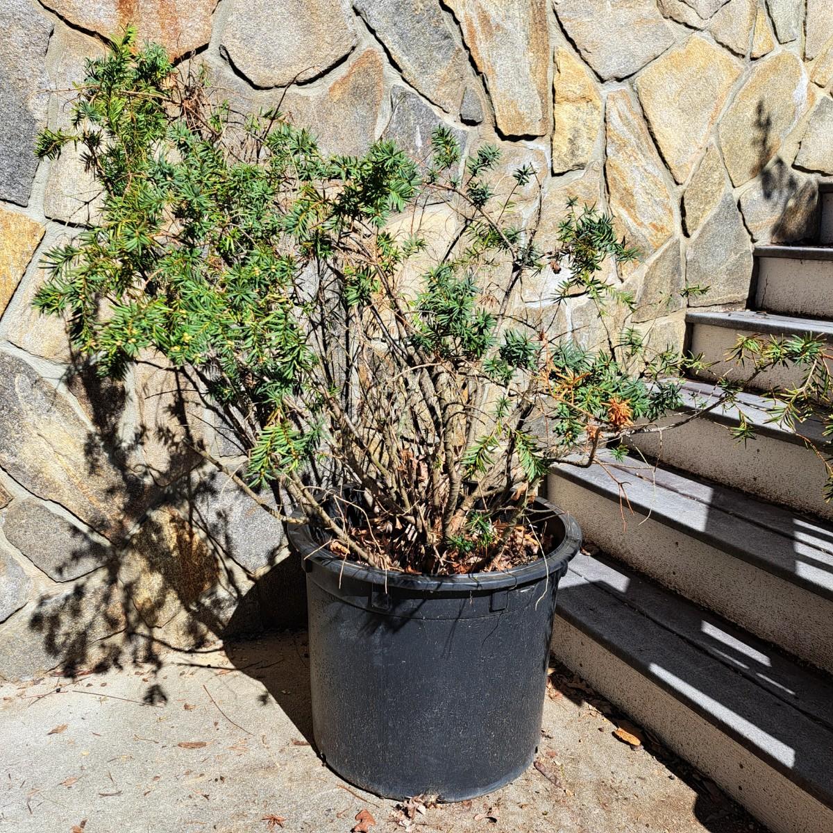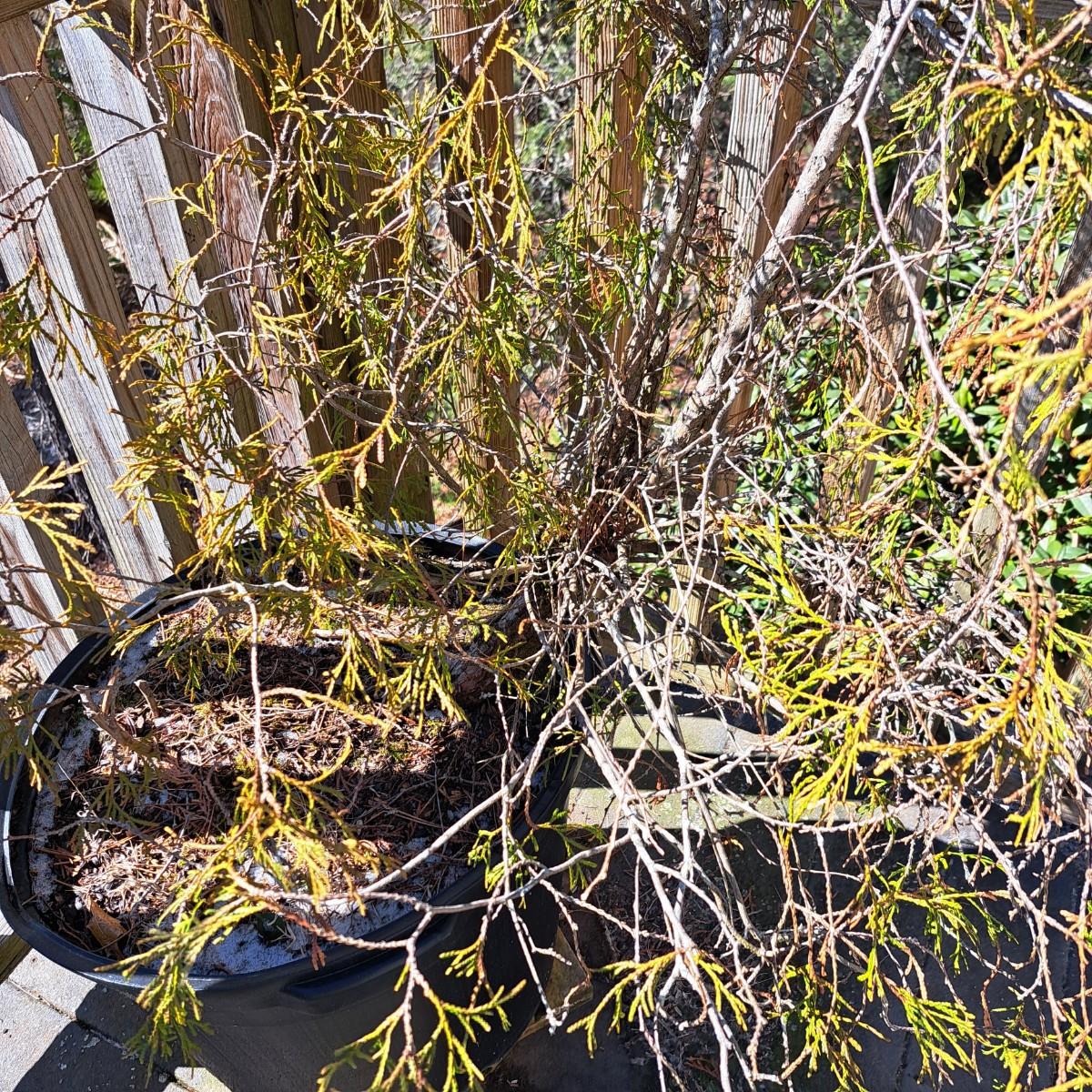 Three potted ornamental evergreens, a false gold cypress, a juniper and what appears to be a Japanese yew, all in plastic pots. Large false gold cypress in the light colored pot is 57"H with a branch width of 46." The juniper tree in the black pot on a wooden rolling stand is 63"H with a branch width of 30." The Japanese yew is 52"H with a 52" branch width. All appear to be mature and healthy, although the yew has a few dead branches, otherwise it appears to be very healthy with some new growth. Local pickup only.