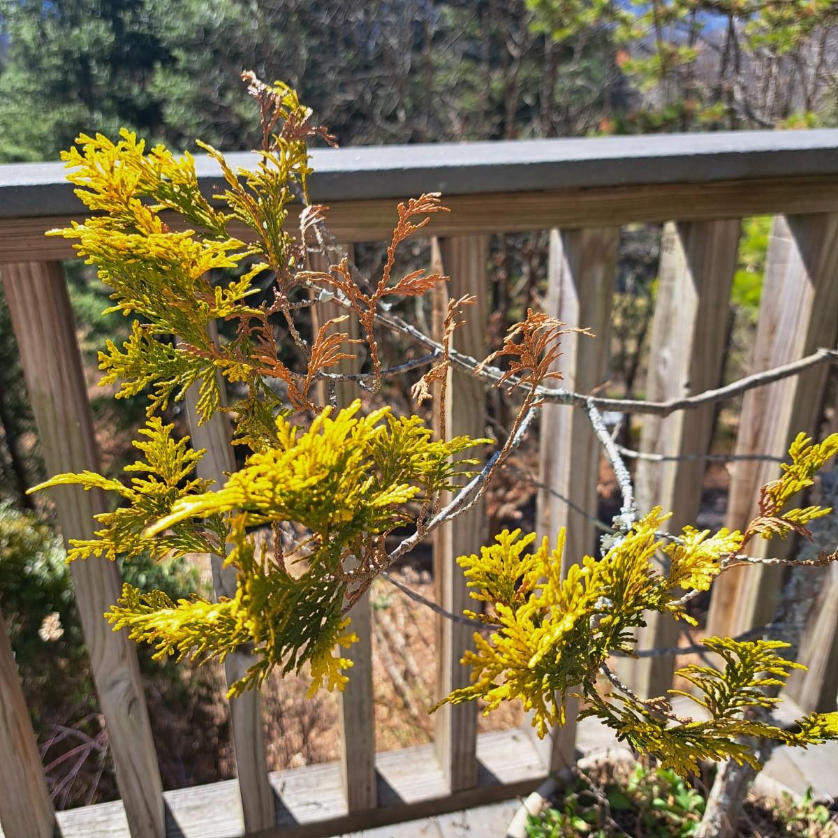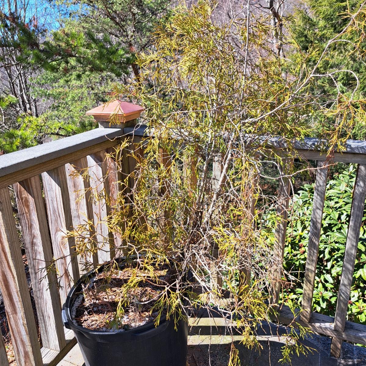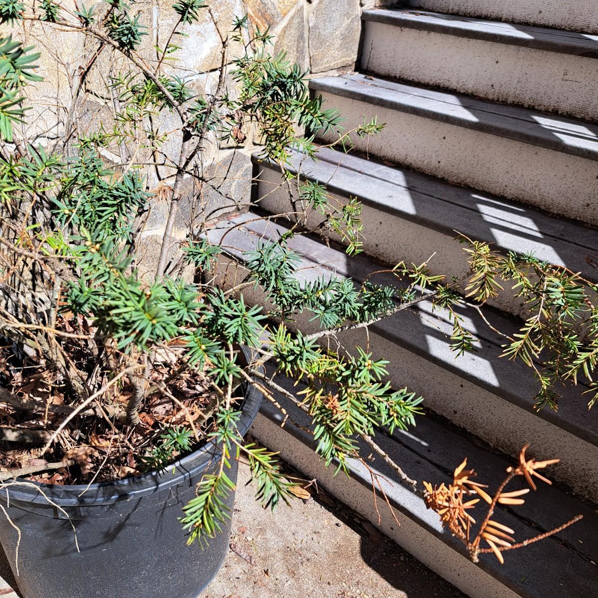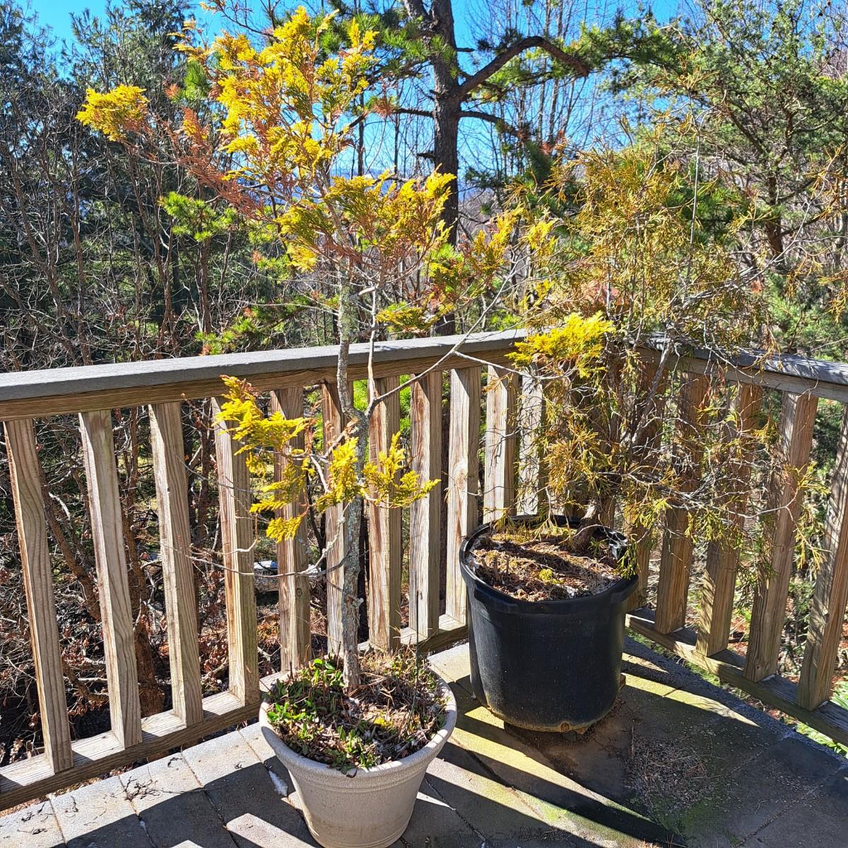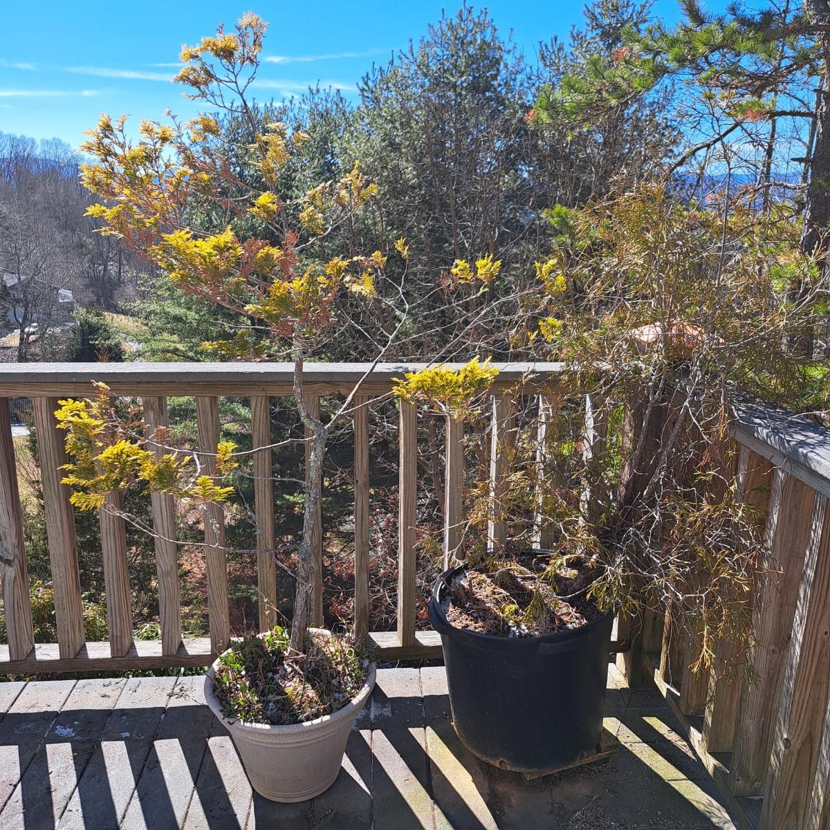 Three potted ornamental evergreens, a false gold cypress, a juniper and what appears to be a Japanese yew, all in plastic pots. Large false gold cypress in the light colored pot is 57"H with a branch width of 46." The juniper tree in the black pot on a wooden rolling stand is 63"H with a branch width of 30." The Japanese yew is 52"H with a 52" branch width. All appear to be mature and healthy, although the yew has a few dead branches, otherwise it appears to be very healthy with some new growth. Local pickup only.