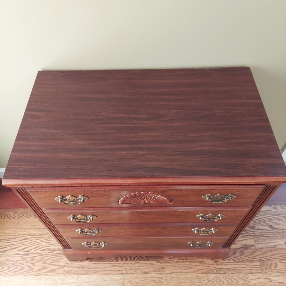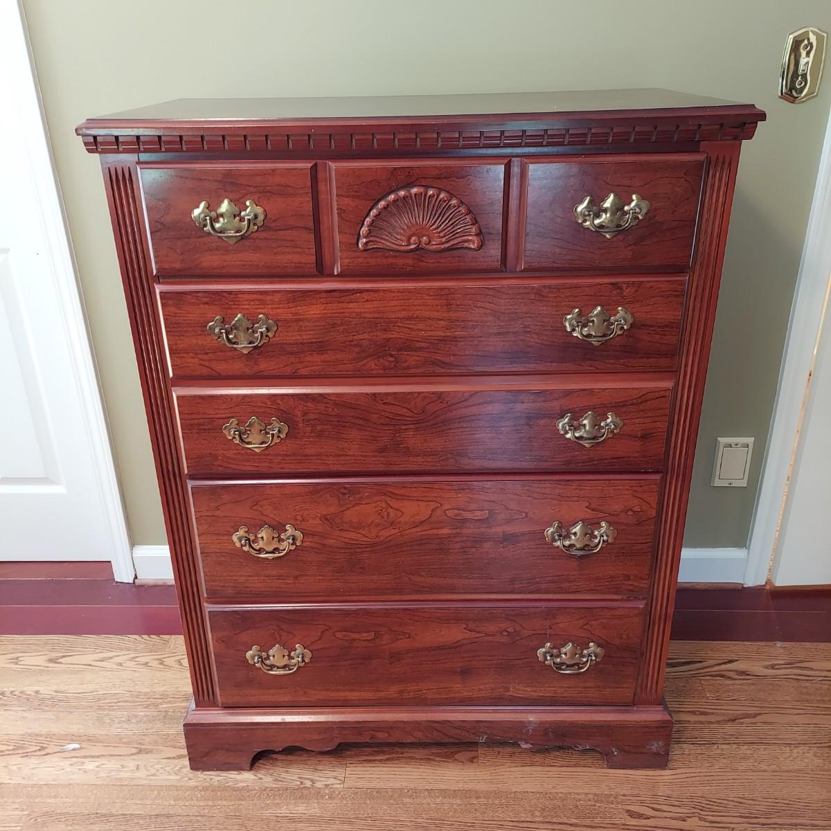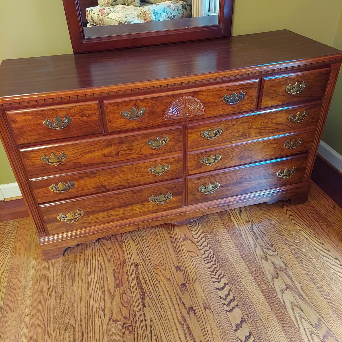 Three Queen Anne style dressers, by Lea The Bedroom People. The small three drawer dresser is 30" x 18" x 31.5"H. The tall four drawer chest of drawers is 34" x 18" x 45"H. The large dresser with mirror has seven drawers. The dresser is 54" x 18" x 31.5"H. The mirror is 30" x 50"H. The mirror is removable. Please see pictures of hardware. These are part of a matching set with the other pieces for sale in another lot. Local Pickup Only. Winning bidder must bring assistance to help move and load this item due to its weight and/or size.