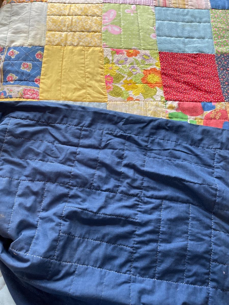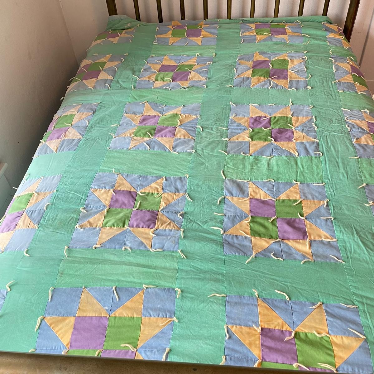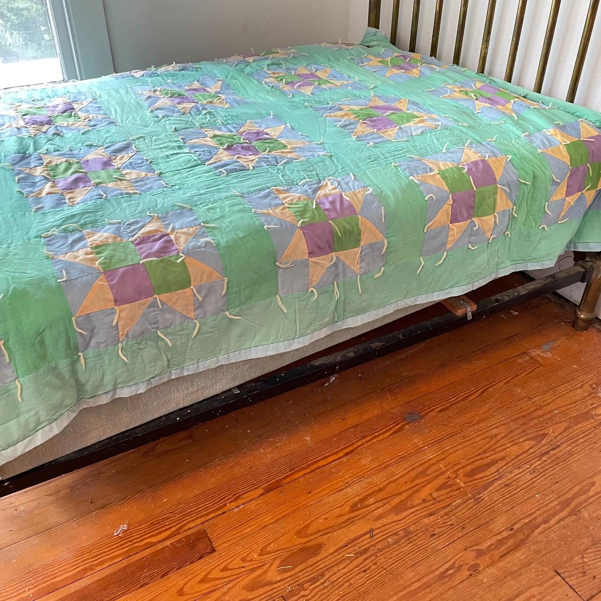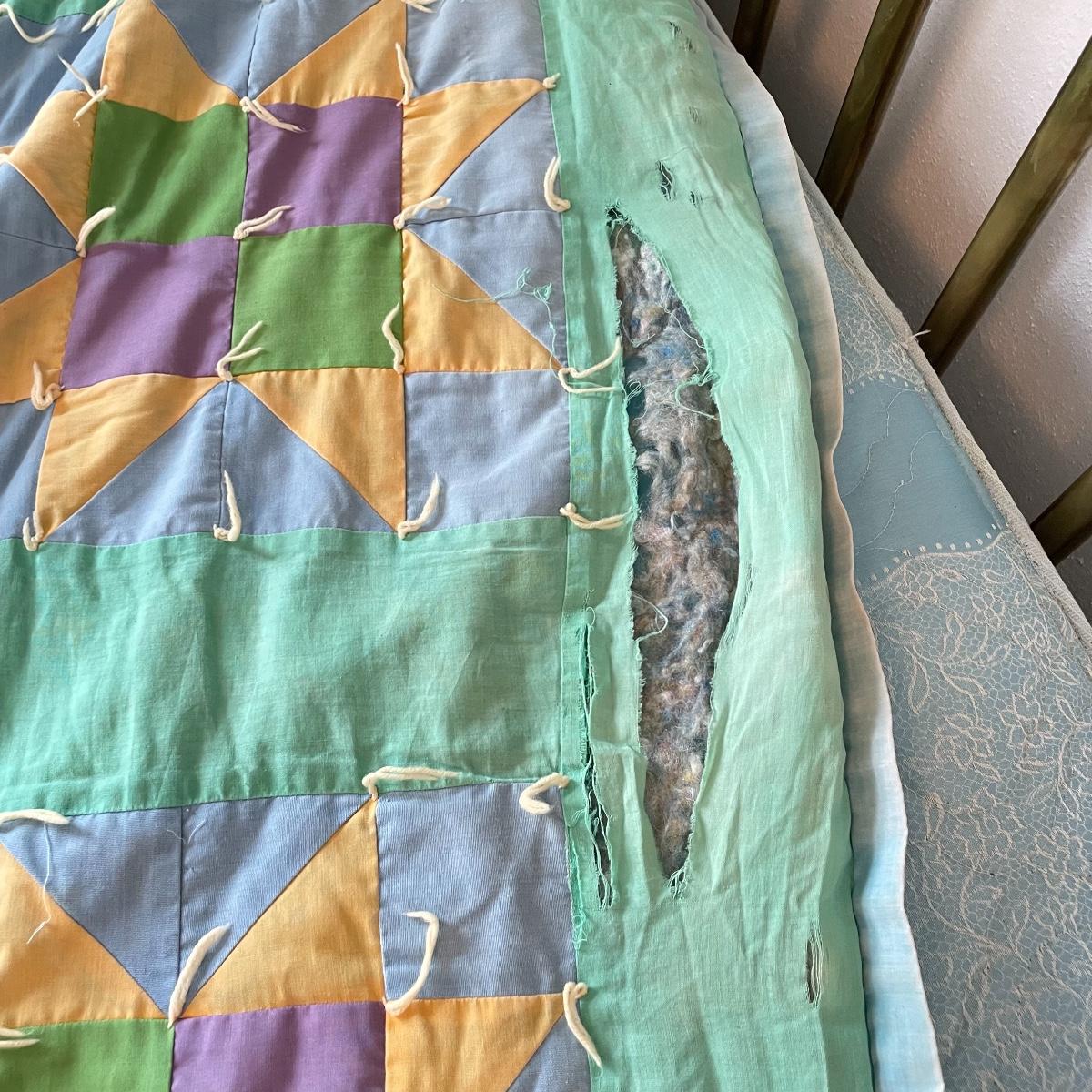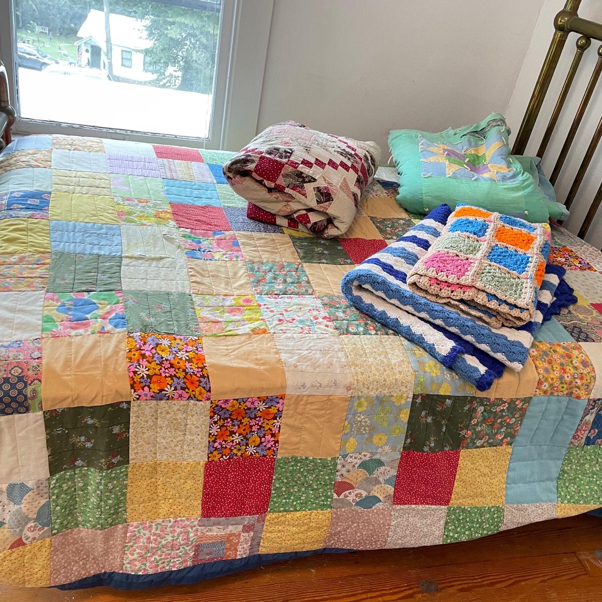 All photos are taken on a full sized bed (53”wide). Two of the three quilts will nicely cover a queen sized bed. The sea foam green quilt is slightly smaller. The latter two quilts have rips shown in photos. All quilts and blankets will need to be cleaned before use. See images. Local pick up only.