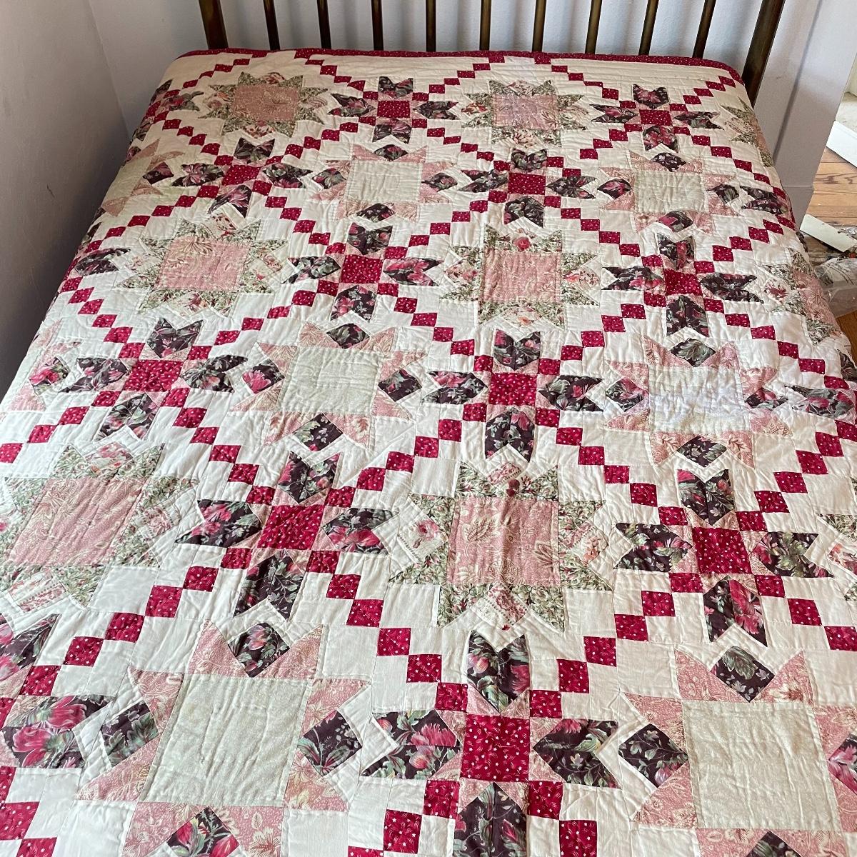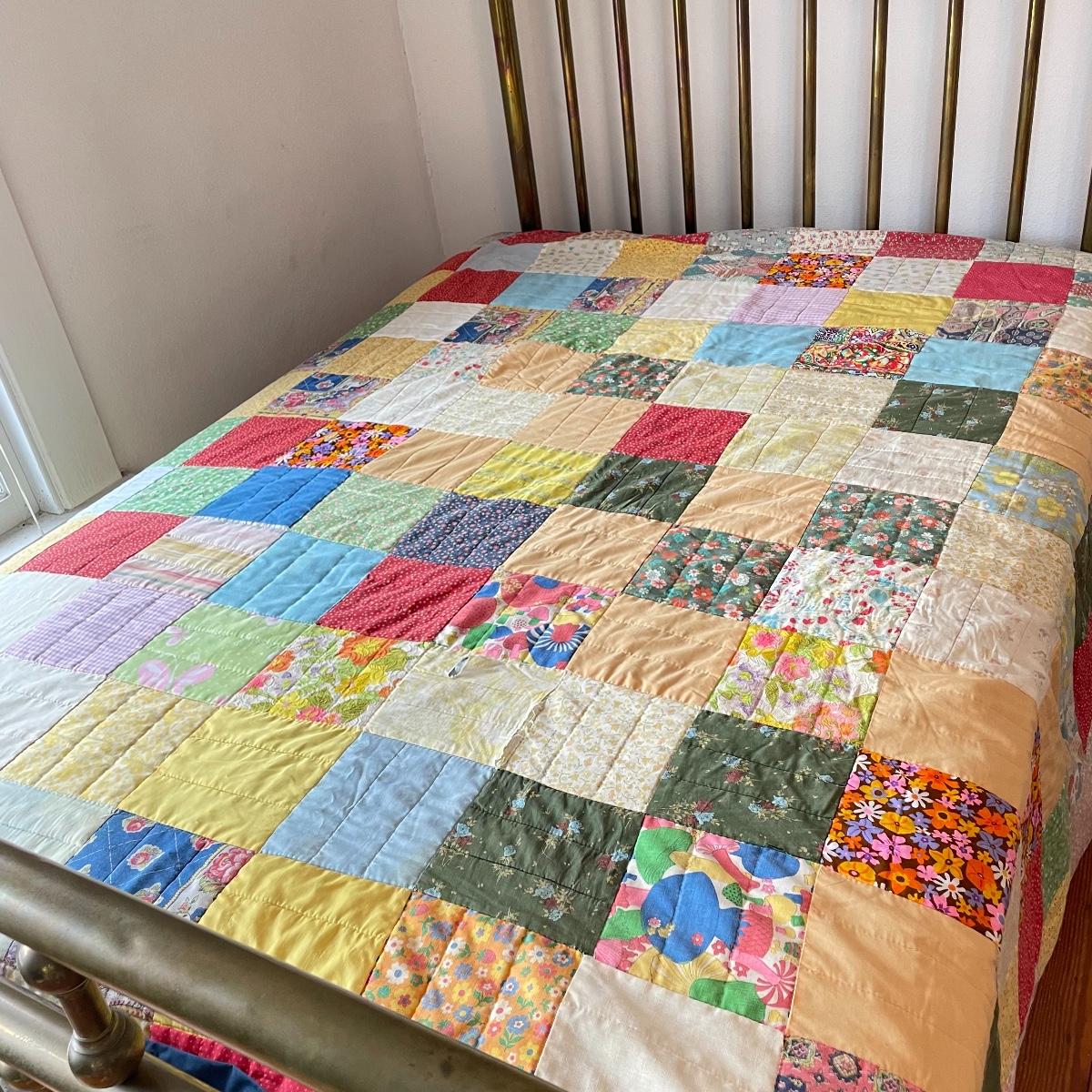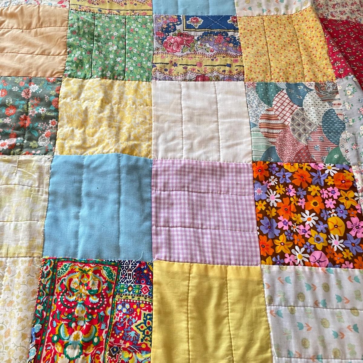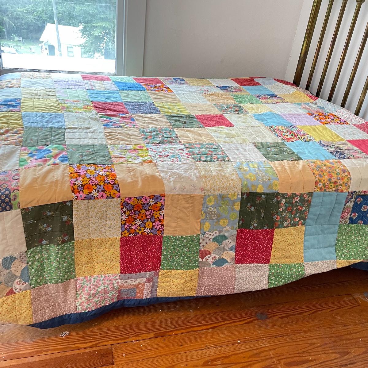 All photos are taken on a full sized bed (53”wide). Two of the three quilts will nicely cover a queen sized bed. The sea foam green quilt is slightly smaller. The latter two quilts have rips shown in photos. All quilts and blankets will need to be cleaned before use. See images. Local pick up only.