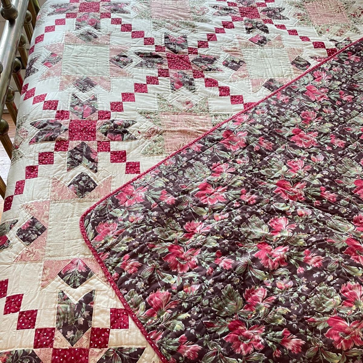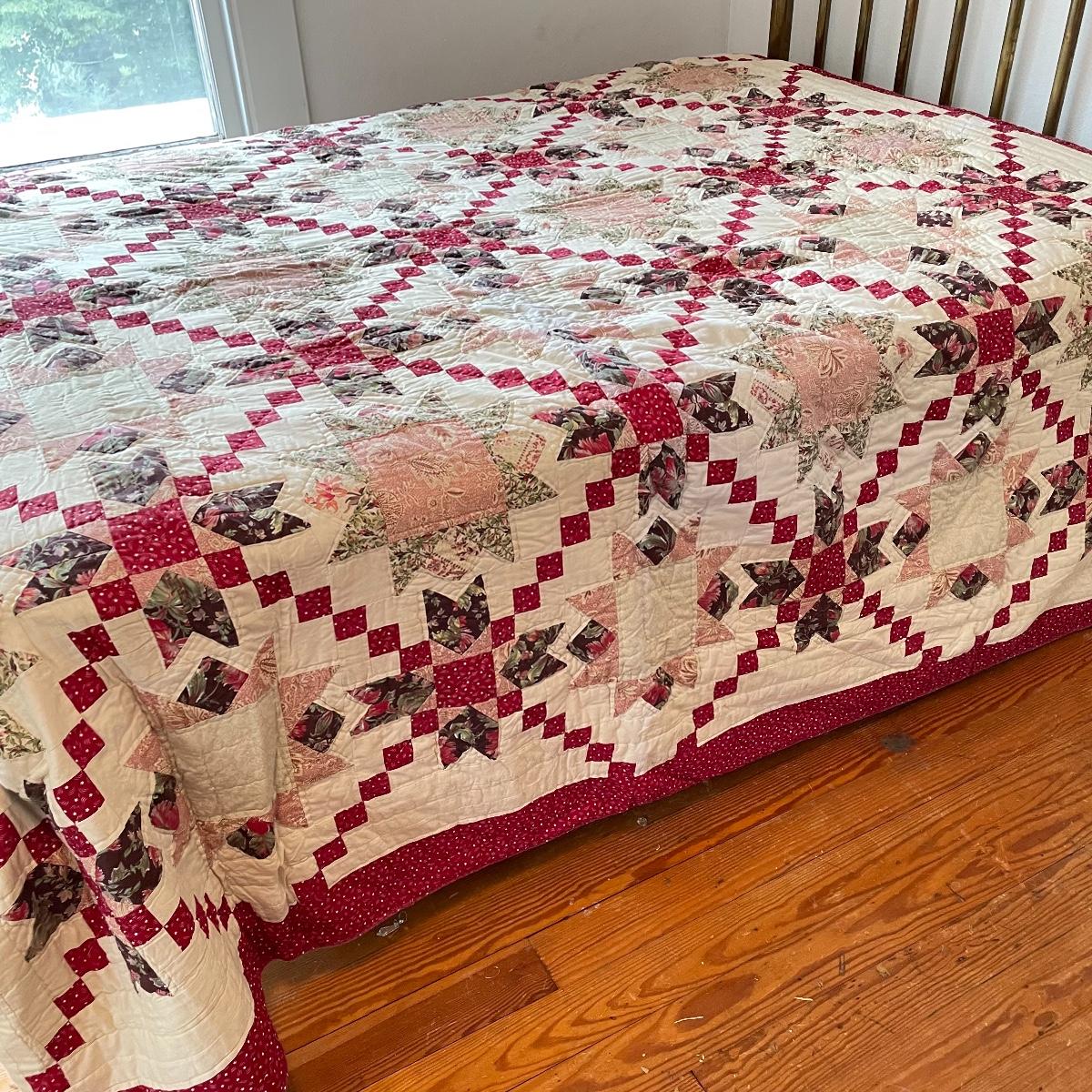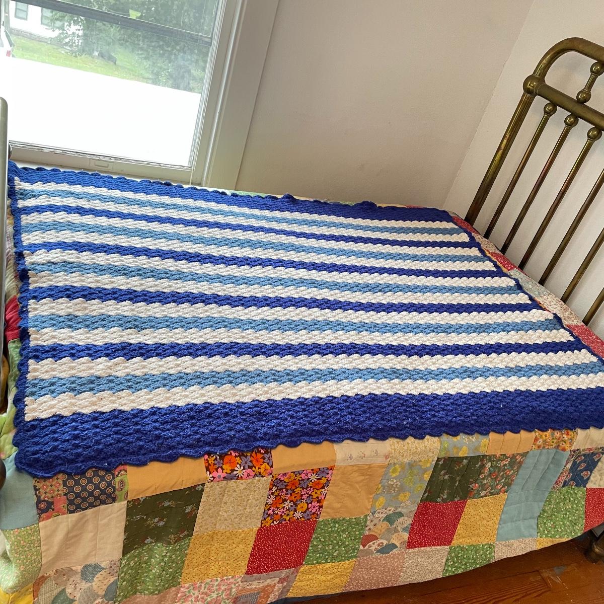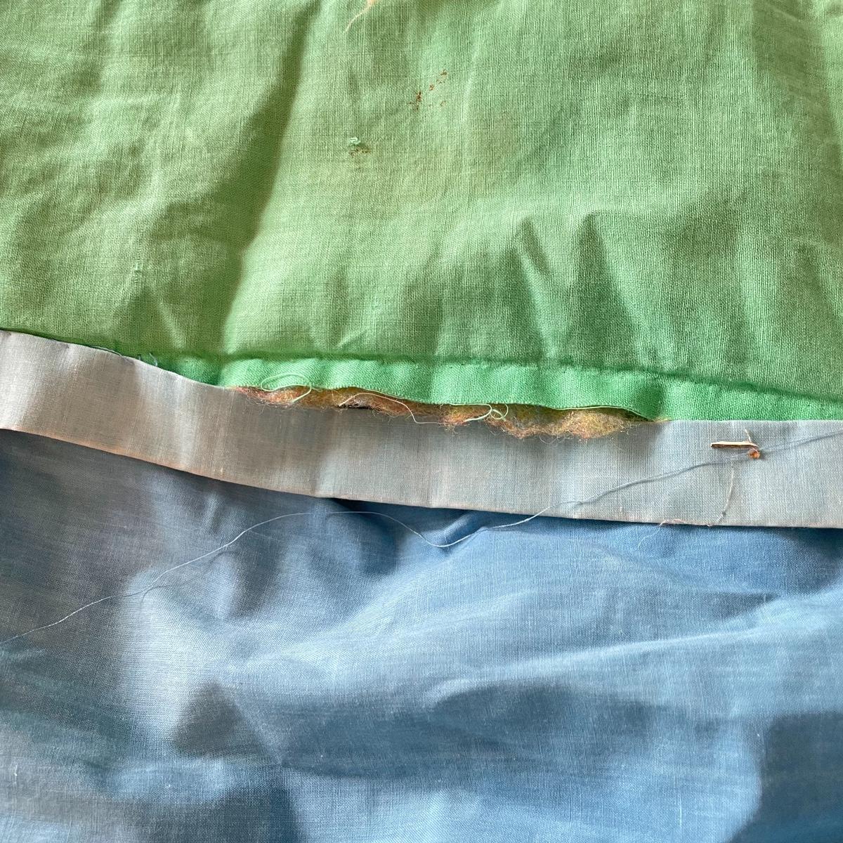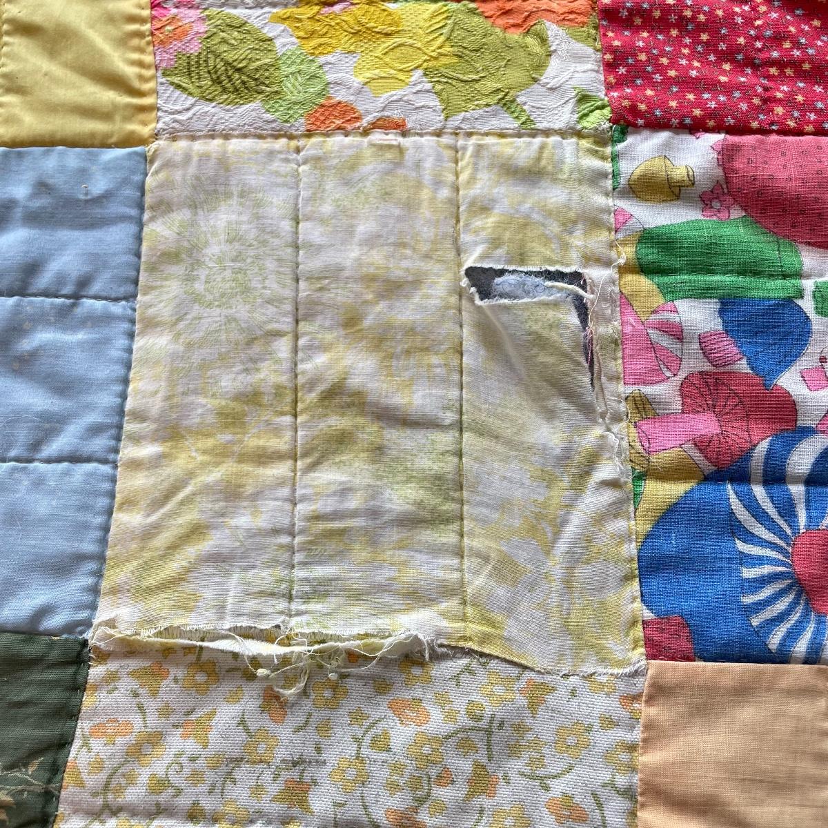 All photos are taken on a full sized bed (53”wide). Two of the three quilts will nicely cover a queen sized bed. The sea foam green quilt is slightly smaller. The latter two quilts have rips shown in photos. All quilts and blankets will need to be cleaned before use. See images. Local pick up only.
