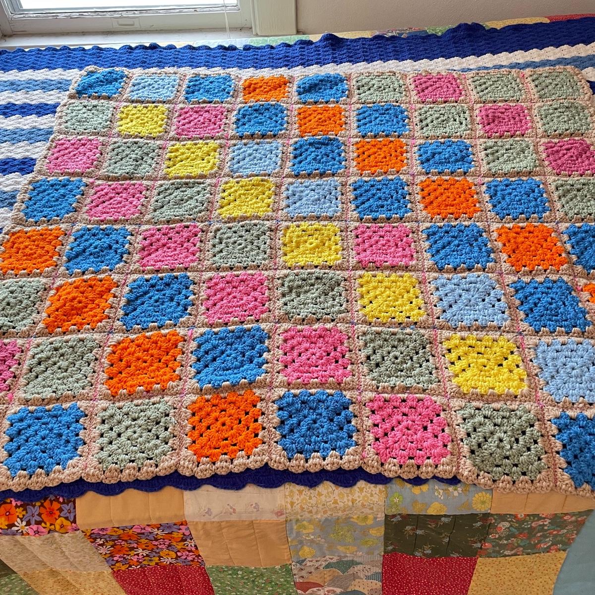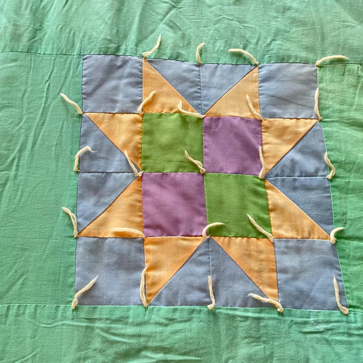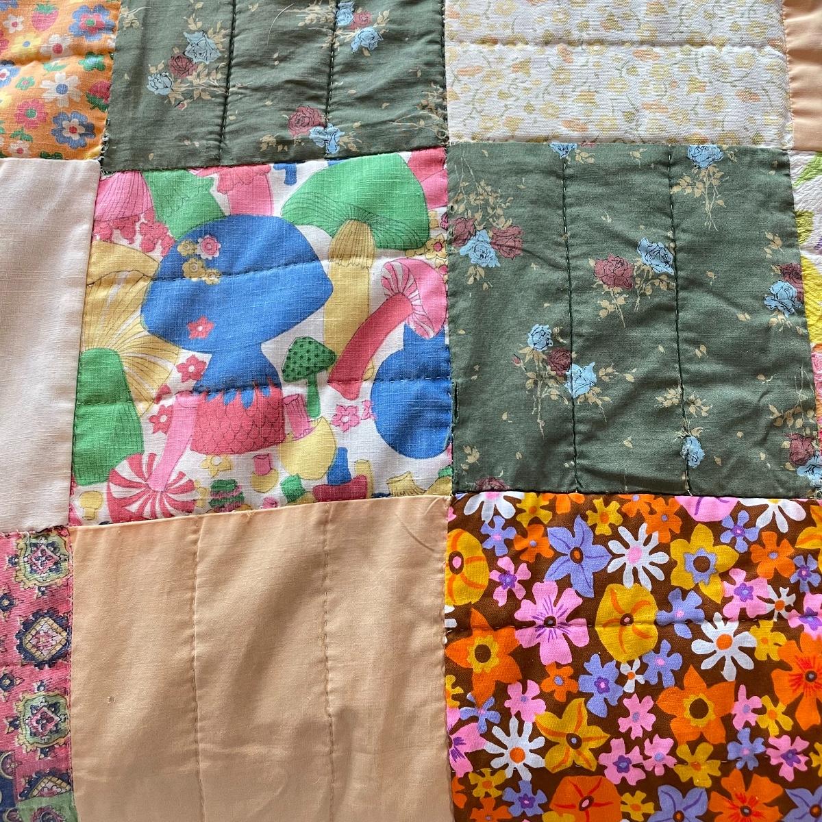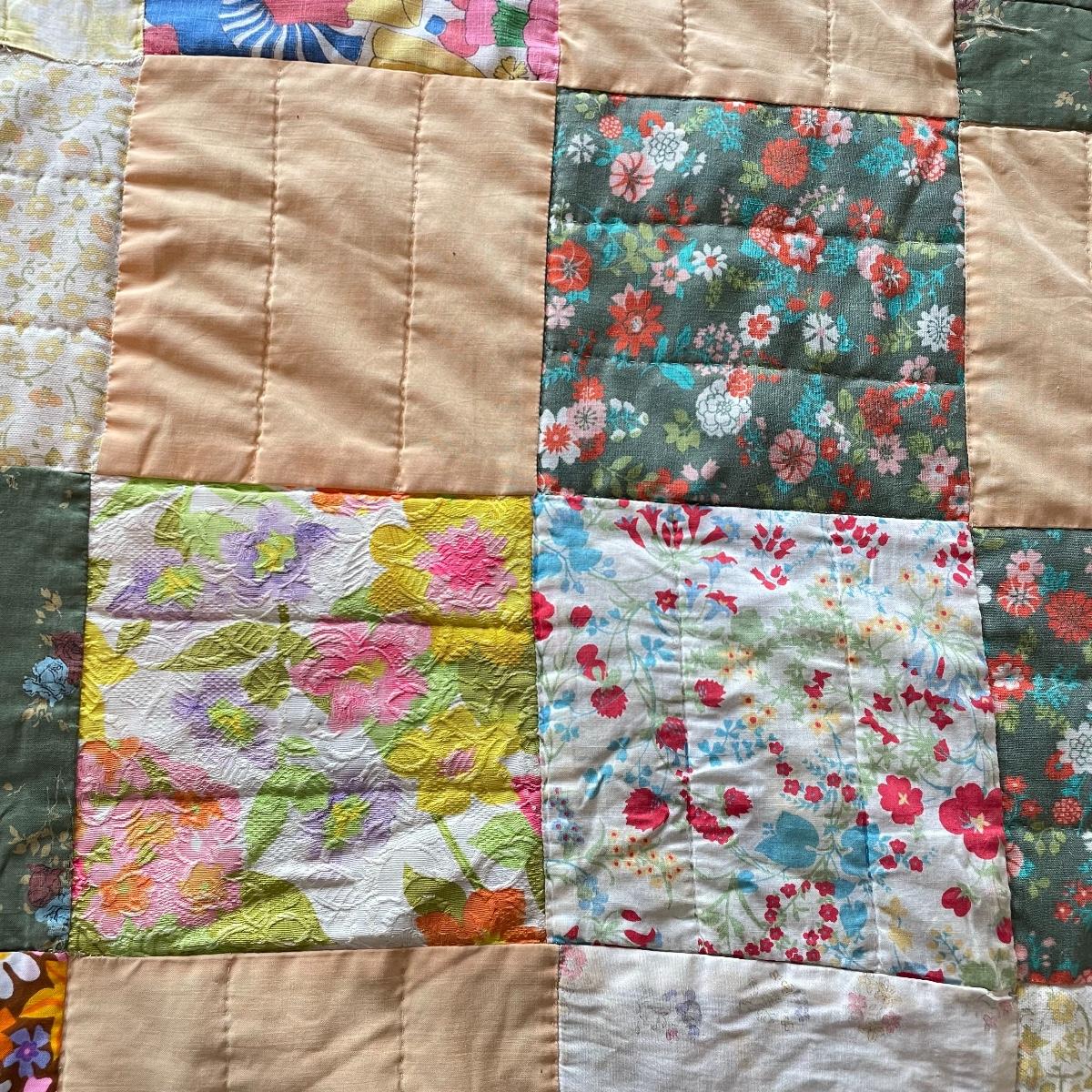 All photos are taken on a full sized bed (53”wide). Two of the three quilts will nicely cover a queen sized bed. The sea foam green quilt is slightly smaller. The latter two quilts have rips shown in photos. All quilts and blankets will need to be cleaned before use. See images. Local pick up only.