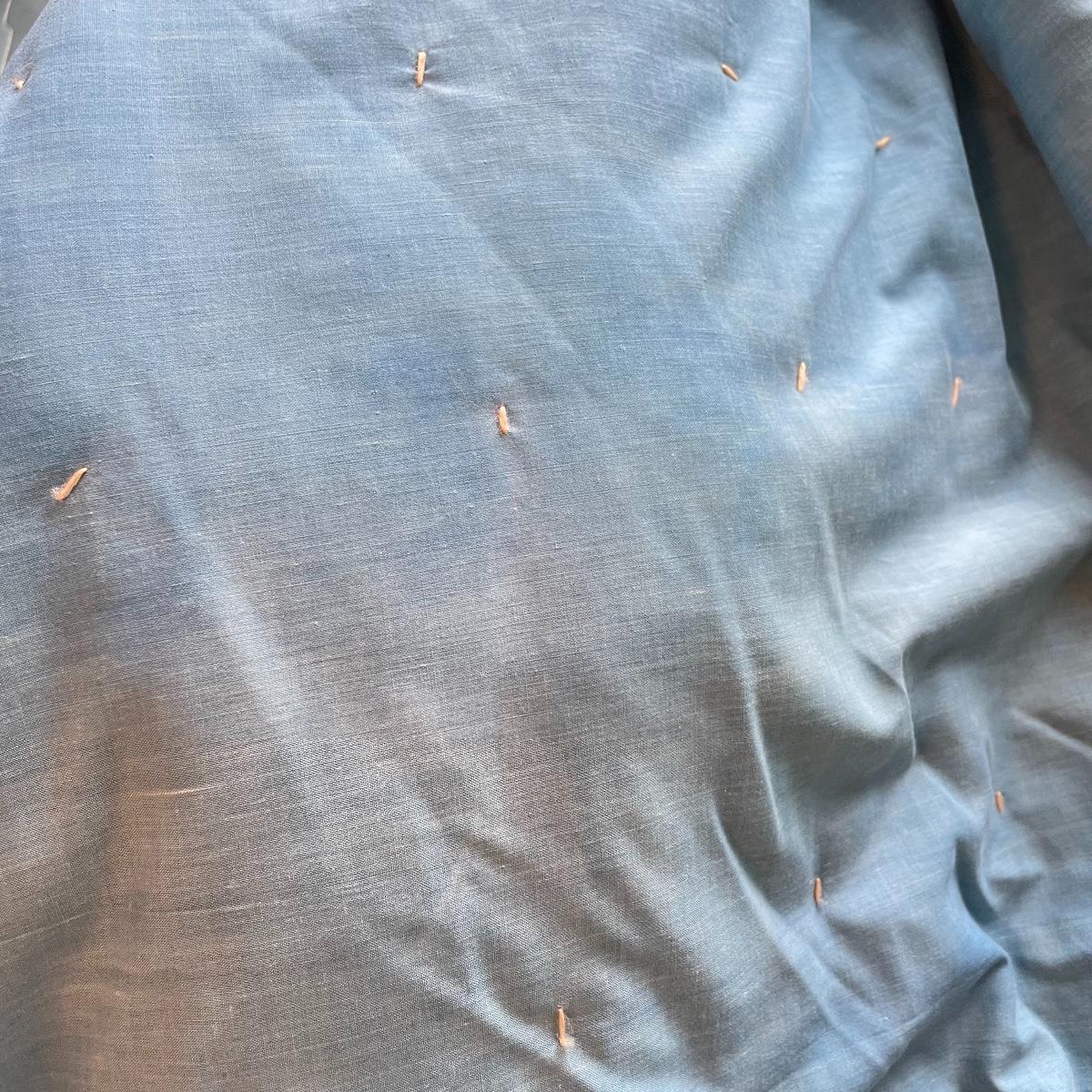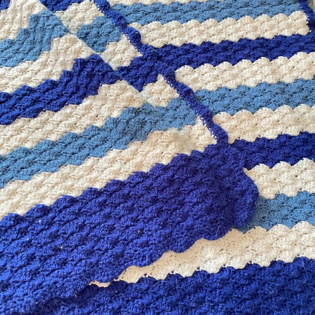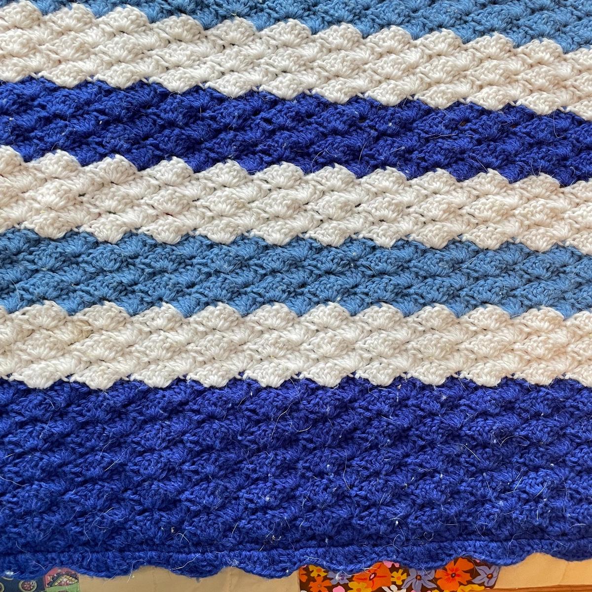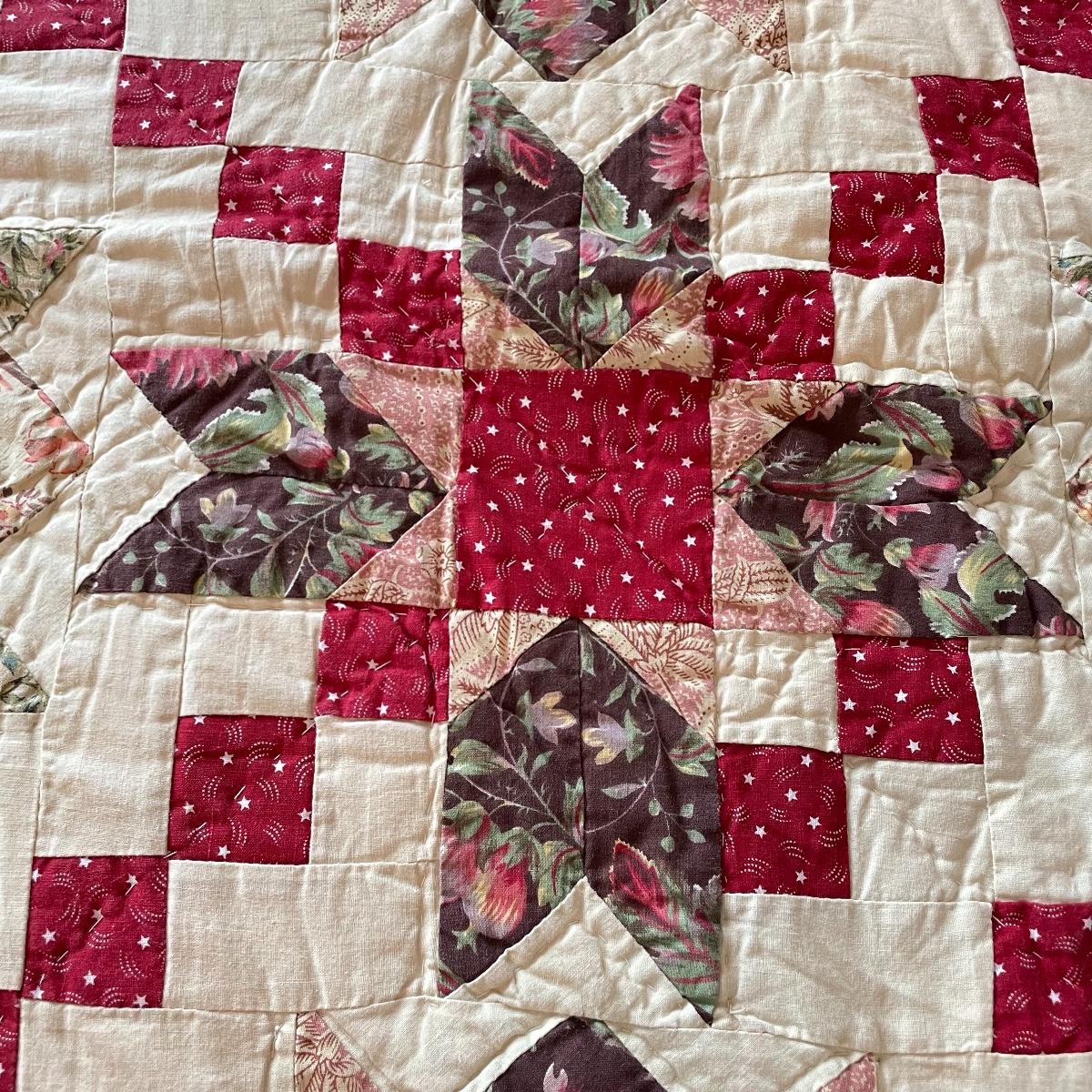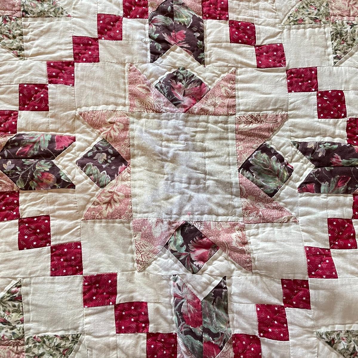 All photos are taken on a full sized bed (53”wide). Two of the three quilts will nicely cover a queen sized bed. The sea foam green quilt is slightly smaller. The latter two quilts have rips shown in photos. All quilts and blankets will need to be cleaned before use. See images. Local pick up only.