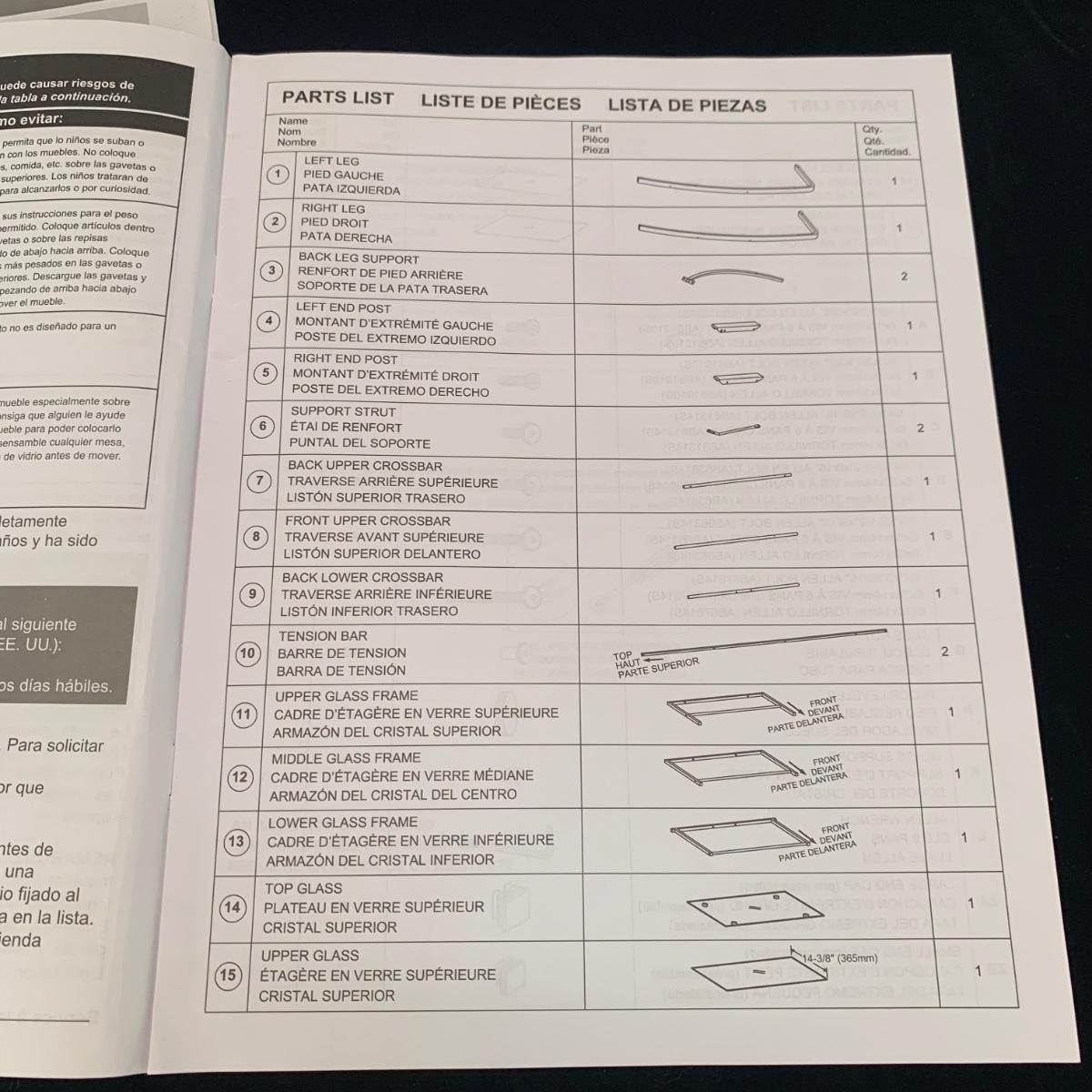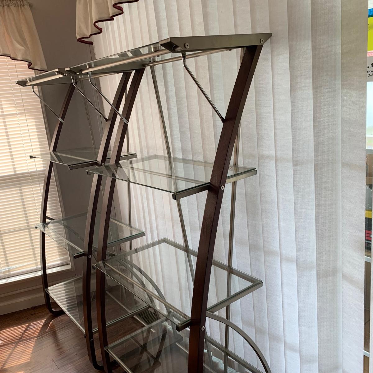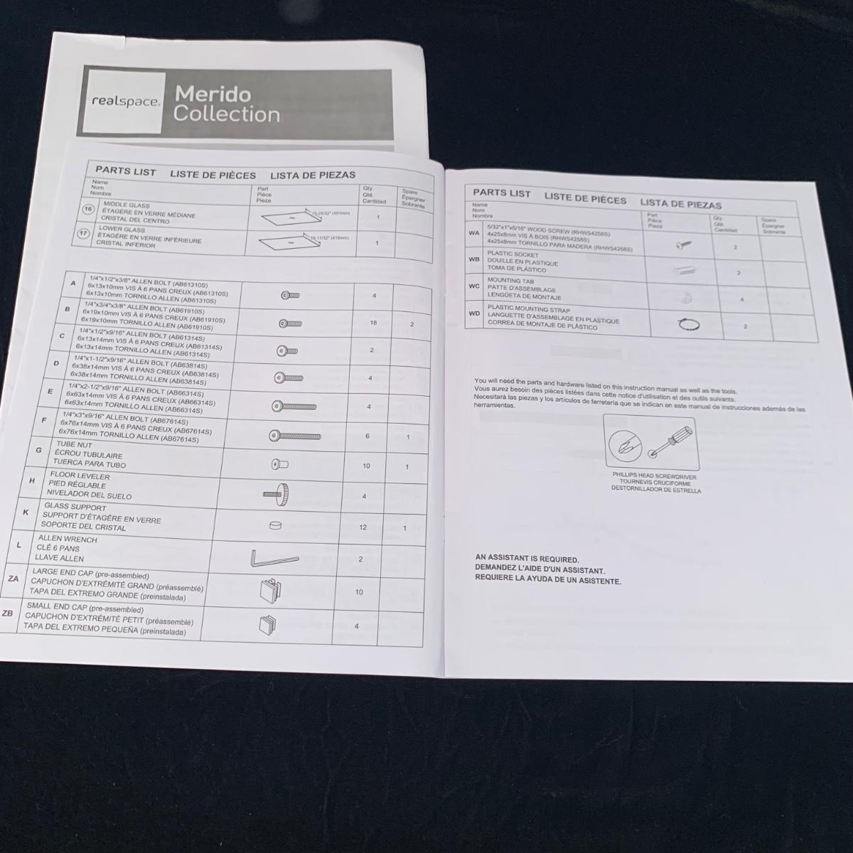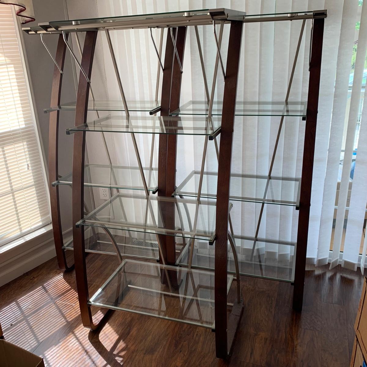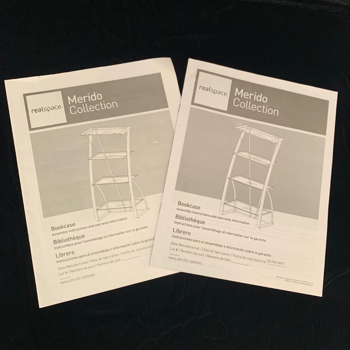 Three matching RealSpace Merido Collection bookcases with wooden legs, metal supports, and glass shelves. They have a unique curved shape. Each bookcase measures approximately 30” x 19” x 60”H. Assembly instructions are included. The glass shelves are all attached, not loose. They are a bit dusty and need cleaning. There’s a removable sticky substance on the wood of one of the cases.