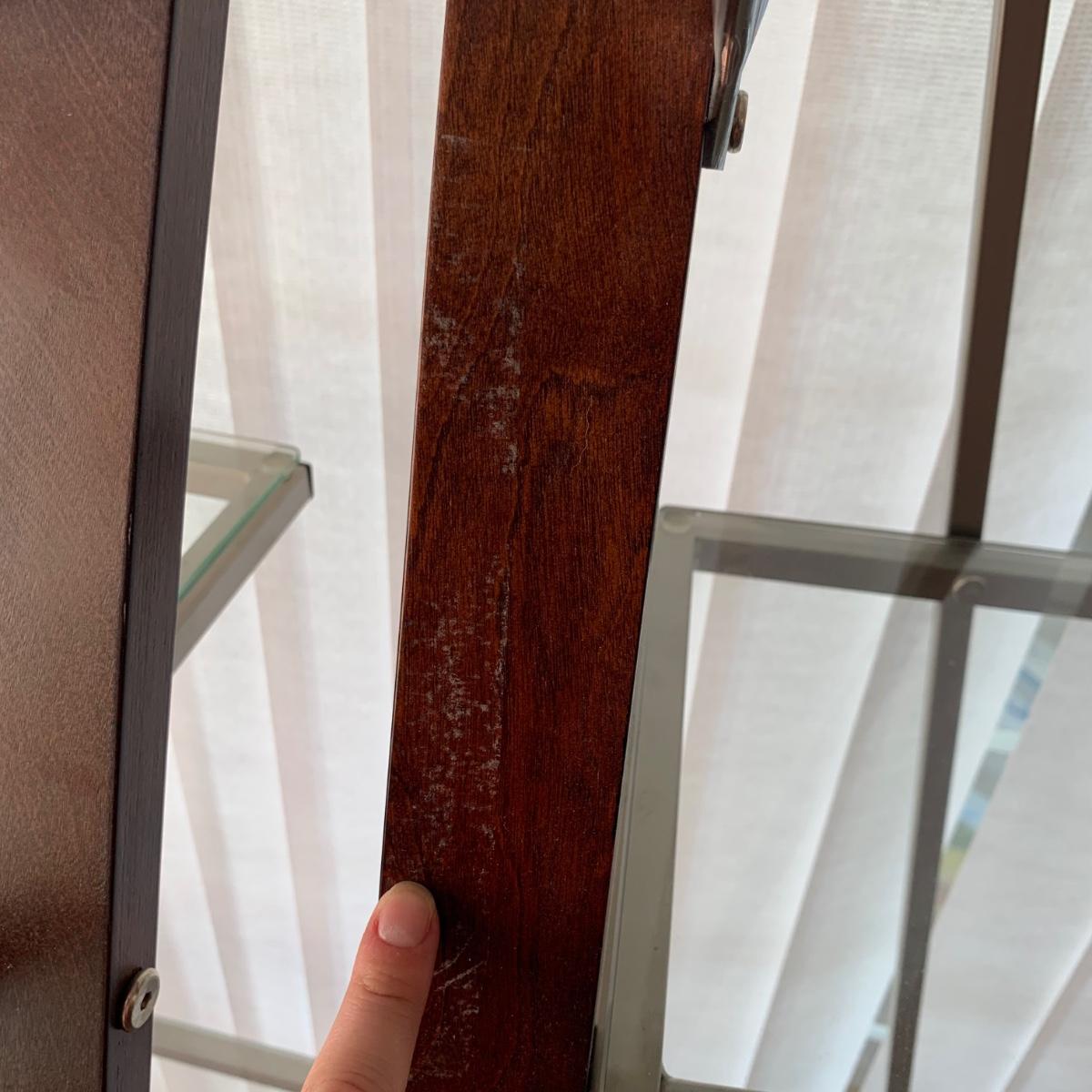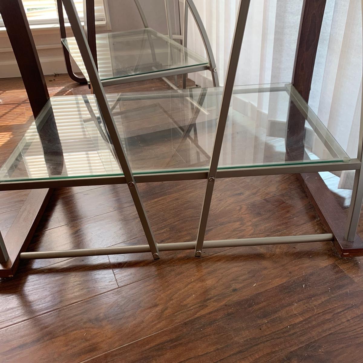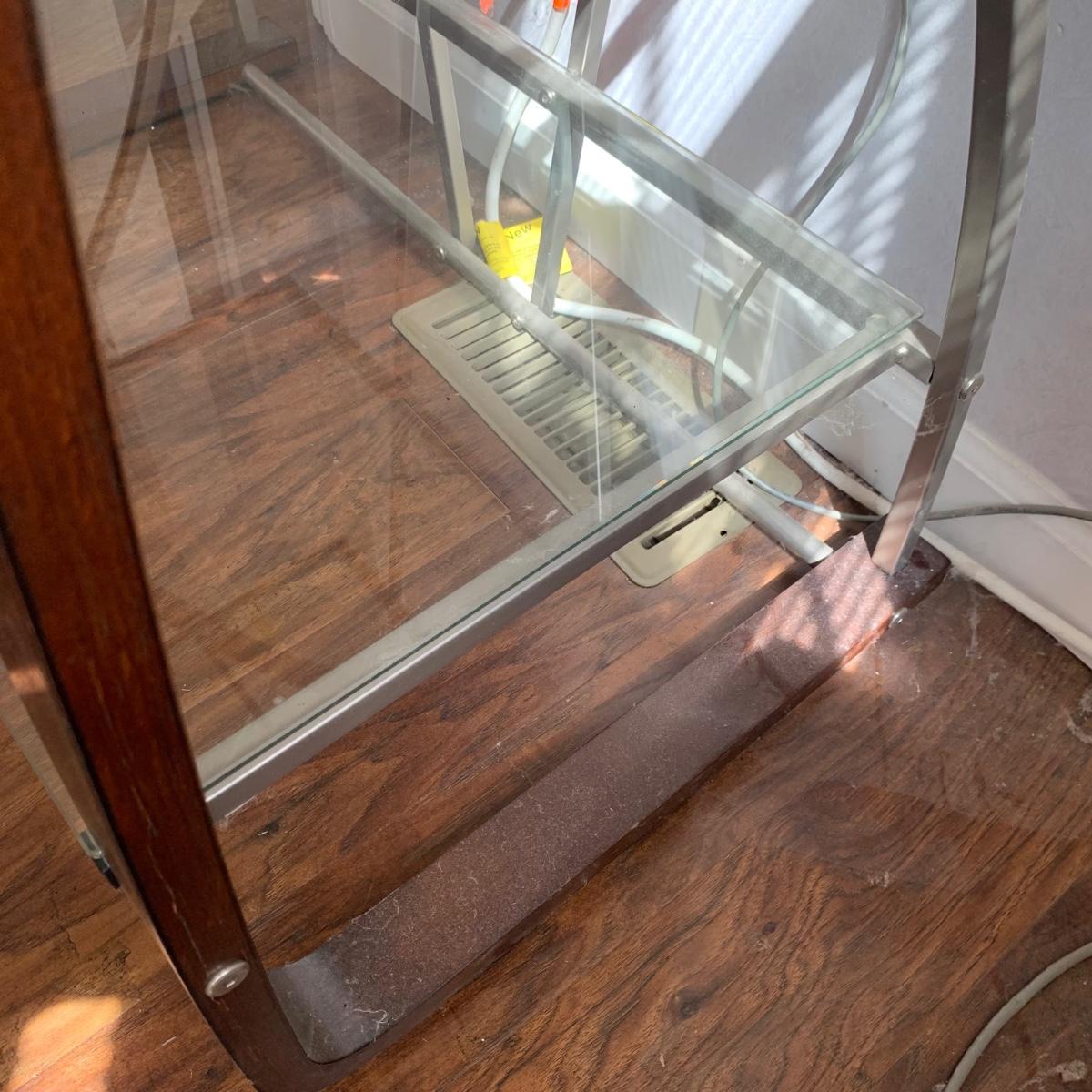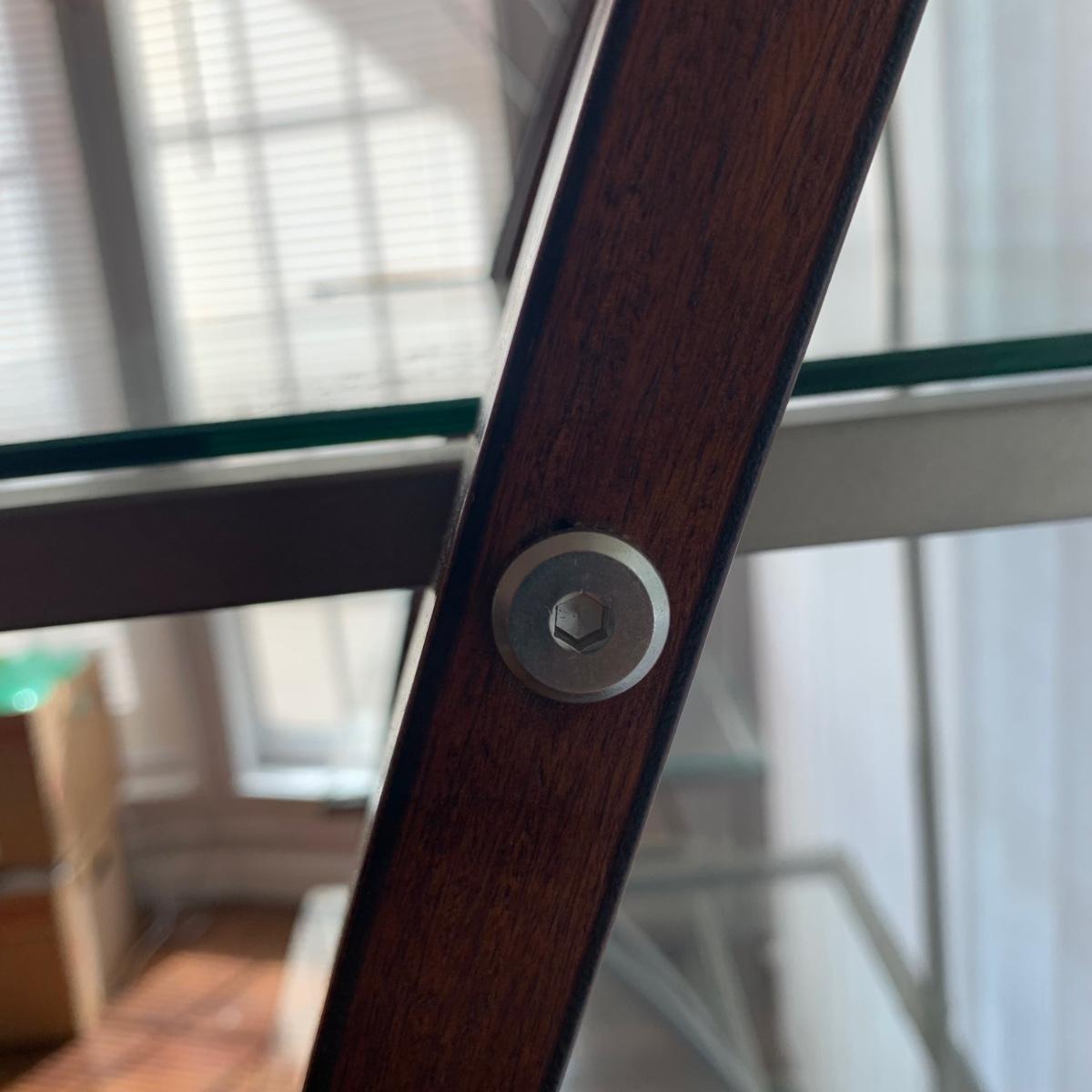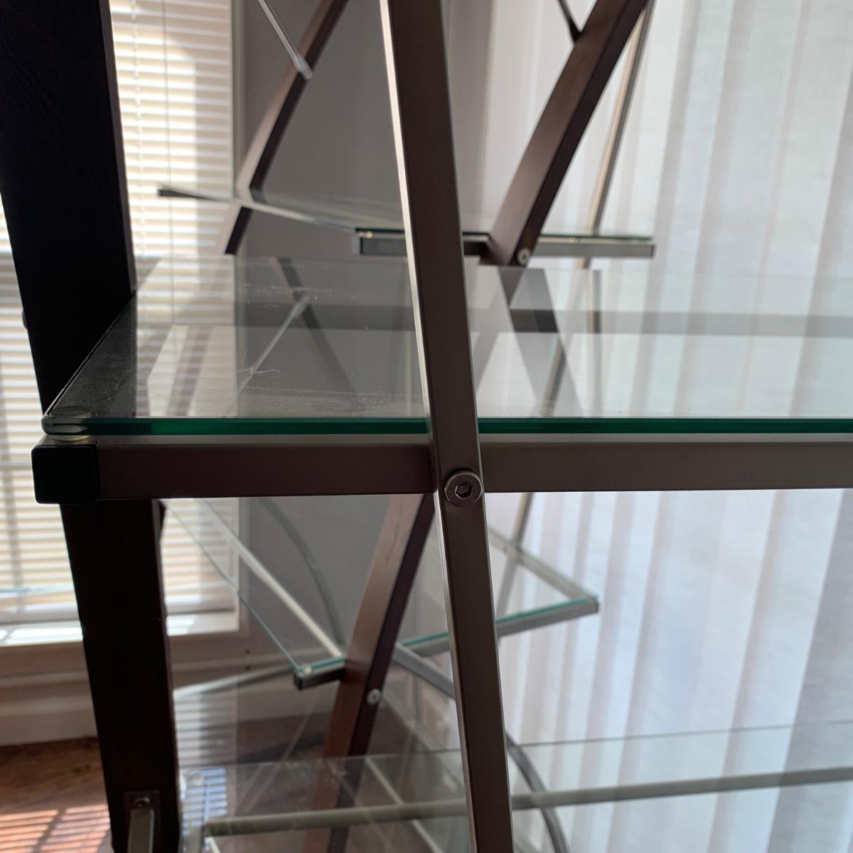 Three matching RealSpace Merido Collection bookcases with wooden legs, metal supports, and glass shelves. They have a unique curved shape. Each bookcase measures approximately 30” x 19” x 60”H. Assembly instructions are included. The glass shelves are all attached, not loose. They are a bit dusty and need cleaning. There’s a removable sticky substance on the wood of one of the cases.