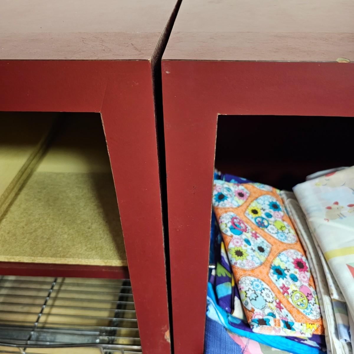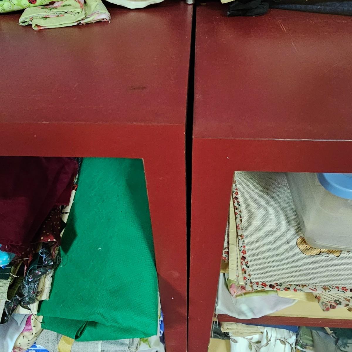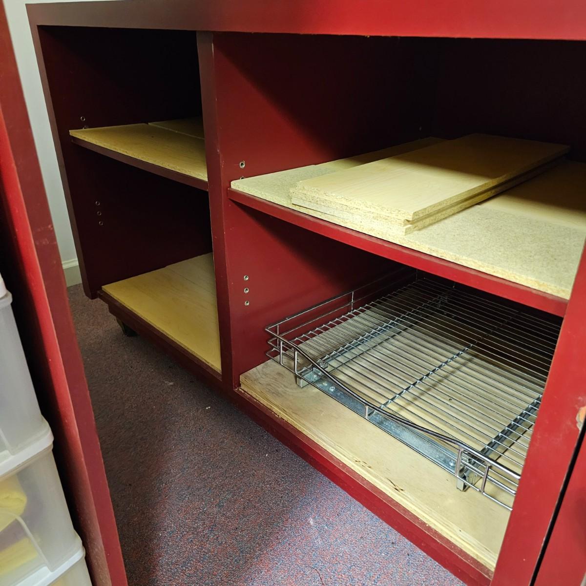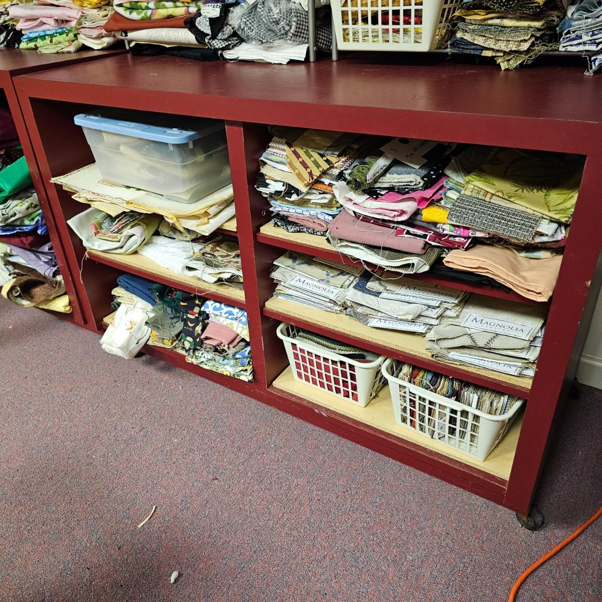 Three identical storage units with open storage and caster wheels. Units are deep red in color, particle board construction. Movable and adjustable shelves. Each piece measures 48"W x 24"D x 32"H. Please note, fabric on and in units is NOT included with this lot but is available elsewhere in the sale. See photos for details. Local pickup only. This item is located in the basement with a flight of stairs or alternatively a garden path with approximately 15 steps that can be used to go around the side of the house. The pieces are heavy and will require you to bring additional help to move them.