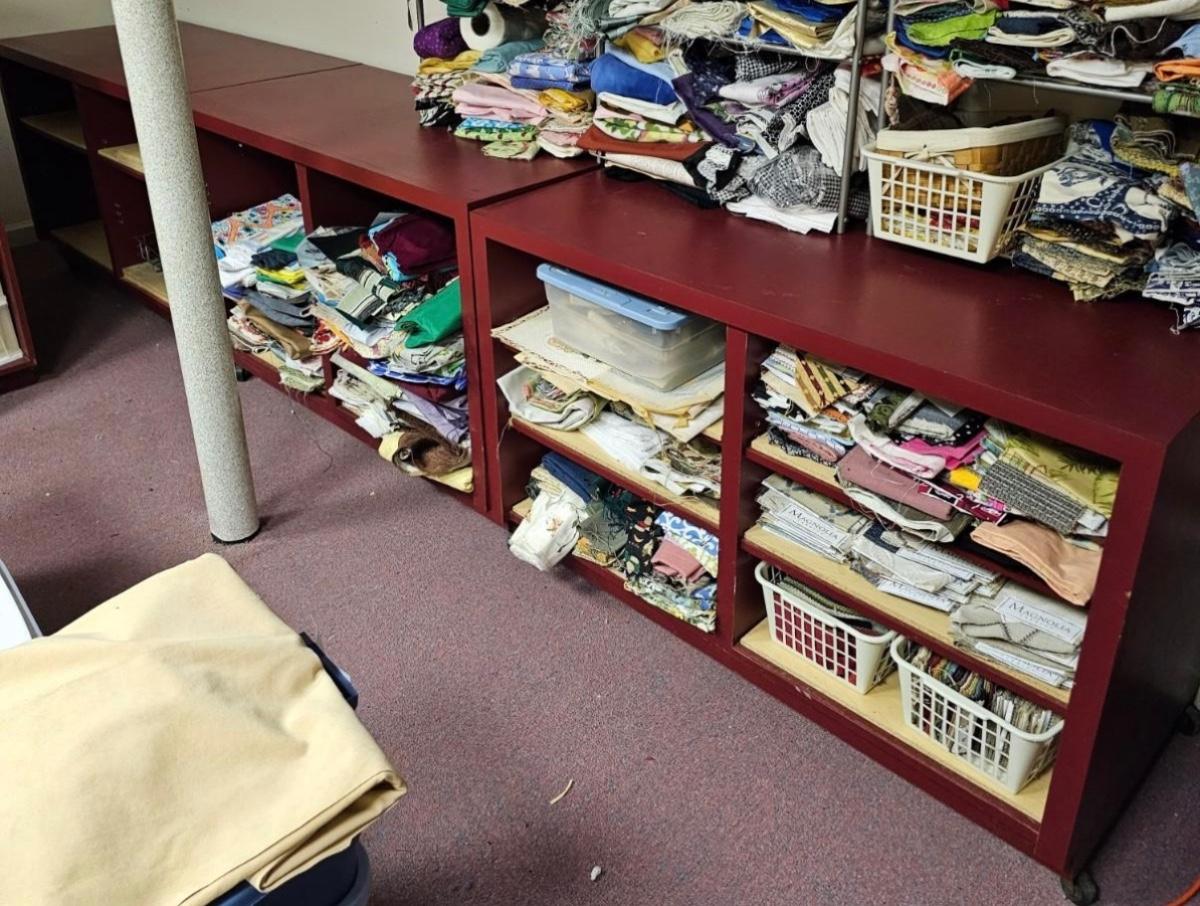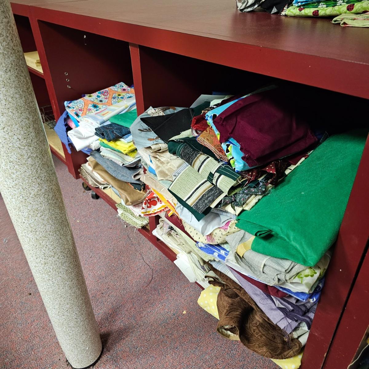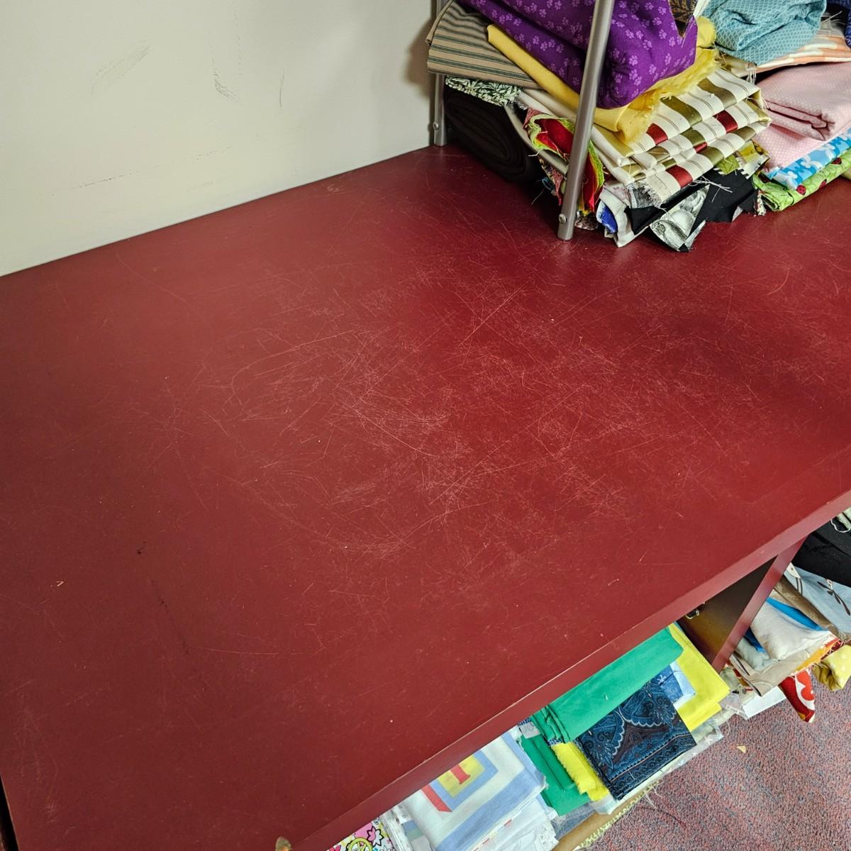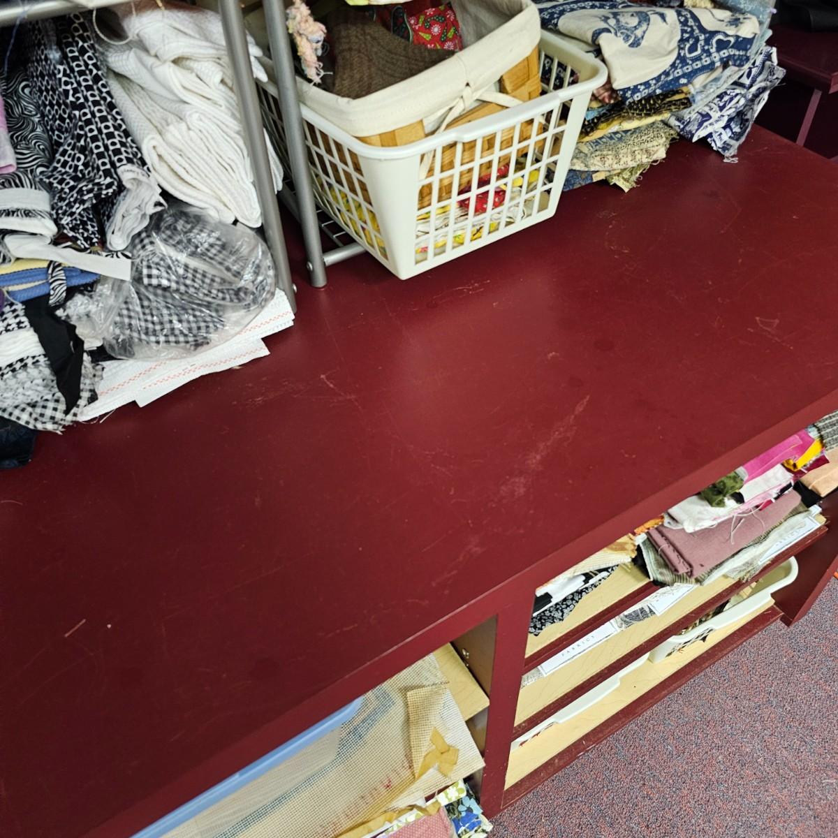 Three identical storage units with open storage and caster wheels. Units are deep red in color, particle board construction. Movable and adjustable shelves. Each piece measures 48"W x 24"D x 32"H. Please note, fabric on and in units is NOT included with this lot but is available elsewhere in the sale. See photos for details. Local pickup only. This item is located in the basement with a flight of stairs or alternatively a garden path with approximately 15 steps that can be used to go around the side of the house. The pieces are heavy and will require you to bring additional help to move them.