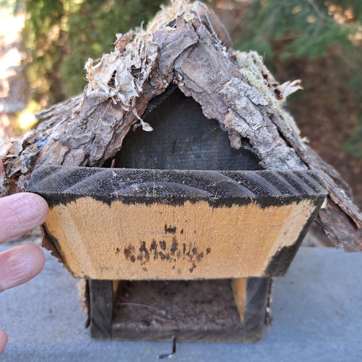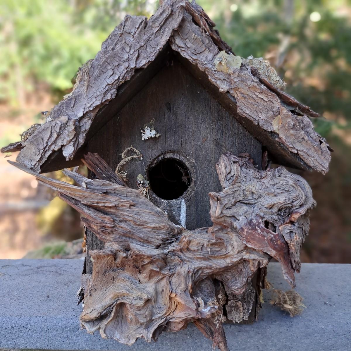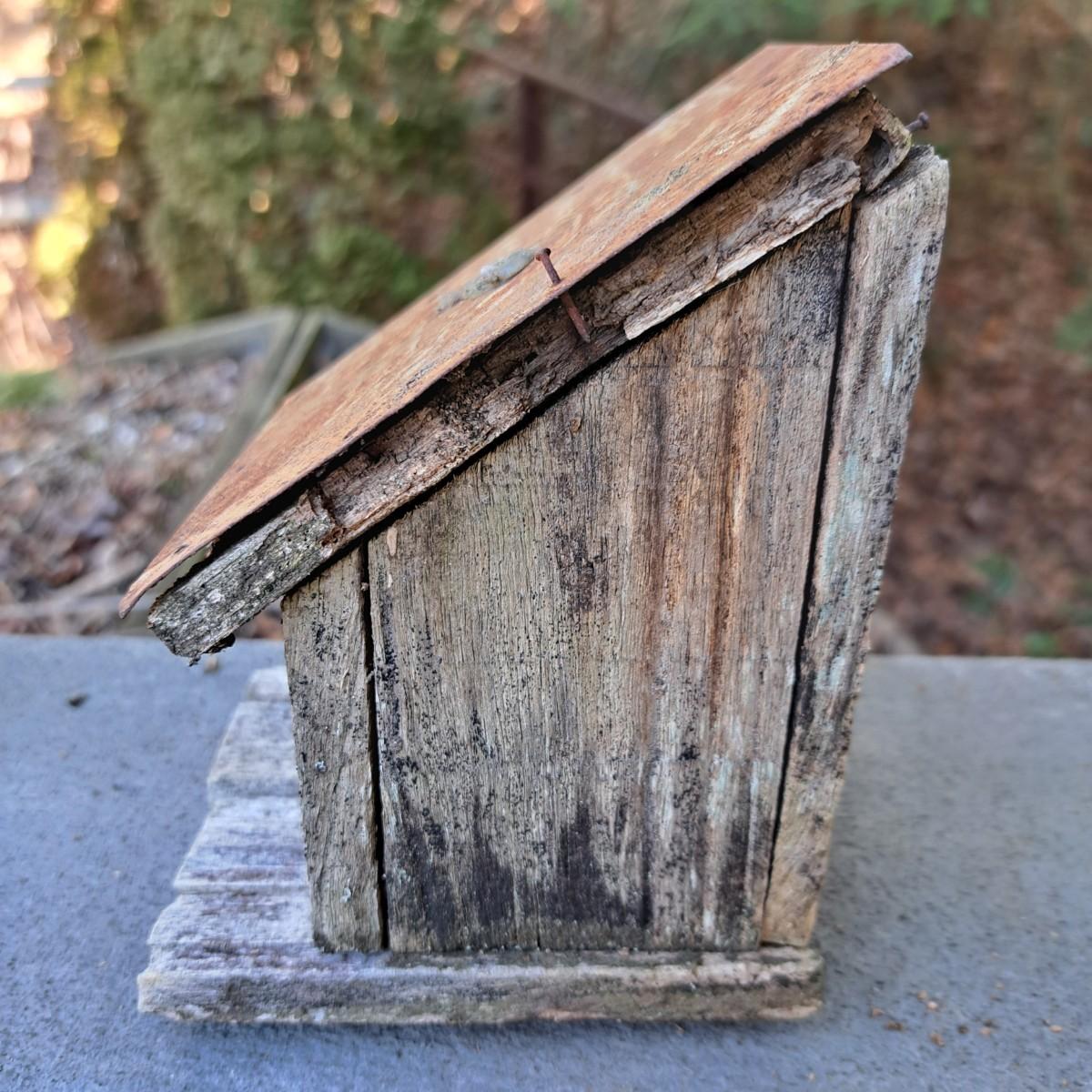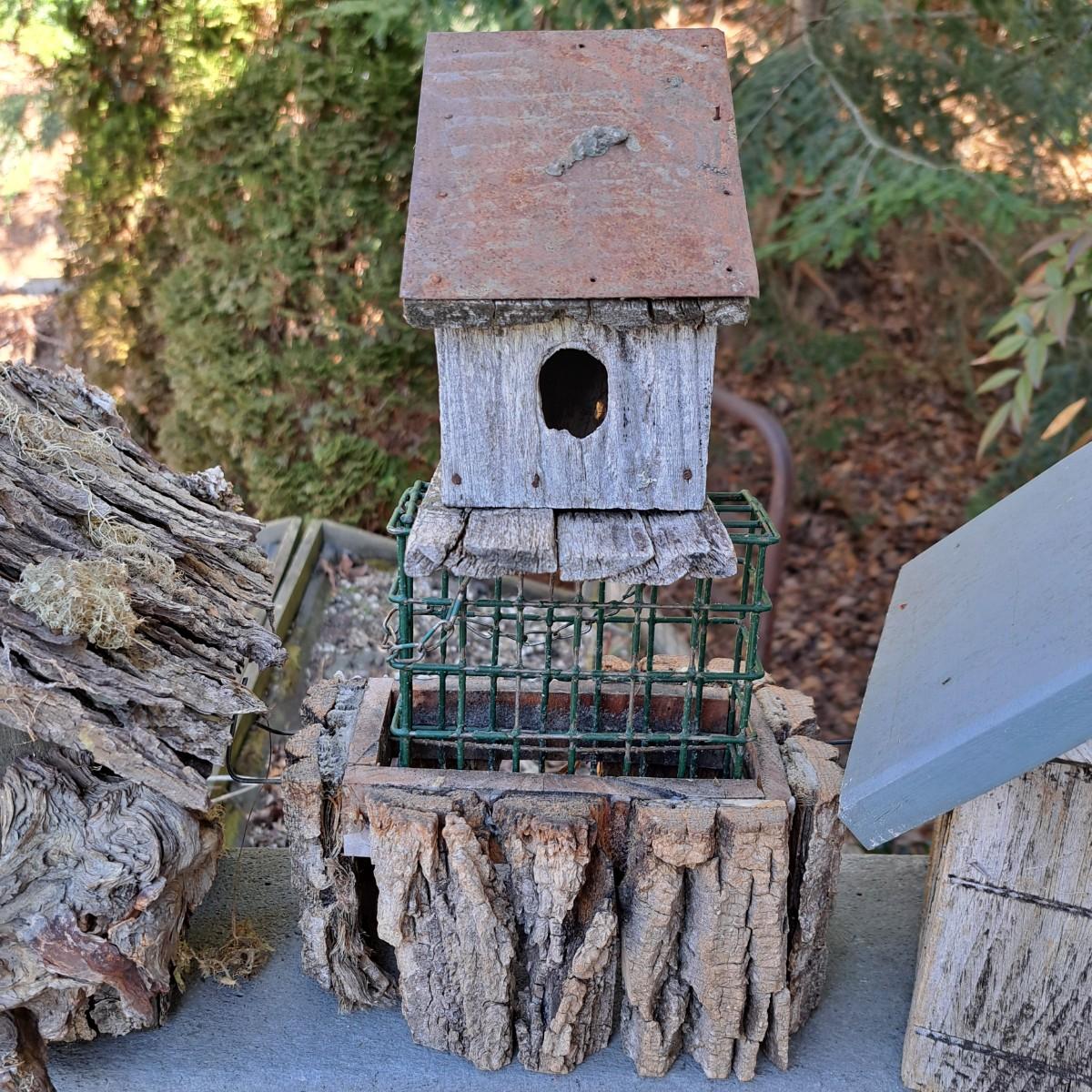 For your feathered friends - this lot contains 3 rustic wooden birdfeeders ranging in size from 6"H to 11"H and a suet feeder. All are weathered to different degrees as shown. The smallest has a shed roof and the largest is slightly reminiscent of a hobbit house with with bark roof and a handy back door. Local pickup only.