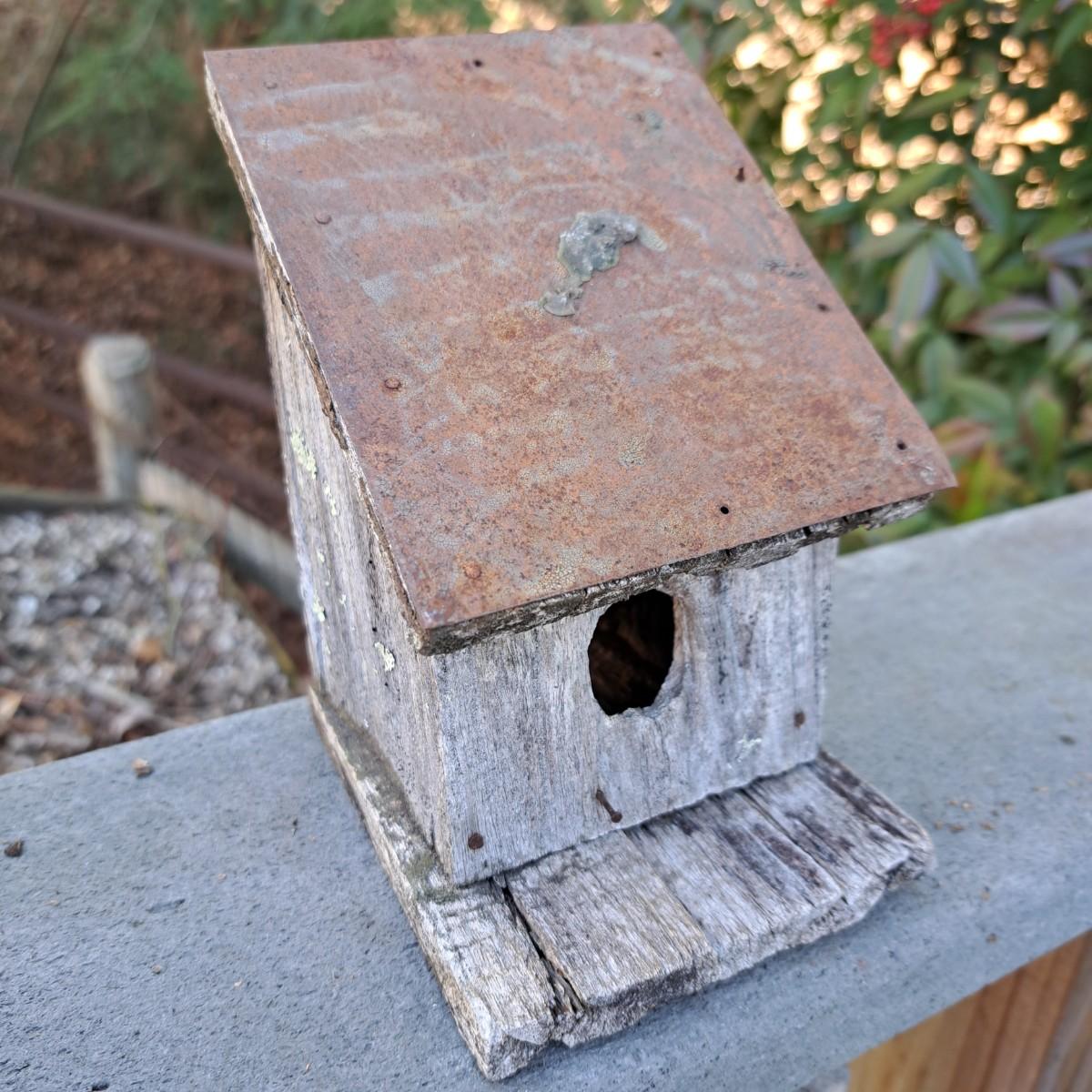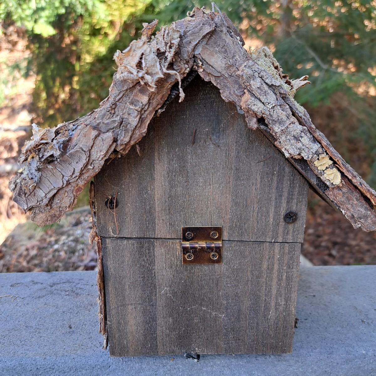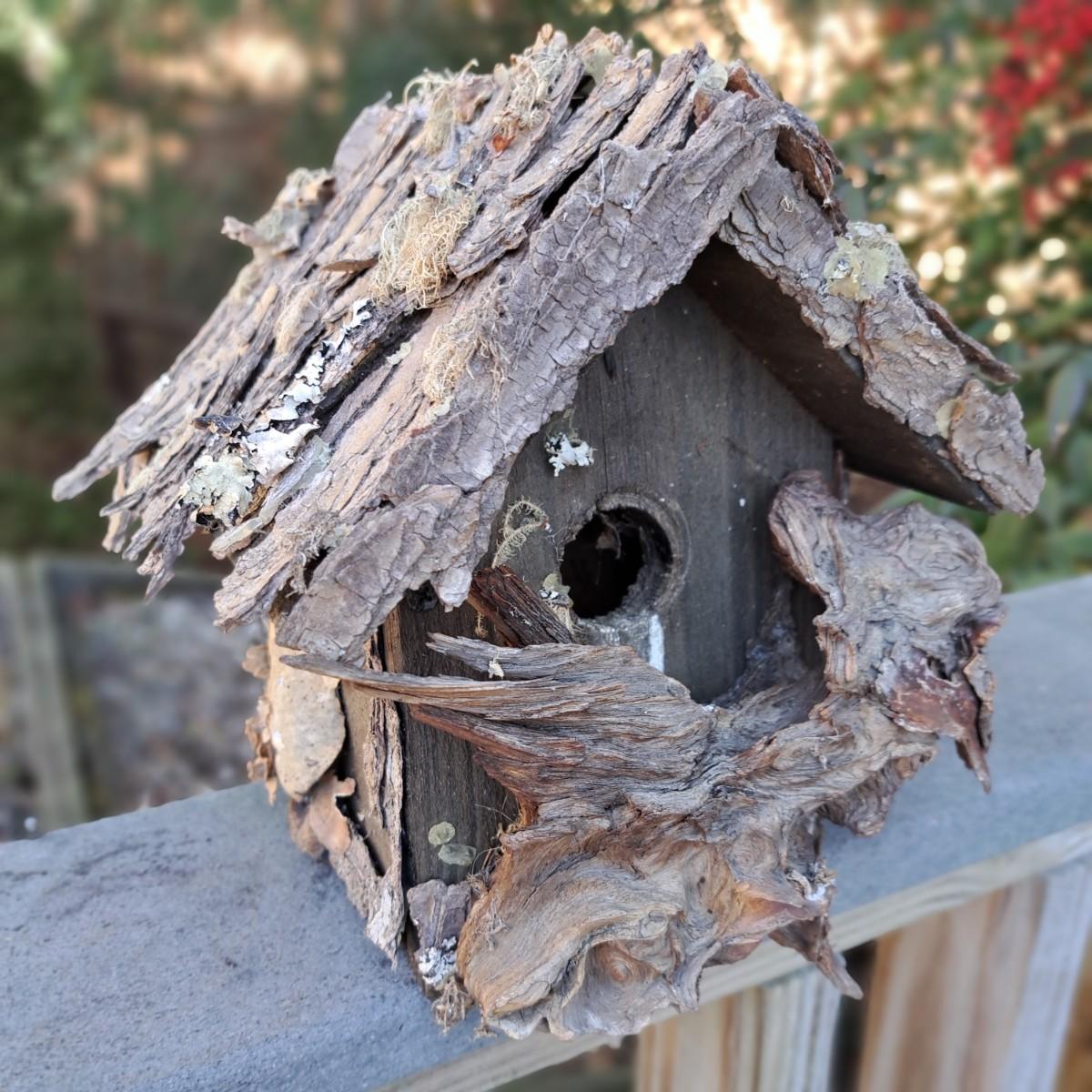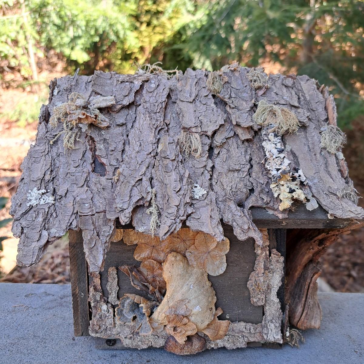 For your feathered friends - this lot contains 3 rustic wooden birdfeeders ranging in size from 6"H to 11"H and a suet feeder. All are weathered to different degrees as shown. The smallest has a shed roof and the largest is slightly reminiscent of a hobbit house with with bark roof and a handy back door. Local pickup only.