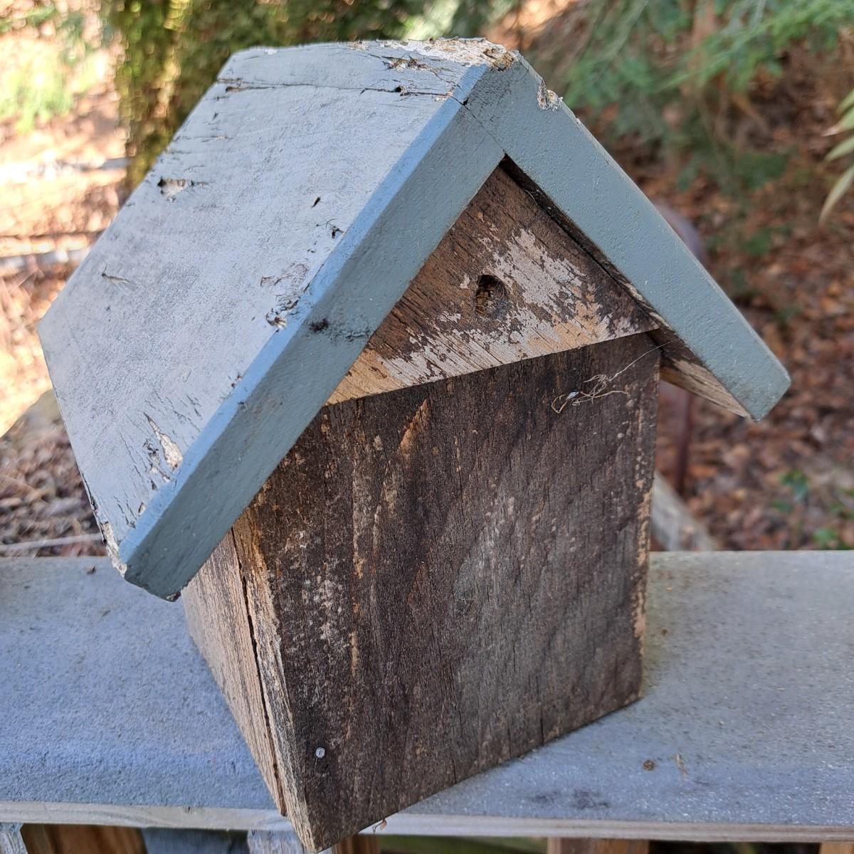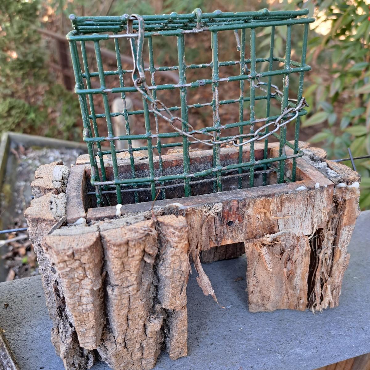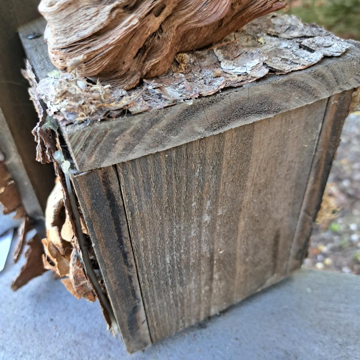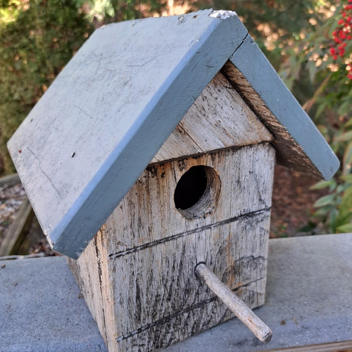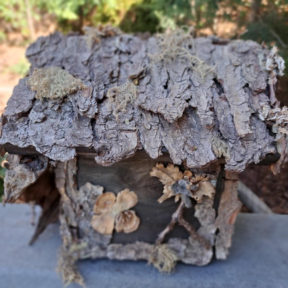 For your feathered friends - this lot contains 3 rustic wooden birdfeeders ranging in size from 6"H to 11"H and a suet feeder. All are weathered to different degrees as shown. The smallest has a shed roof and the largest is slightly reminiscent of a hobbit house with with bark roof and a handy back door. Local pickup only.