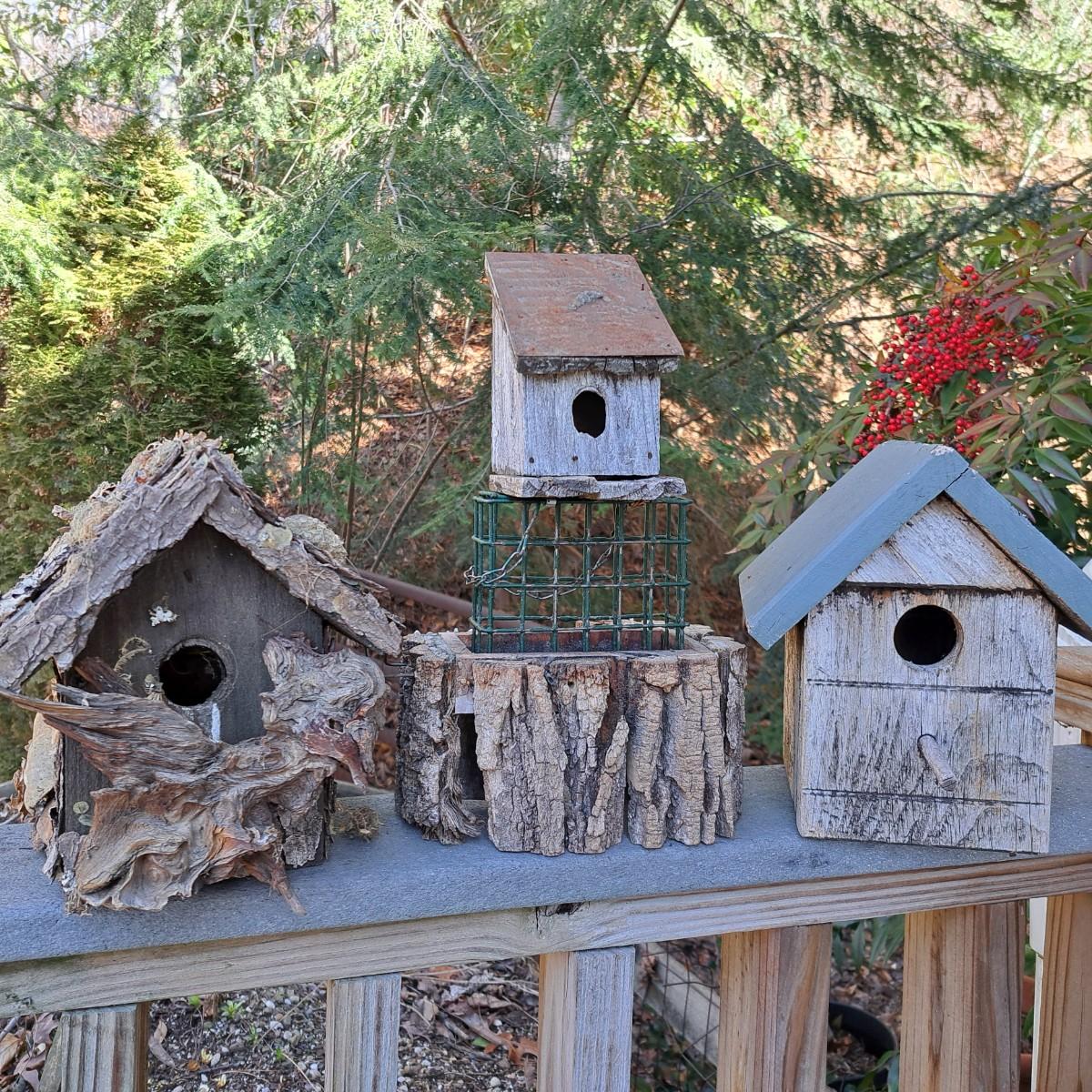 Three Rustic Birdhouses & Suet Feeder (BD-SD)