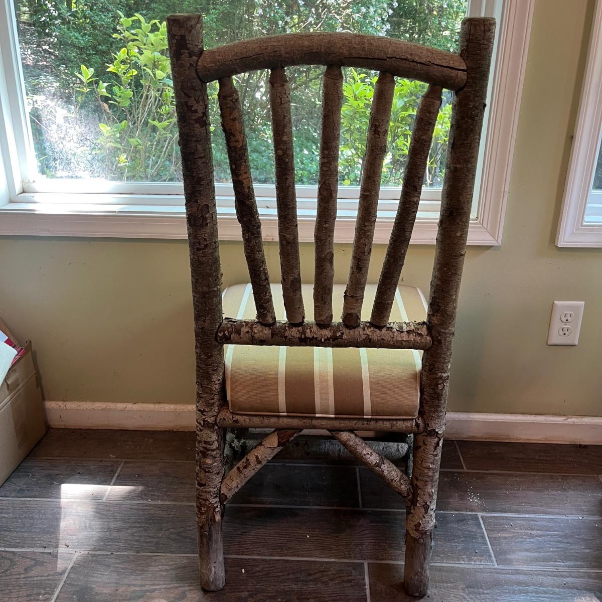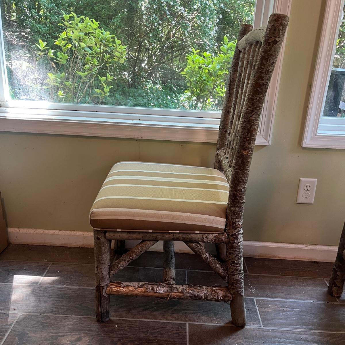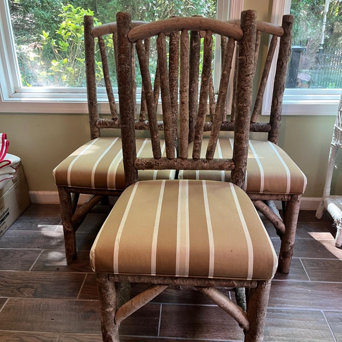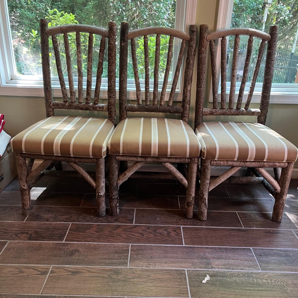 Lot includes three rustic side chairs with upholstered seats and fan style back. Chairs appear to be made from branches and have nicks and some bark that has come off. Chairs measure 21” x 19” x 42”H with a 18.5” seat height. Seats haves a few spots, see pictures.