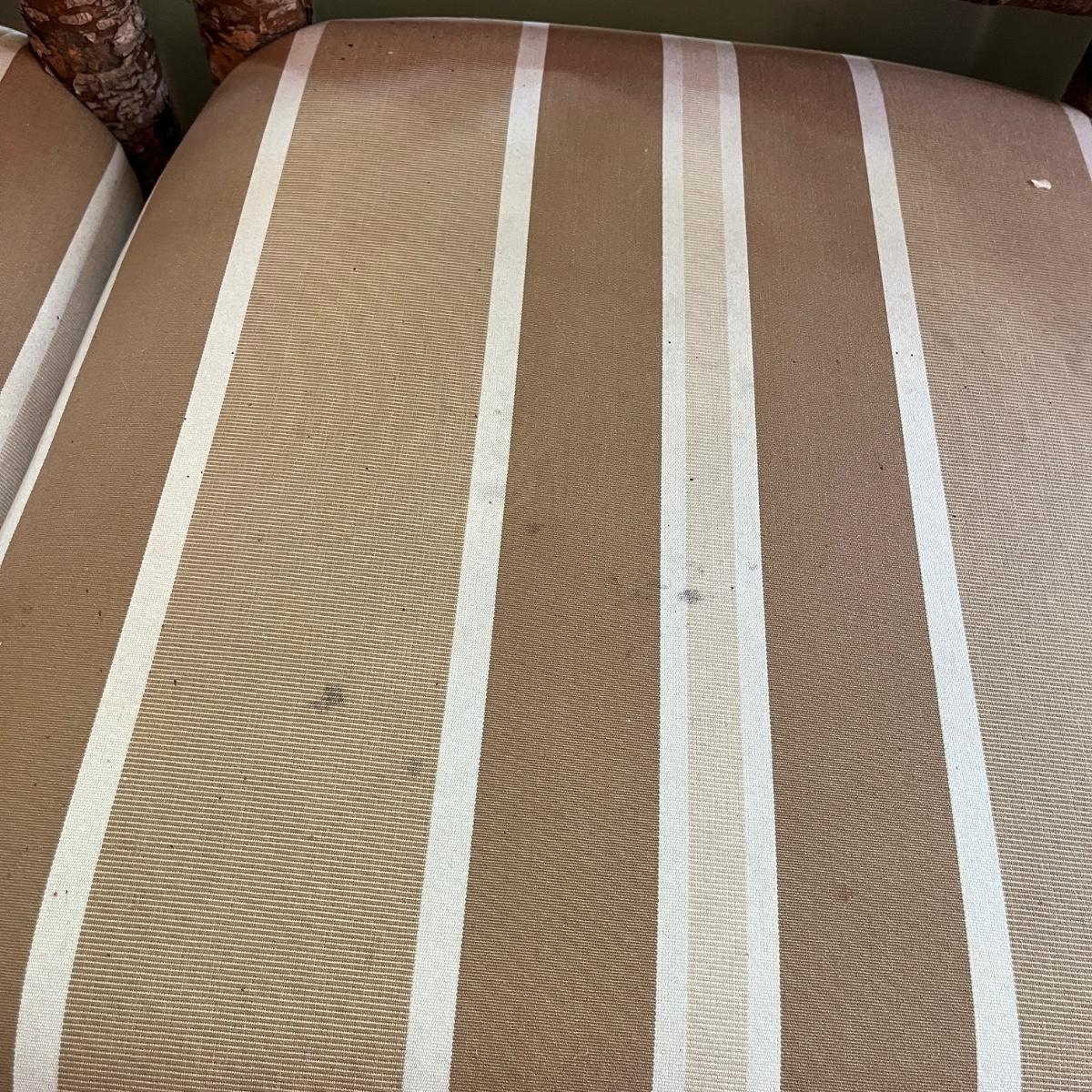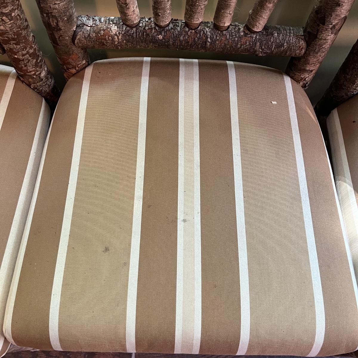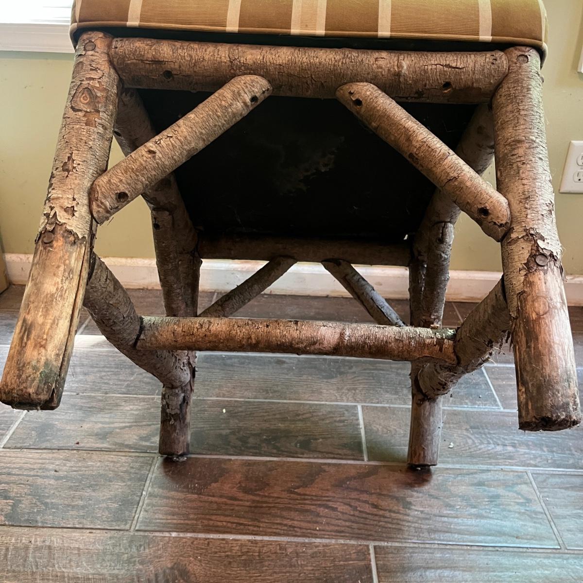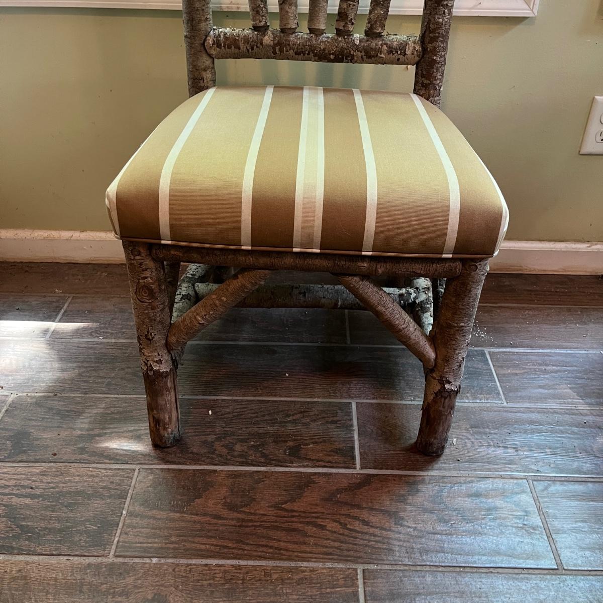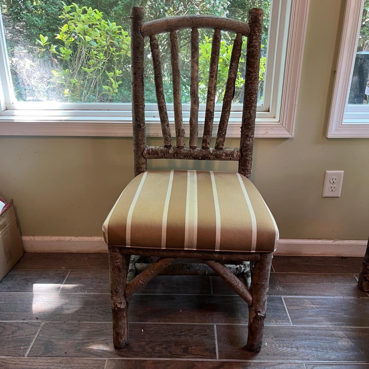 Lot includes three rustic side chairs with upholstered seats and fan style back. Chairs appear to be made from branches and have nicks and some bark that has come off. Chairs measure 21” x 19” x 42”H with a 18.5” seat height. Seats haves a few spots, see pictures.
