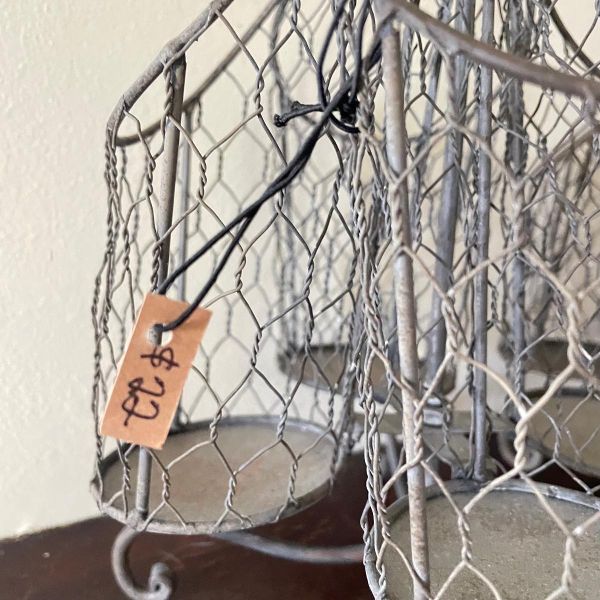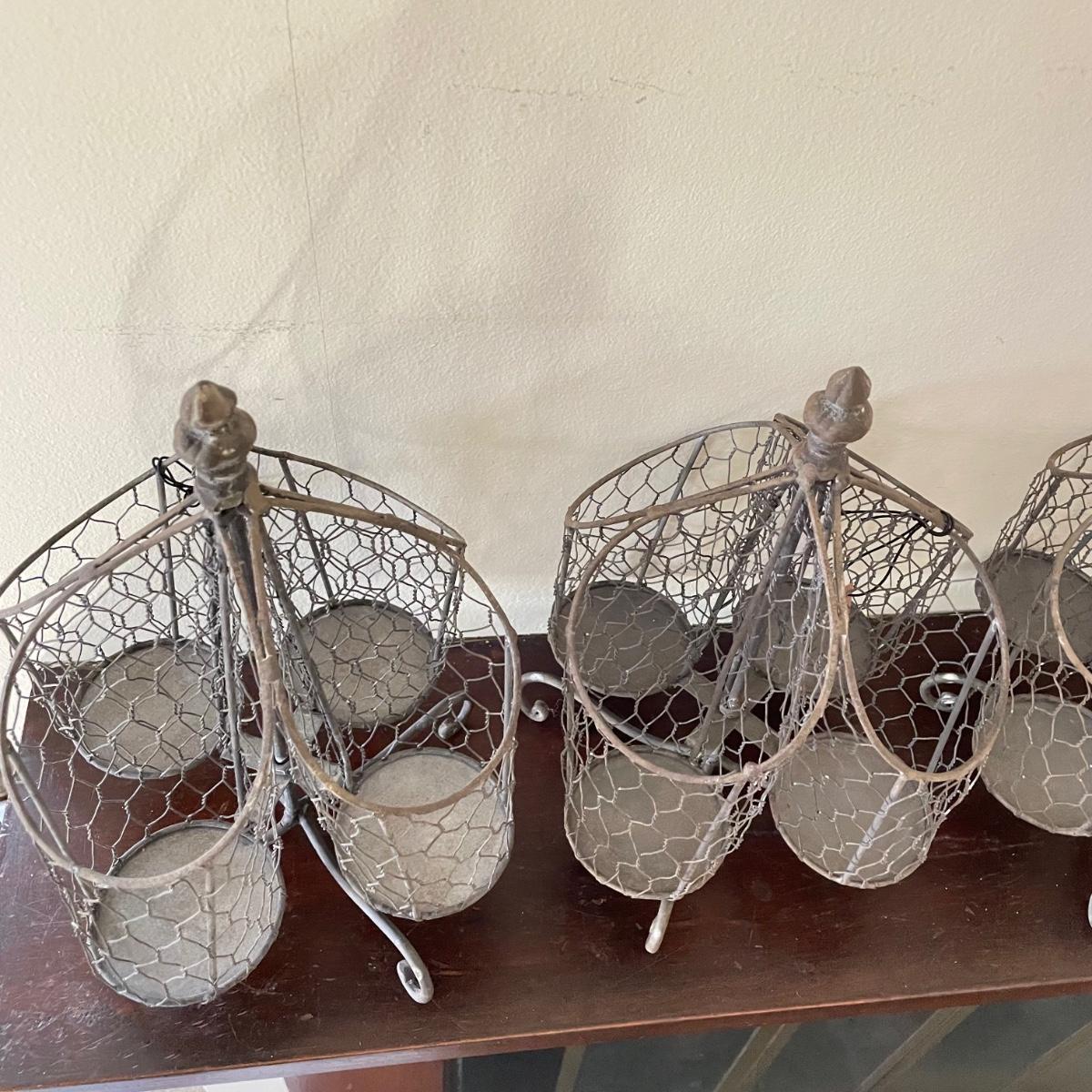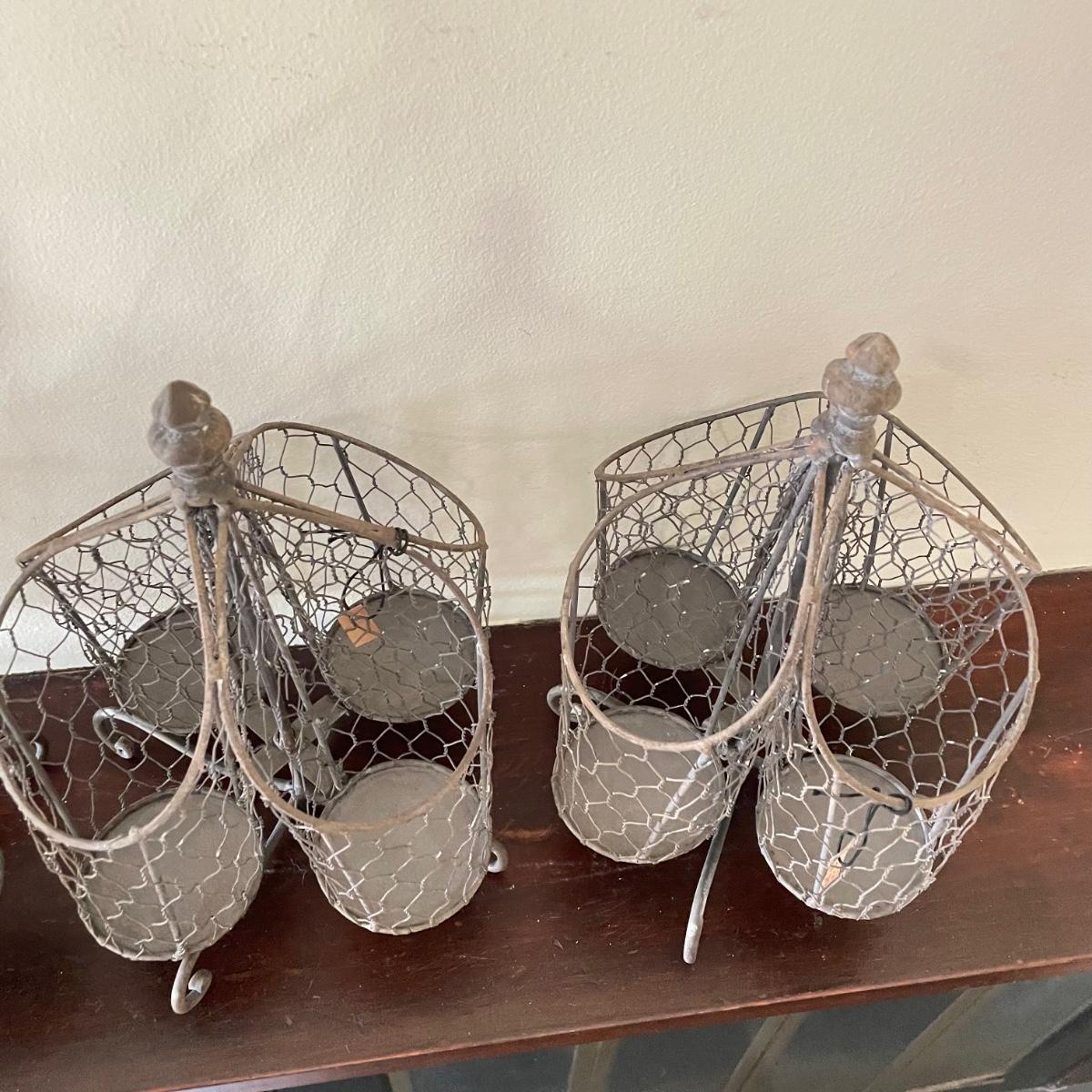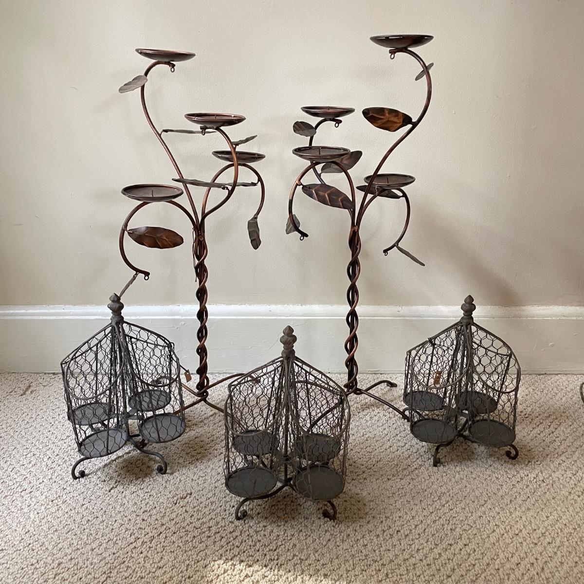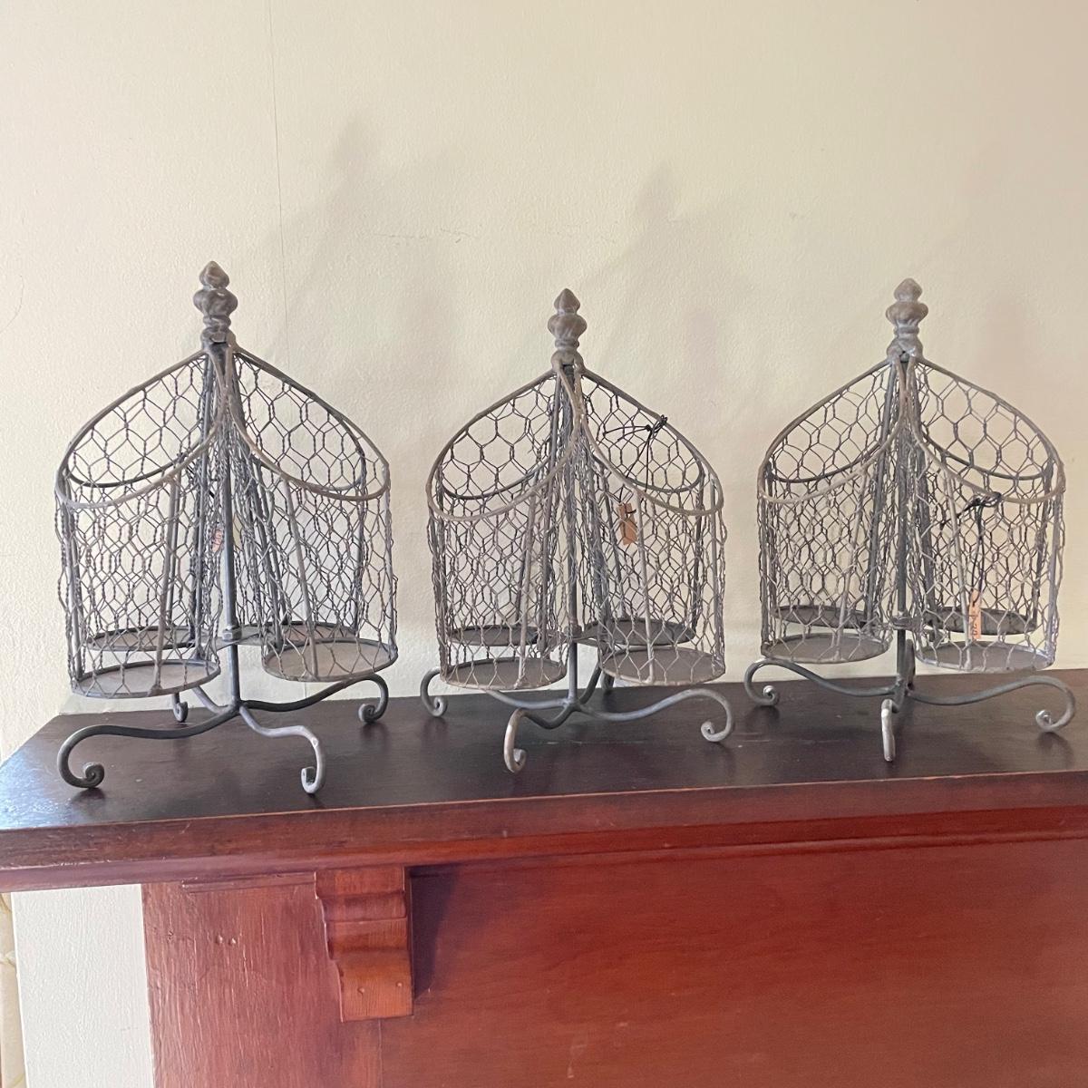 Three rustic swiveling candle holders or utensil holders. Each holder can hold four 2.5”D candles each. Holders are metal with small chicken-wire style fencing. Each measures approximately 6.5”SQ x 10.5”H. Each holder has what appears to be their original price tag attached. Next, a matching pair of 24” tall swirled metal candle holders. These can hold four 2.75”D pillar candles. Under each candle, there is a hoop to hang more decor such as ornaments, light catchers or crystals. Shipping available.