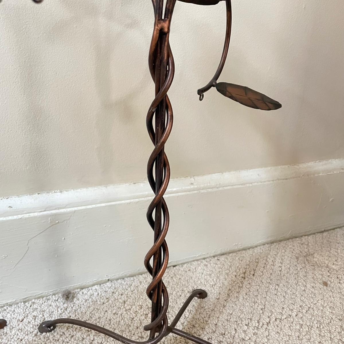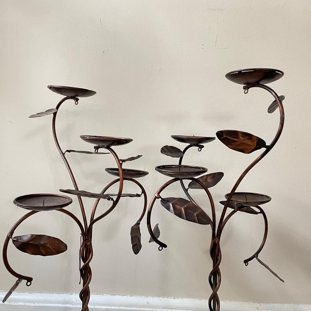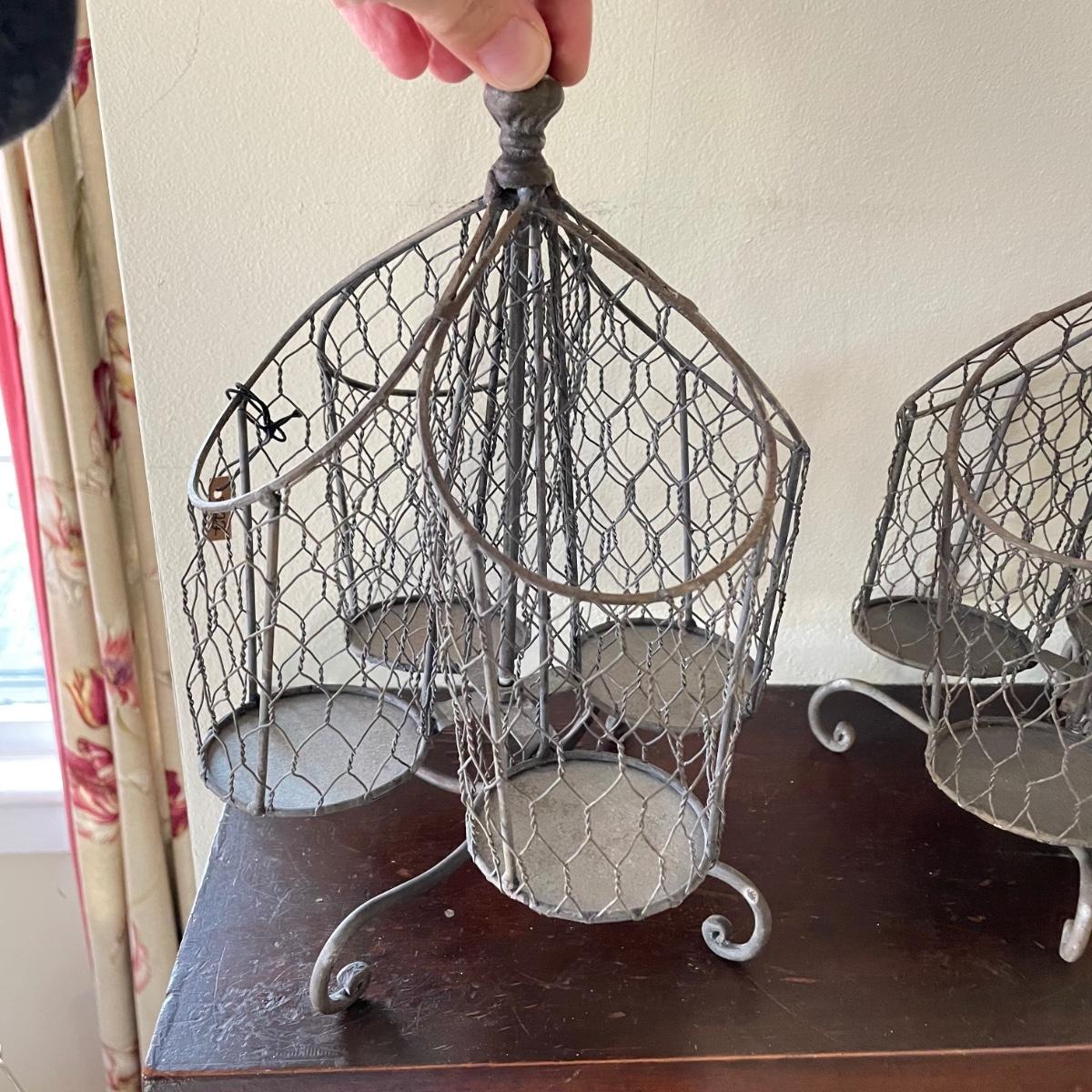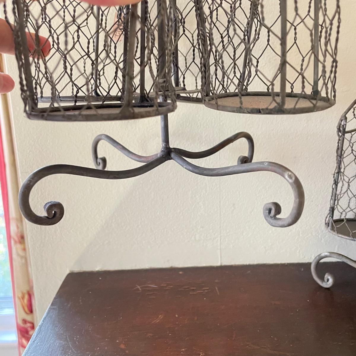 Three rustic swiveling candle holders or utensil holders. Each holder can hold four 2.5”D candles each. Holders are metal with small chicken-wire style fencing. Each measures approximately 6.5”SQ x 10.5”H. Each holder has what appears to be their original price tag attached. Next, a matching pair of 24” tall swirled metal candle holders. These can hold four 2.75”D pillar candles. Under each candle, there is a hoop to hang more decor such as ornaments, light catchers or crystals. Shipping available.