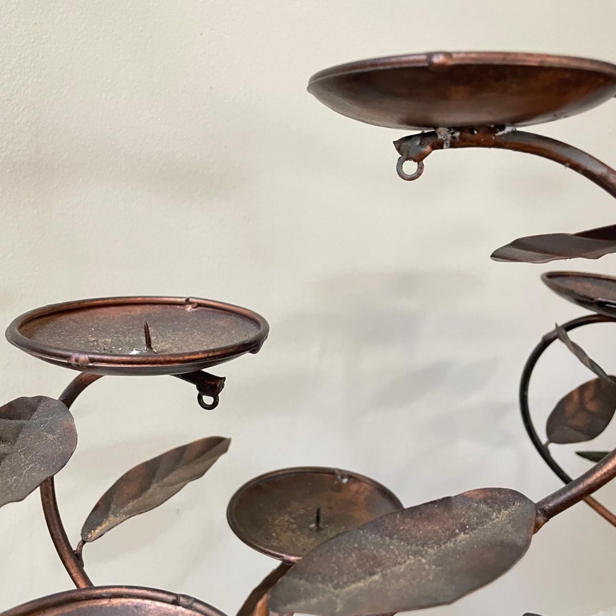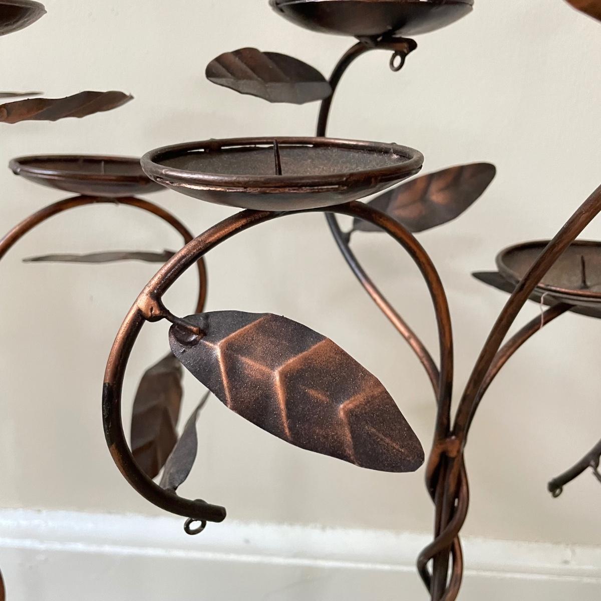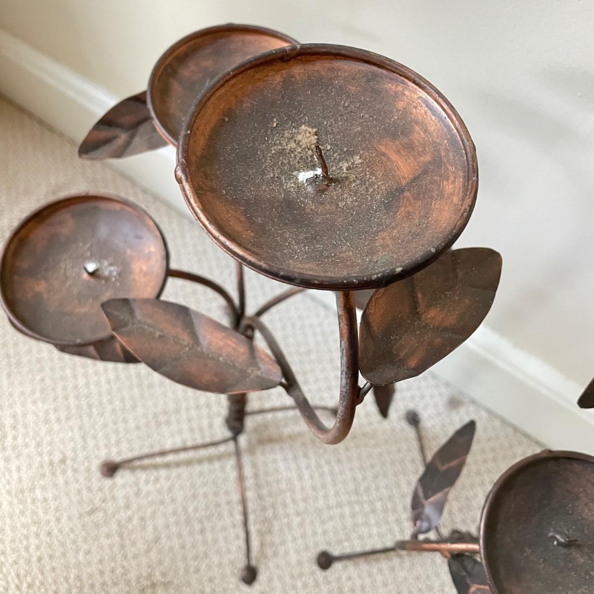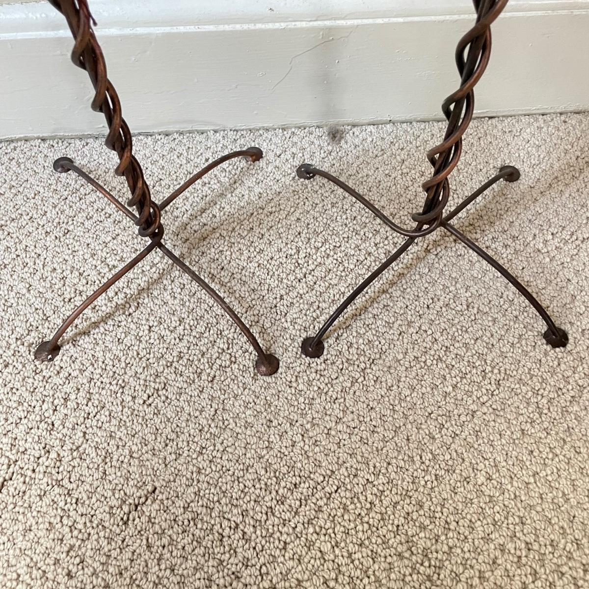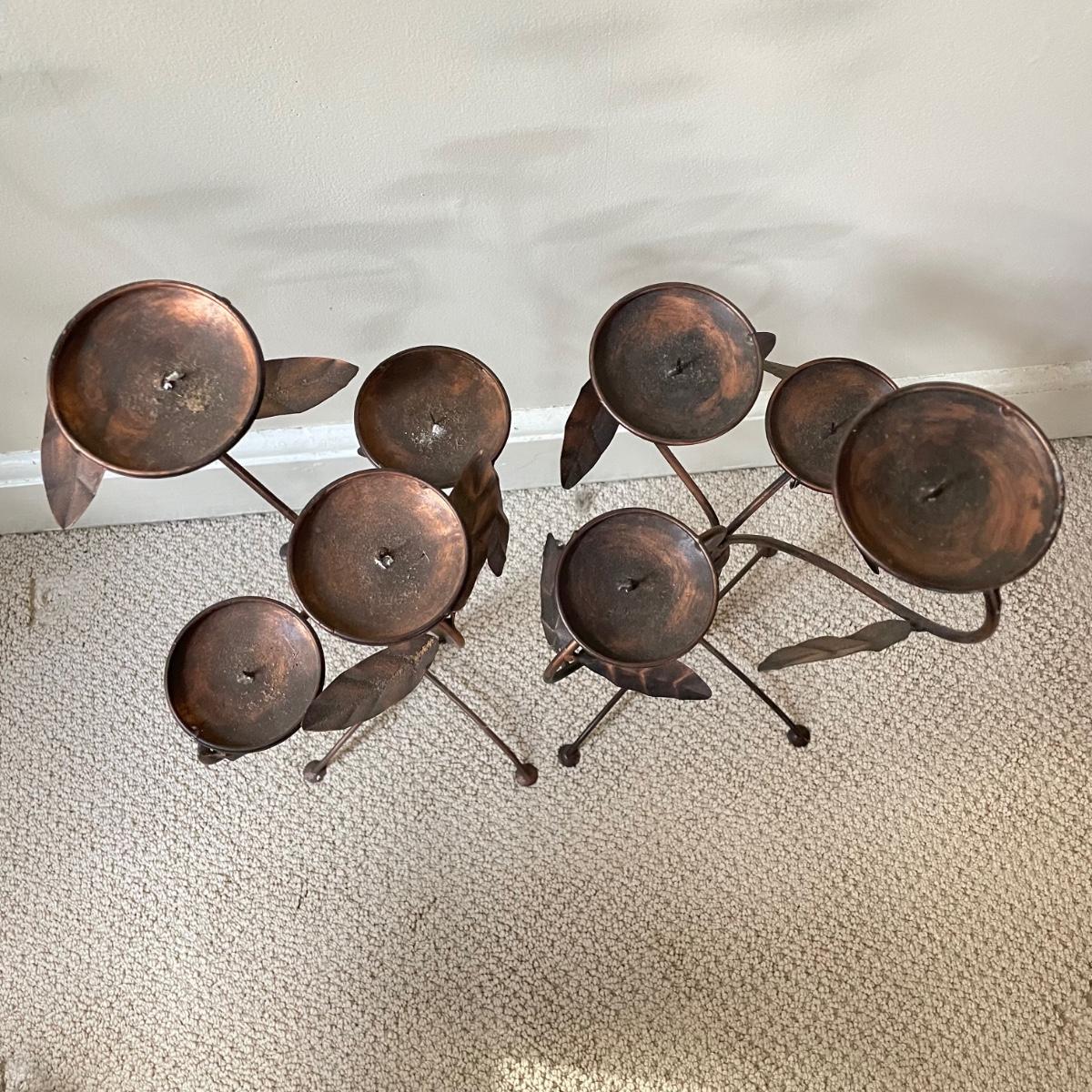 Three rustic swiveling candle holders or utensil holders. Each holder can hold four 2.5”D candles each. Holders are metal with small chicken-wire style fencing. Each measures approximately 6.5”SQ x 10.5”H. Each holder has what appears to be their original price tag attached. Next, a matching pair of 24” tall swirled metal candle holders. These can hold four 2.75”D pillar candles. Under each candle, there is a hoop to hang more decor such as ornaments, light catchers or crystals. Shipping available.