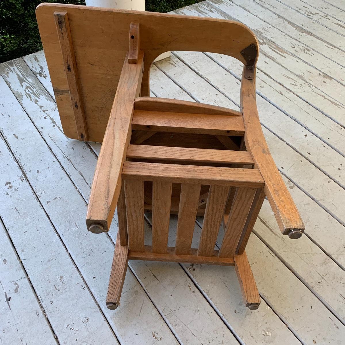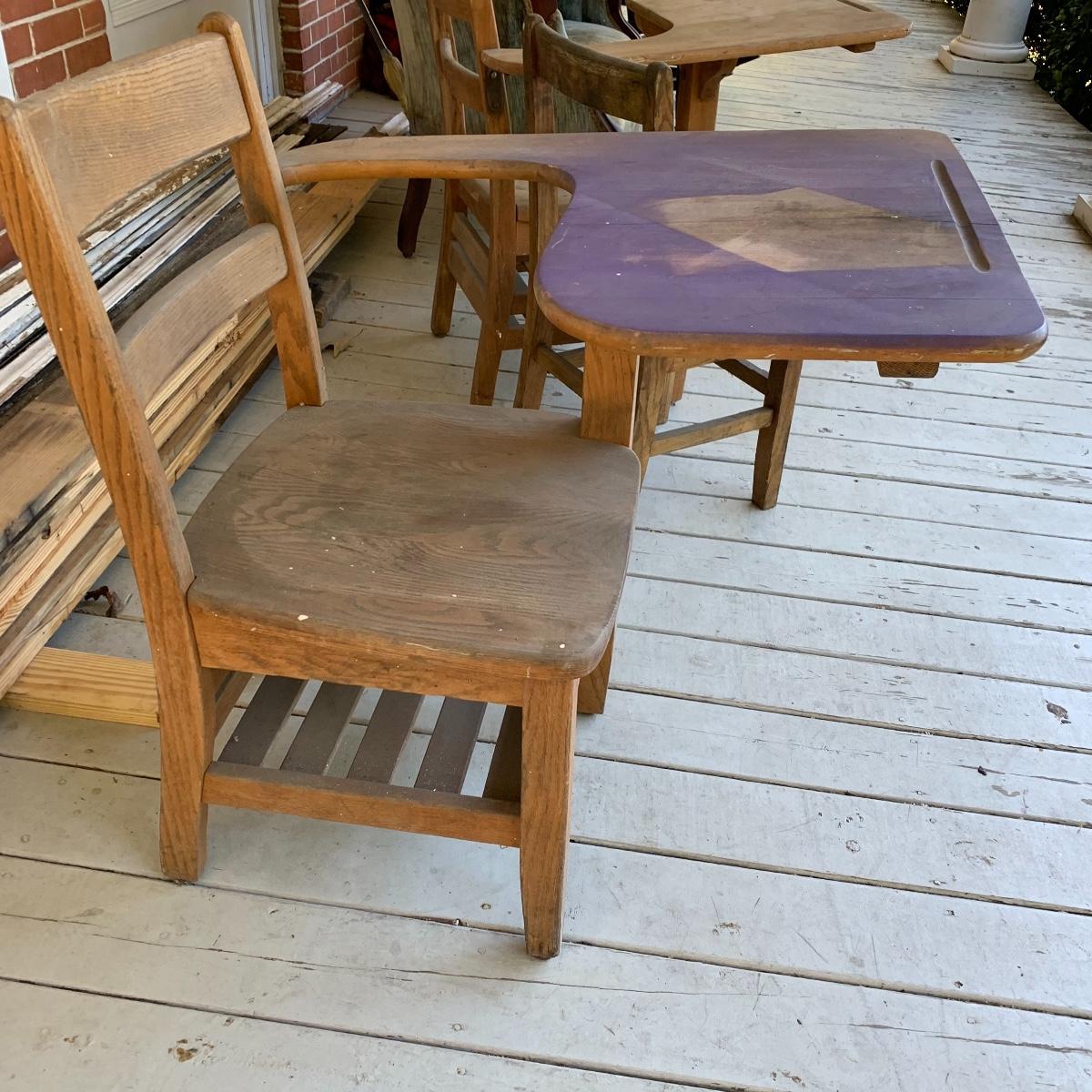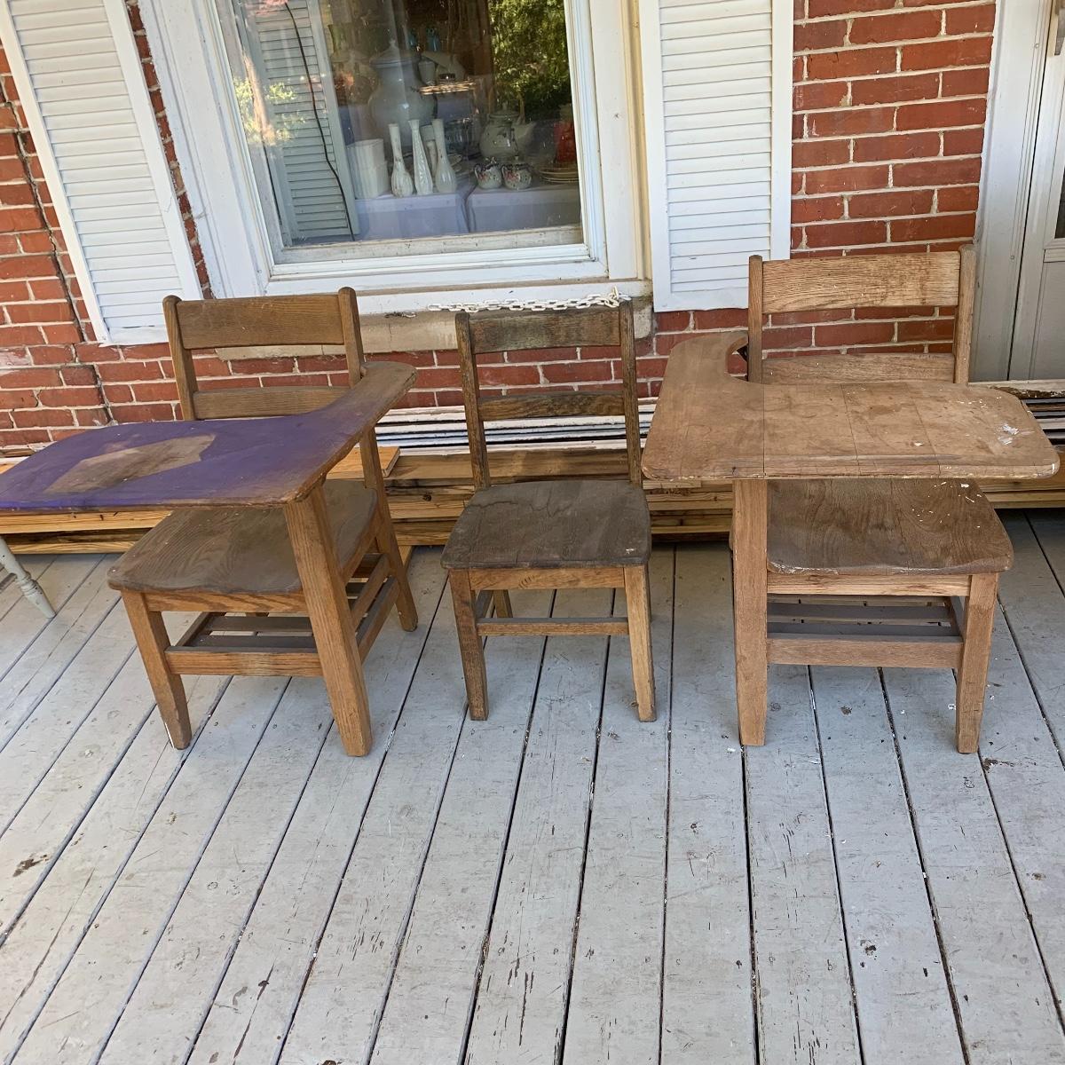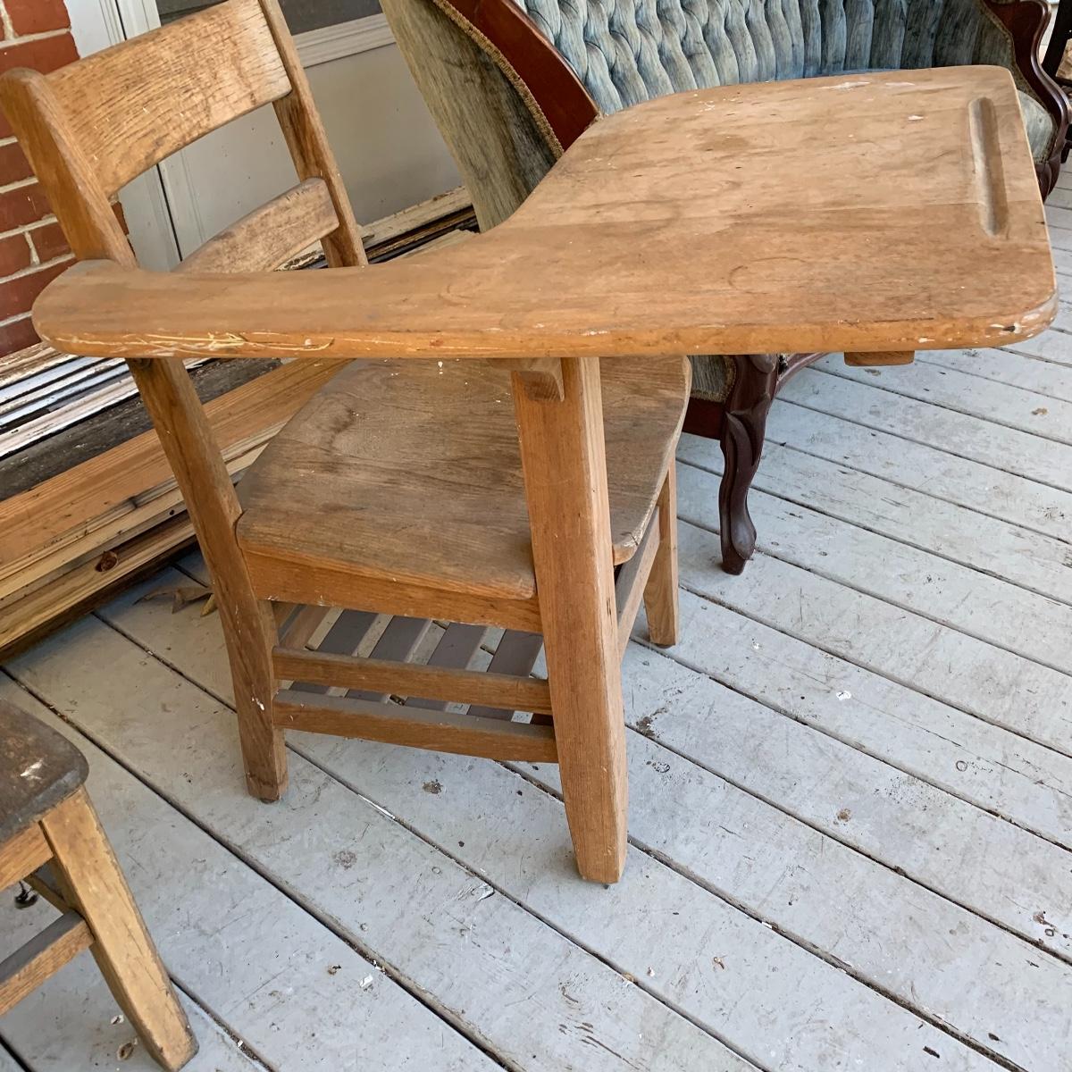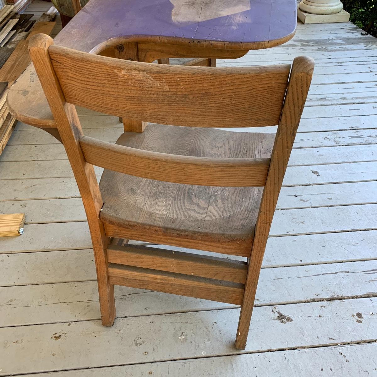 These three solid oak wood chairs with two having built in desks and bottom storage are hefty solid pieces. The two Desked chairs measure 30.5”x22”x32.5” with one being a right handed desk and the other a left. All need a good cleaning and sanding. The lefty desk chair has purple spray paint on the desk surface Local pick up