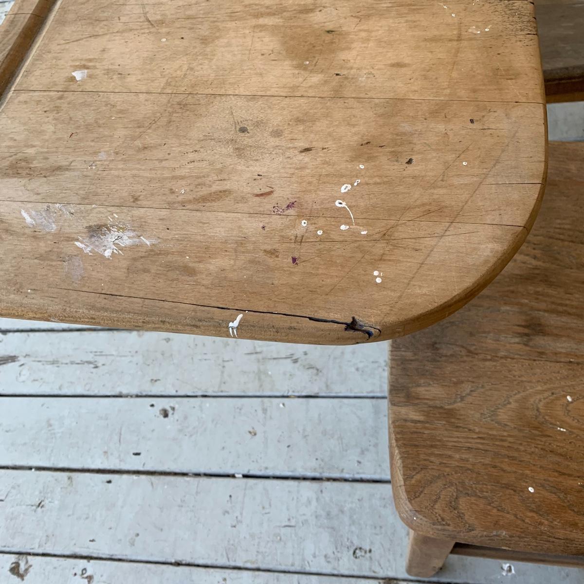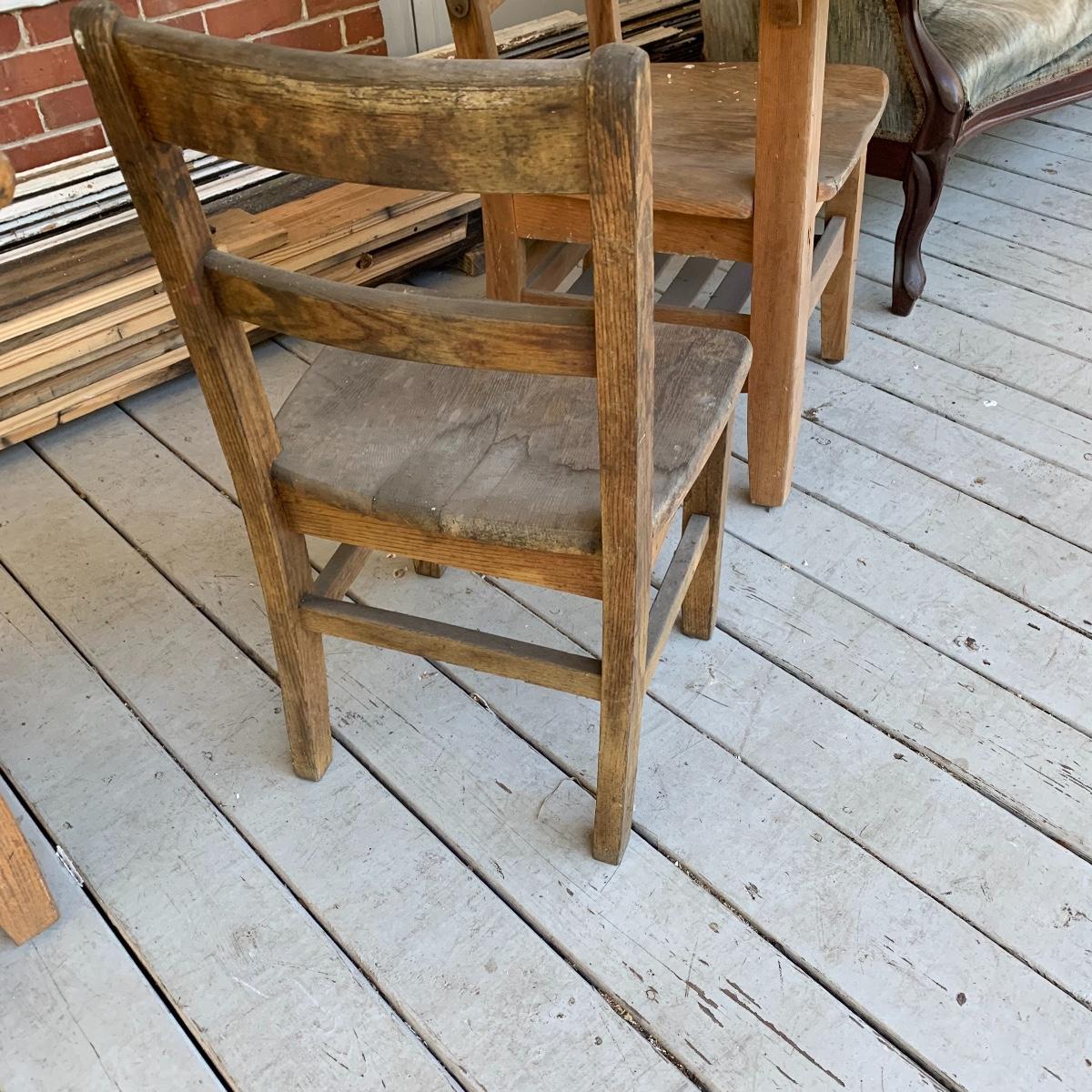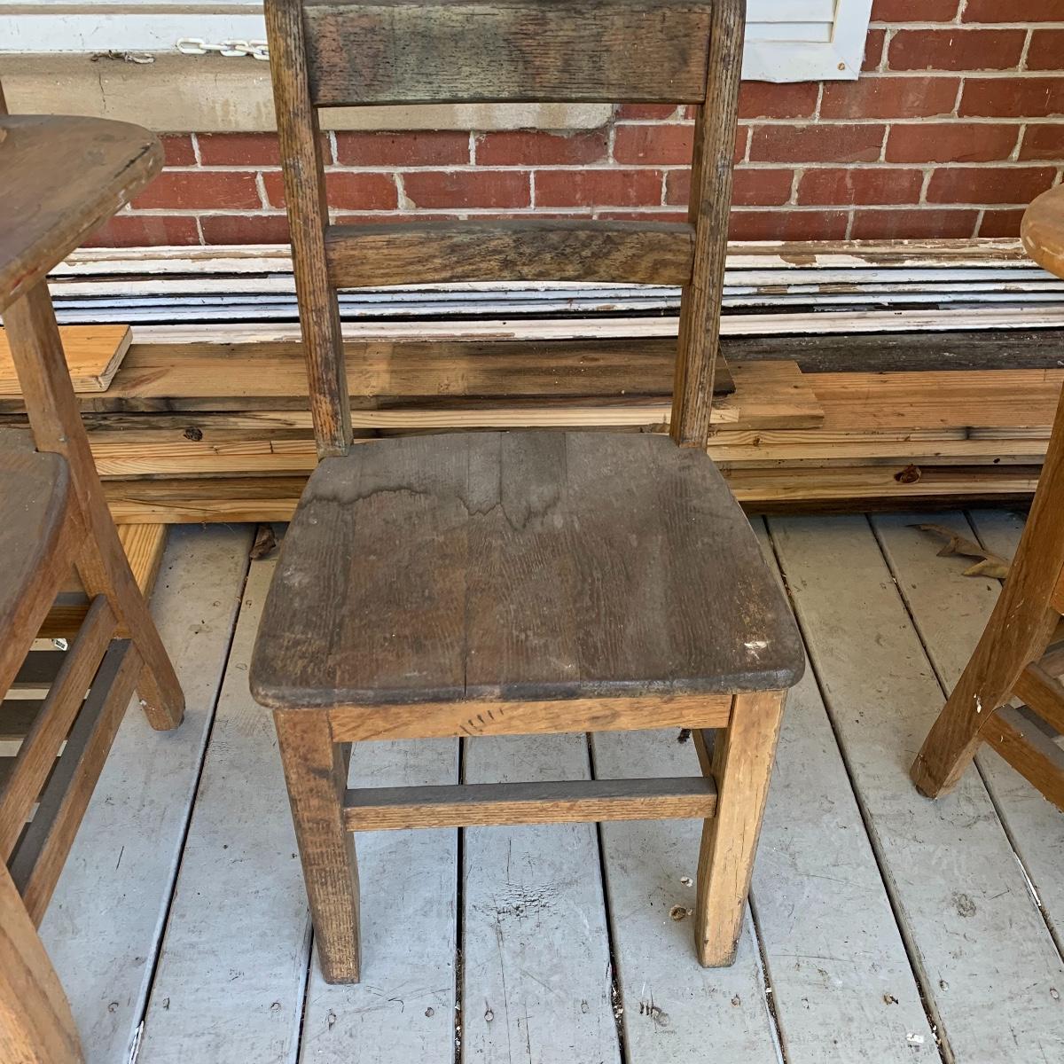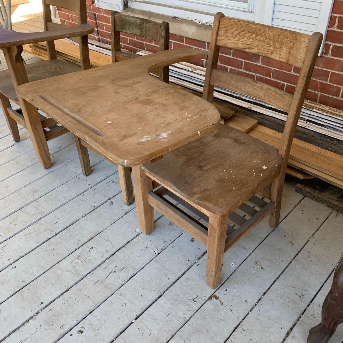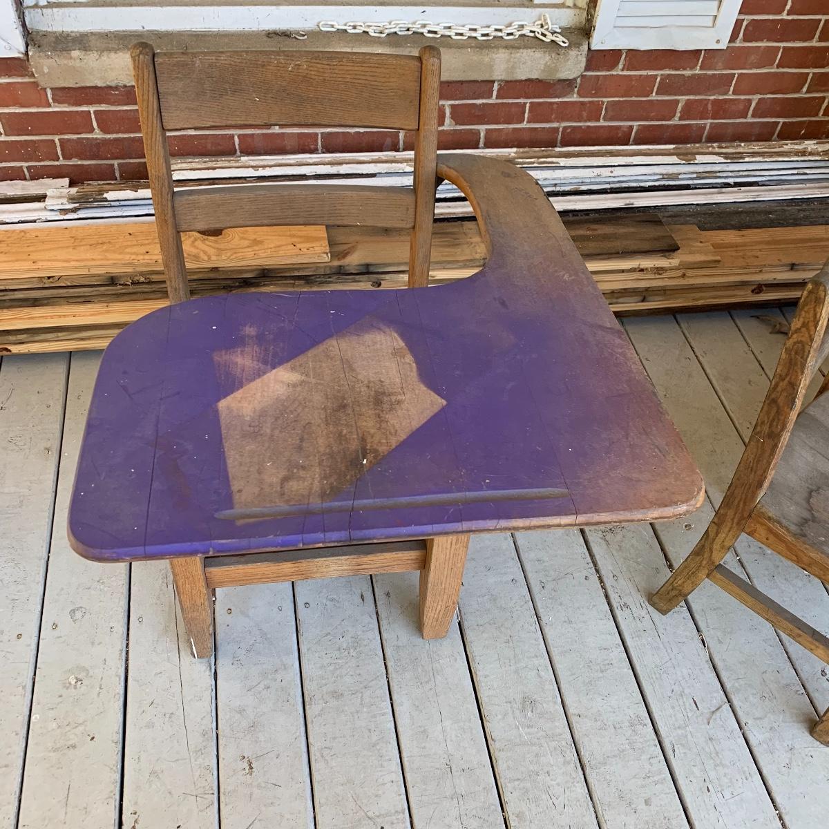 These three solid oak wood chairs with two having built in desks and bottom storage are hefty solid pieces. The two Desked chairs measure 30.5”x22”x32.5” with one being a right handed desk and the other a left. All need a good cleaning and sanding. The lefty desk chair has purple spray paint on the desk surface Local pick up