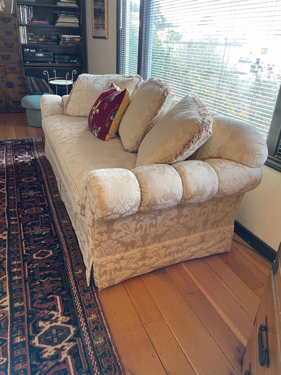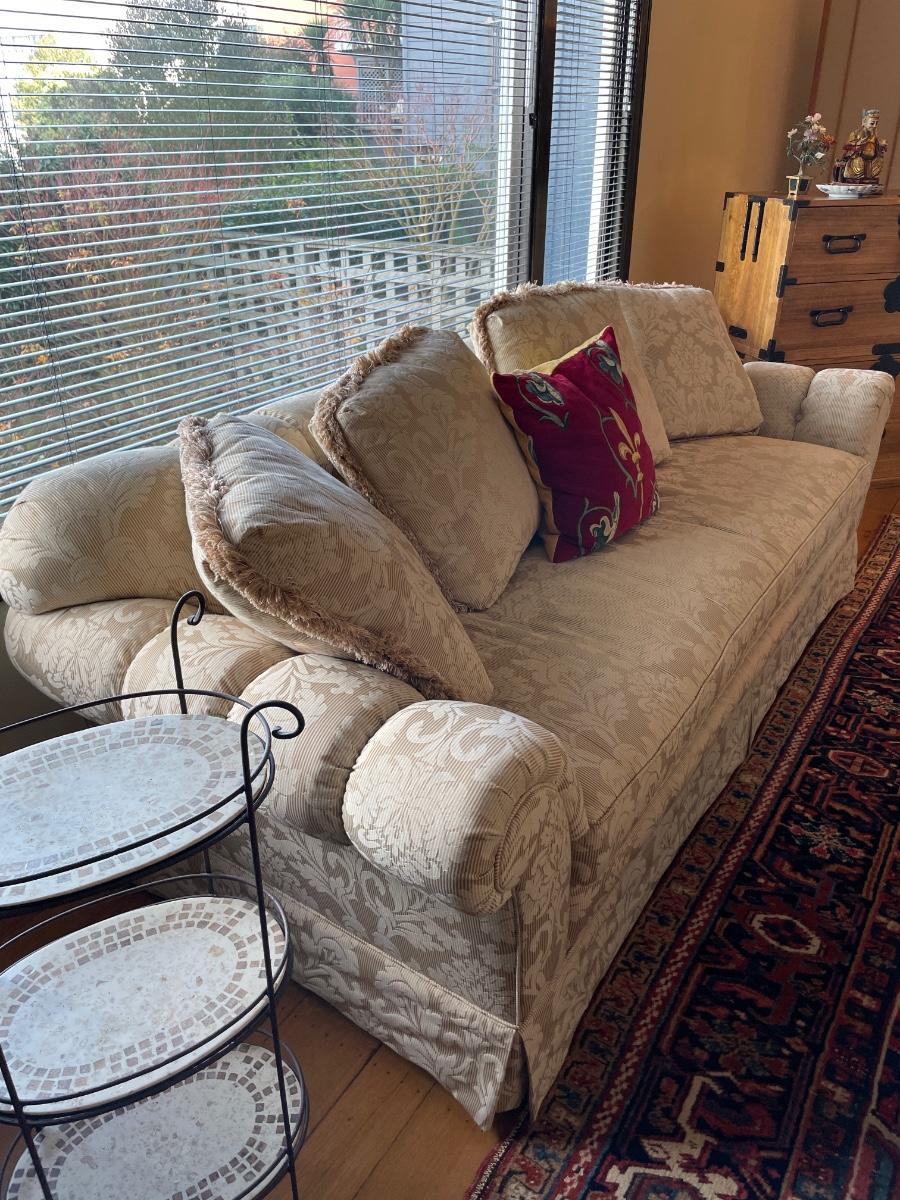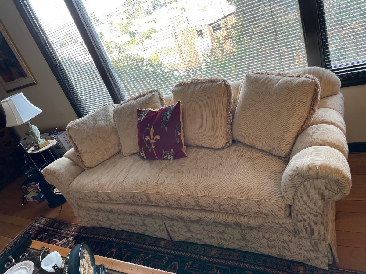 White three seat sofa with pillows. Excellent condition. There is a matching arm chair also available on auction.