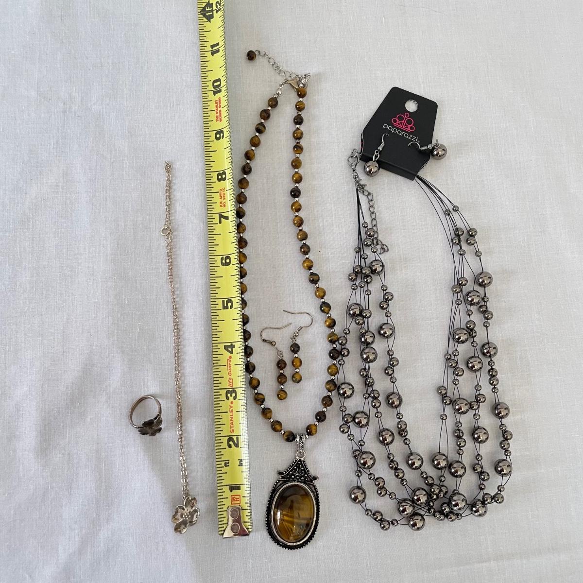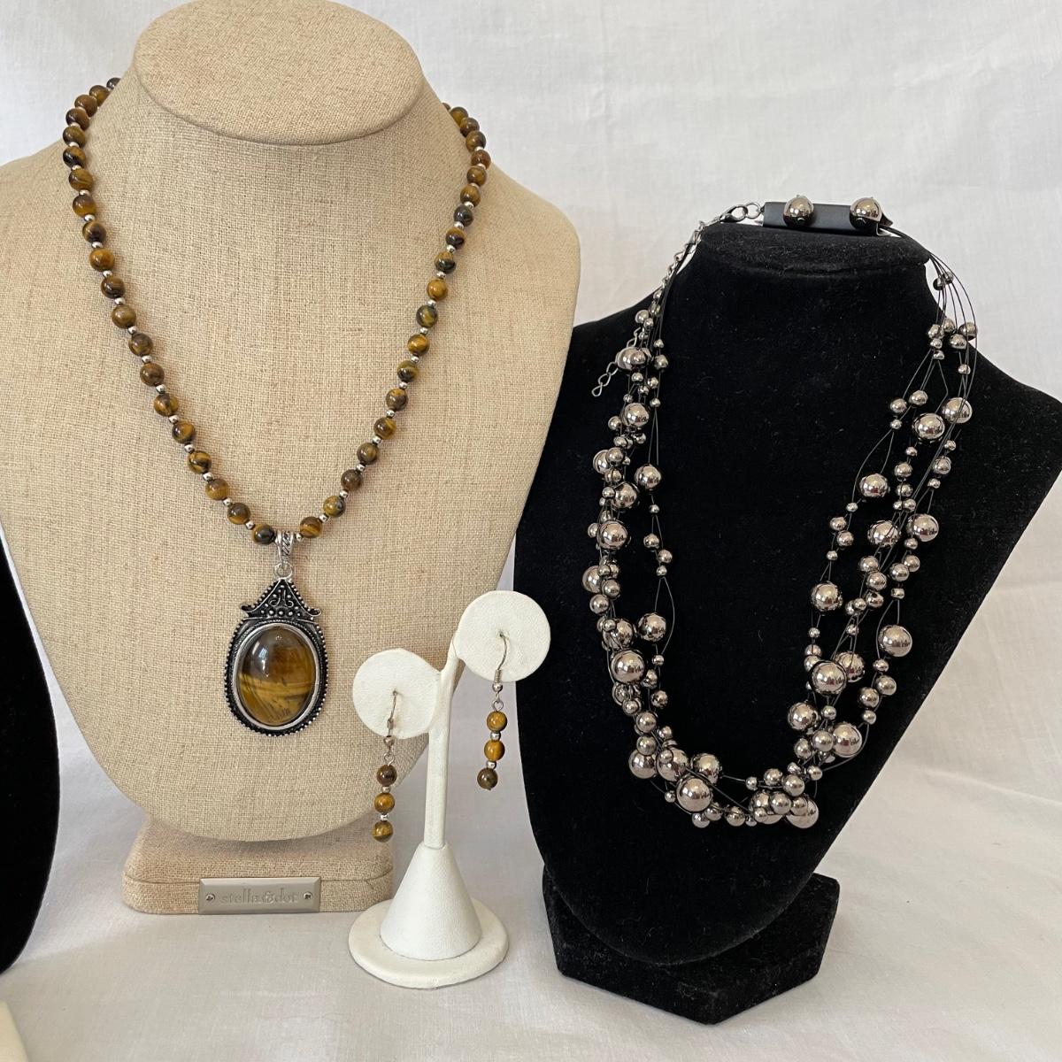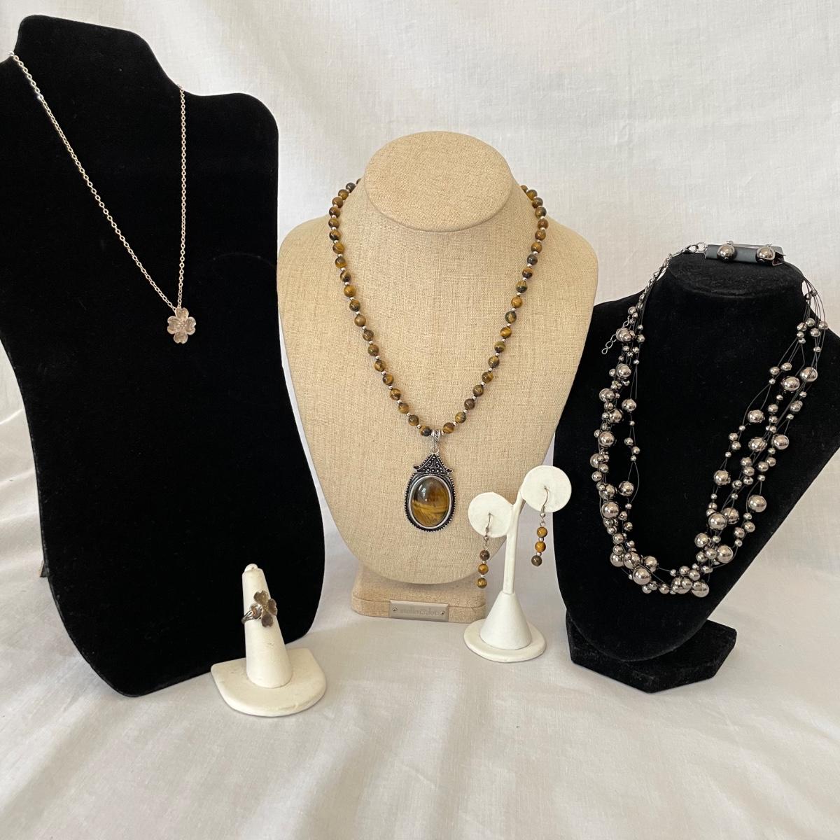Three pretty jewelry sets. There is a vintage necklace and ring set that is stamped "Nye" and "Sterling" and two dangle earrings and necklace combos. The silver bead set appears to be unworn. See images. Shipping available. All sales are final. No returns or refunds. Please bid accordingly.