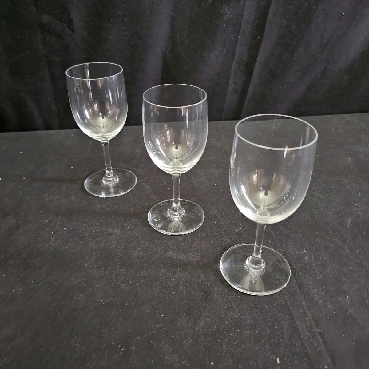 Three different styles of Baccarat crystal glasses. Could be used for wine, aperitif or cordials. All items imprinted with Baccarat logo. Sizes are 2.75" x 6"H, 2.75" x 5.5"H and 2.5" x 5"H. No chips or nicks seen. See photos for details. Shipping available.