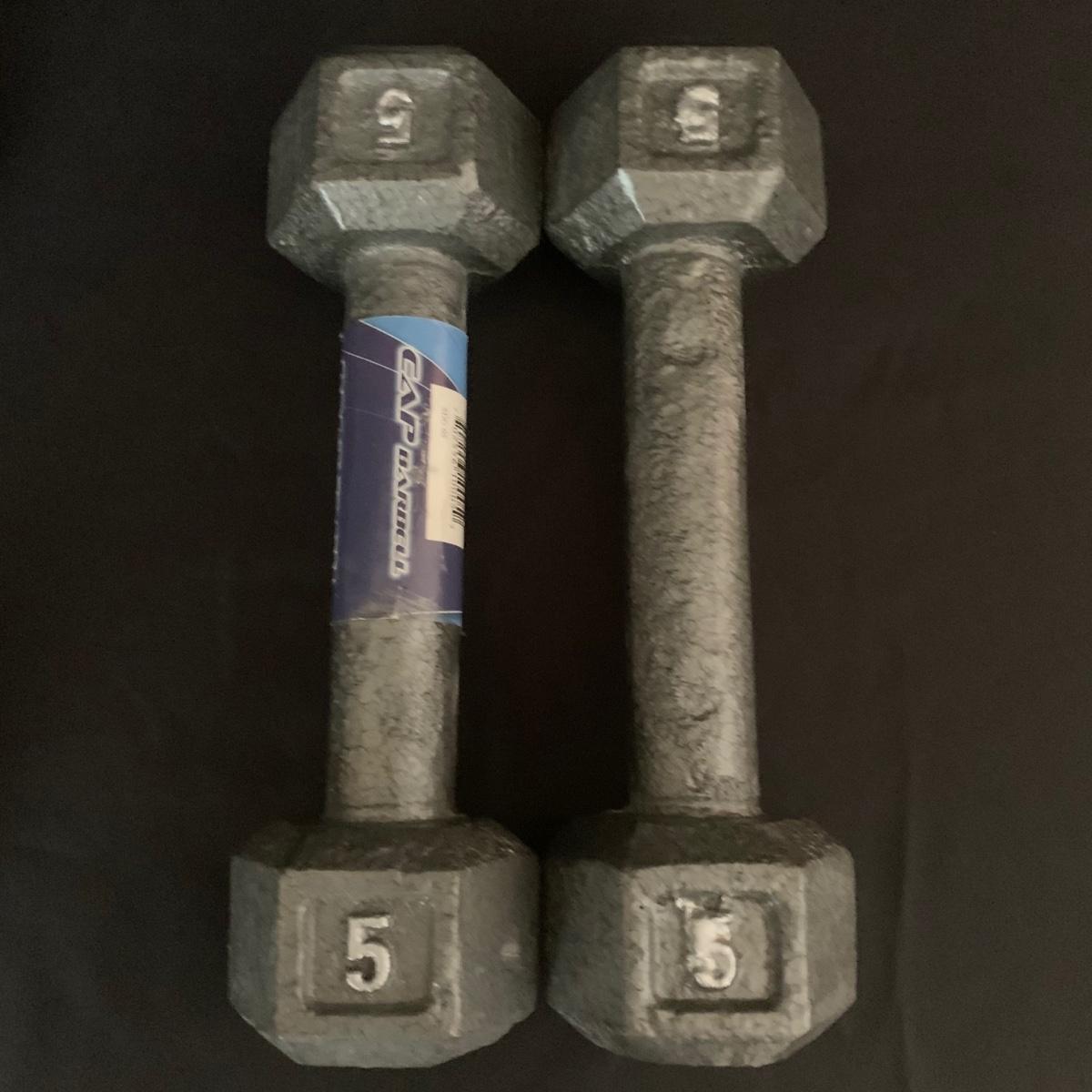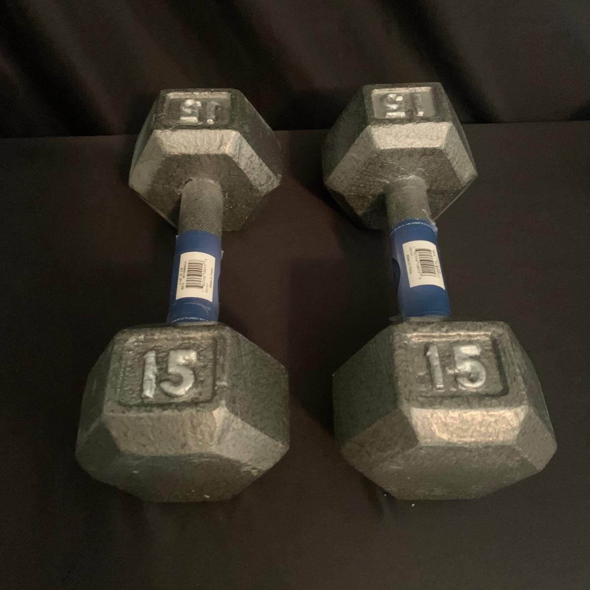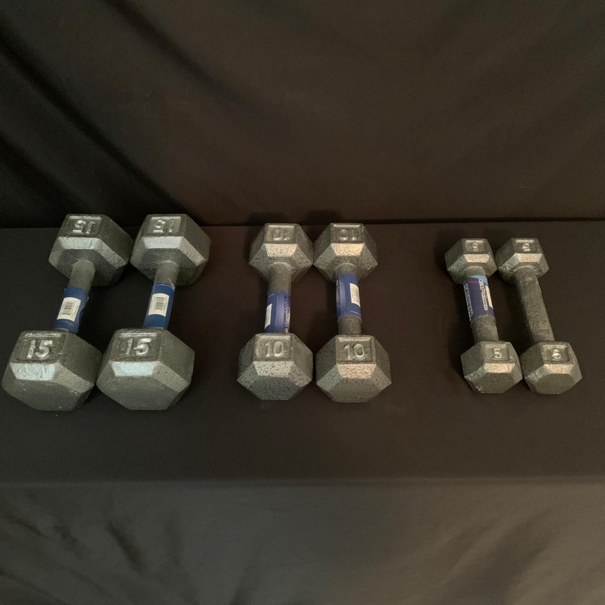 Three sets of CAP Strength cast iron hex dumbbells. All three sets appear to be in new condition with tags. Lot includes two fifteen pound, two ten pound, and two five pound weights. Largest weight measures, 10.5”L x 4”W x 4”H.