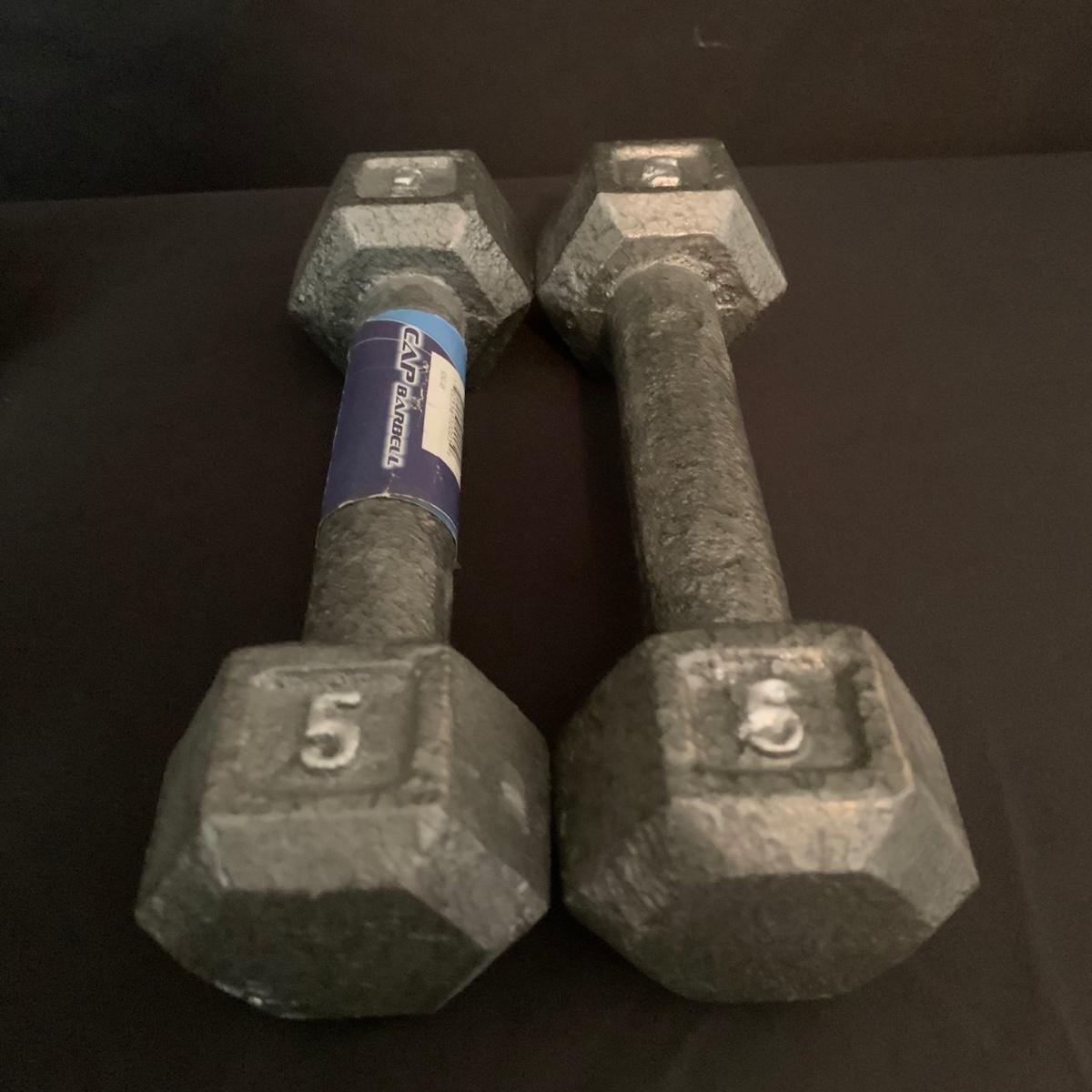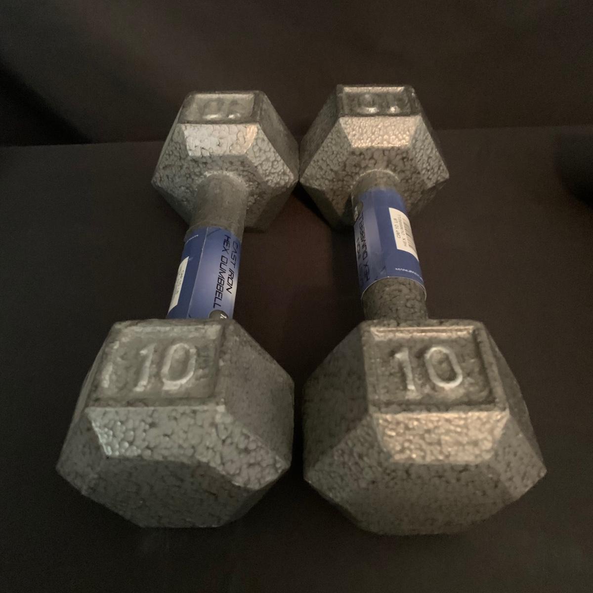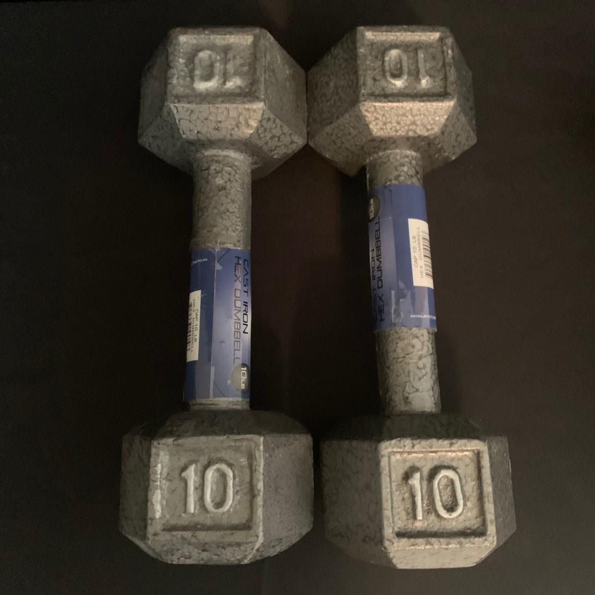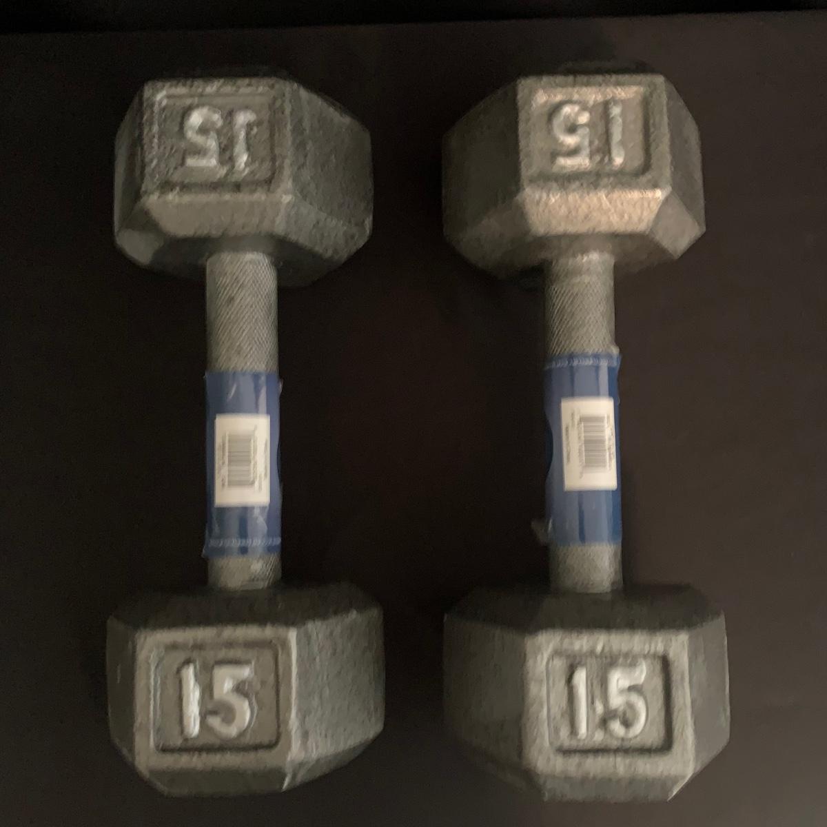 Three sets of CAP Strength cast iron hex dumbbells. All three sets appear to be in new condition with tags. Lot includes two fifteen pound, two ten pound, and two five pound weights. Largest weight measures, 10.5”L x 4”W x 4”H.