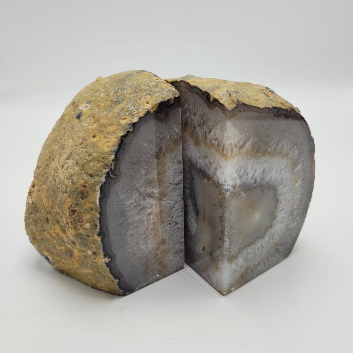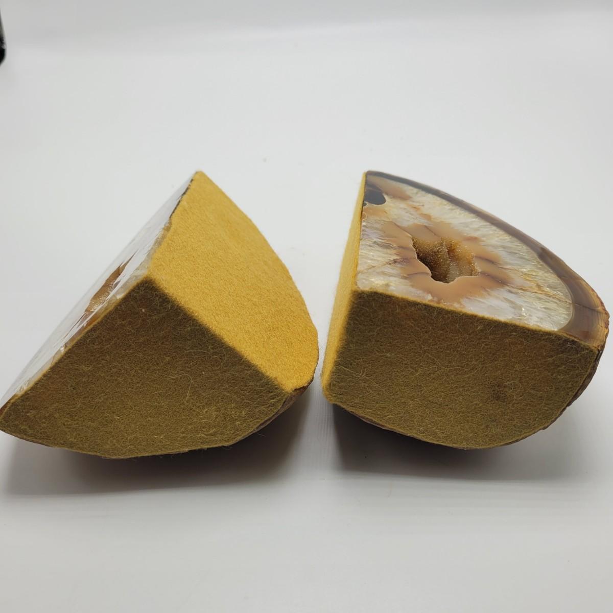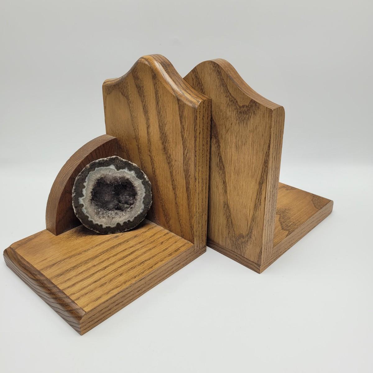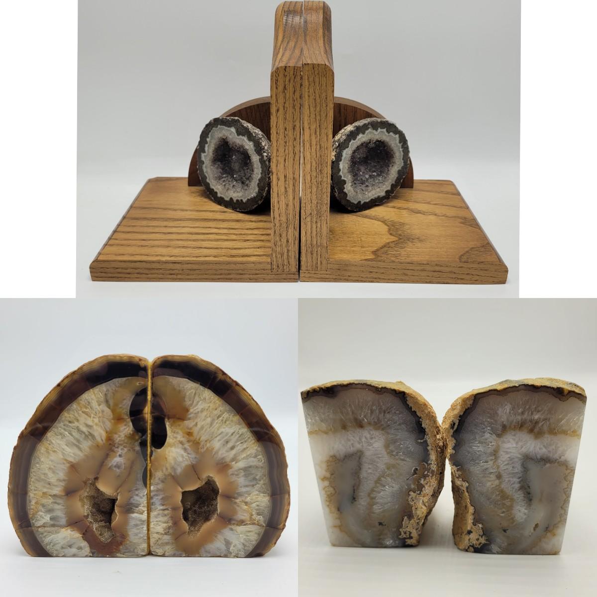 This lot includes three sets (six pieces) of geode bookends. The first set is made from wood and features a spherical split geode on both sides. These ends individually measure 5" x 6" x 9"H. The second geode is large and appears to be some form of agate. It is cut and polished from and egg shaped rock and has felt on some edges to prevent friction or scratching. The last and smallest geode is also a split rock filled with what appears to be quartz. The edges of all rocks have been polished smooth to elevate appearance.