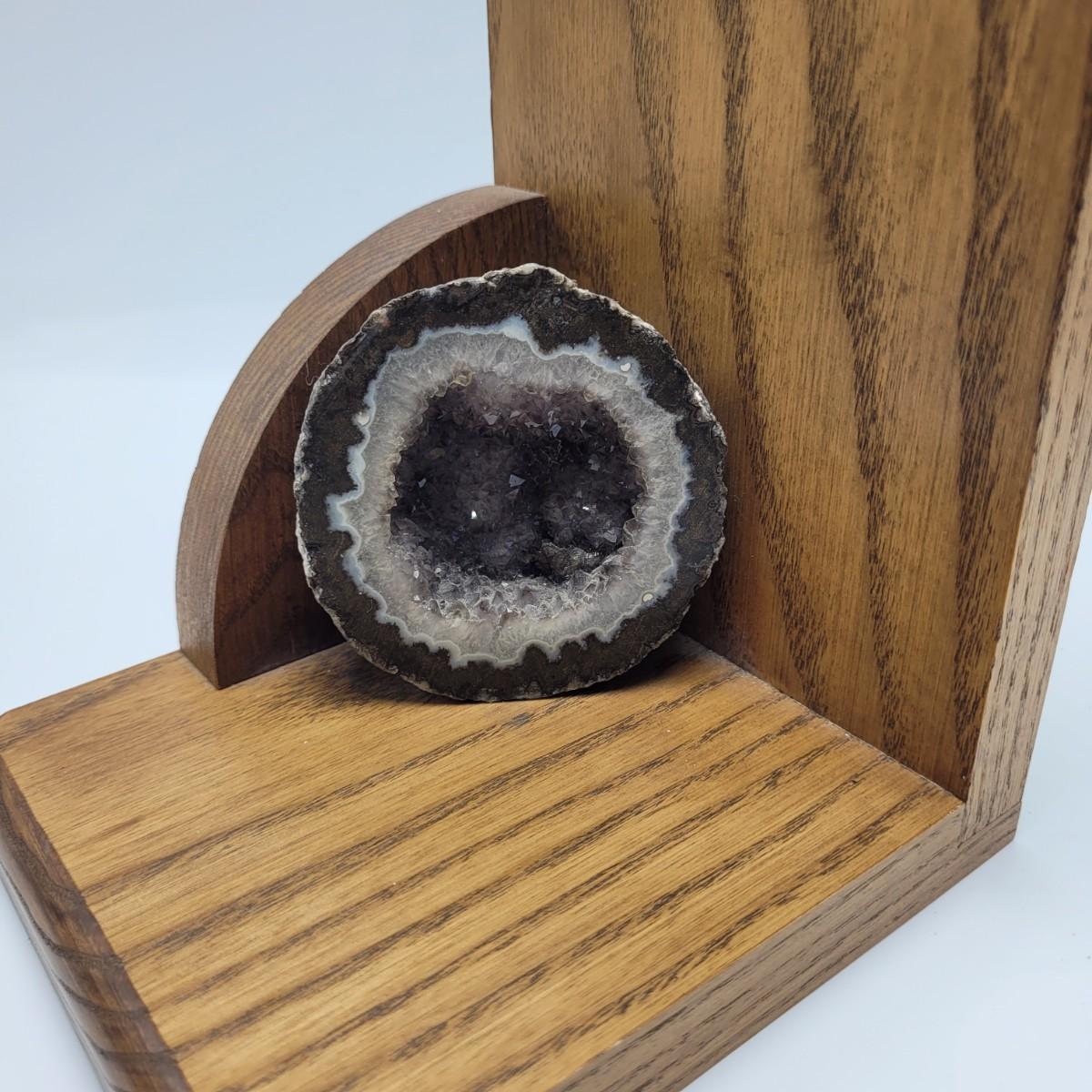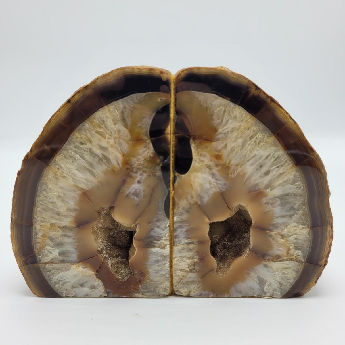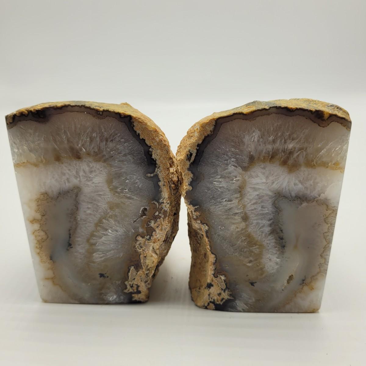 This lot includes three sets (six pieces) of geode bookends. The first set is made from wood and features a spherical split geode on both sides. These ends individually measure 5" x 6" x 9"H. The second geode is large and appears to be some form of agate. It is cut and polished from and egg shaped rock and has felt on some edges to prevent friction or scratching. The last and smallest geode is also a split rock filled with what appears to be quartz. The edges of all rocks have been polished smooth to elevate appearance.