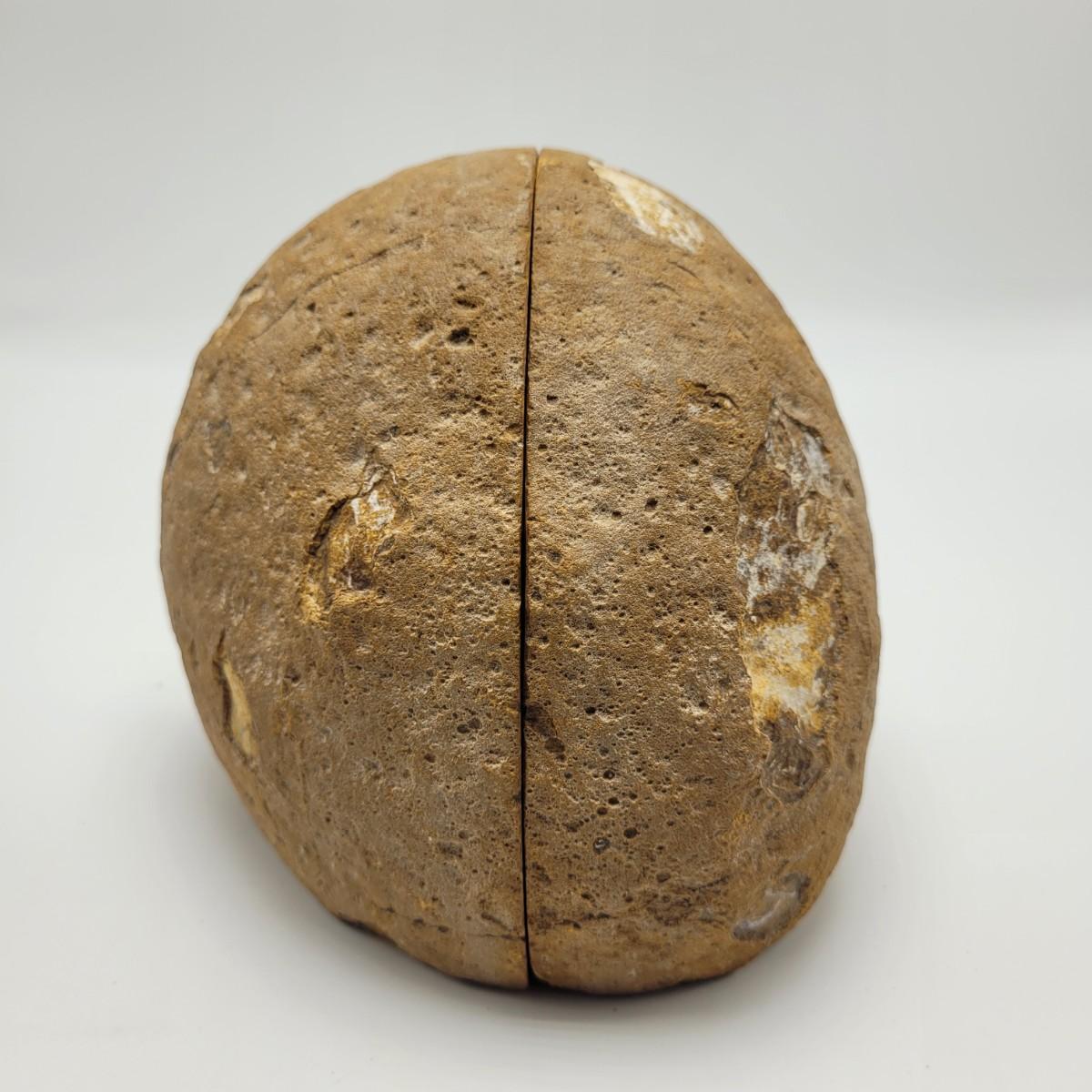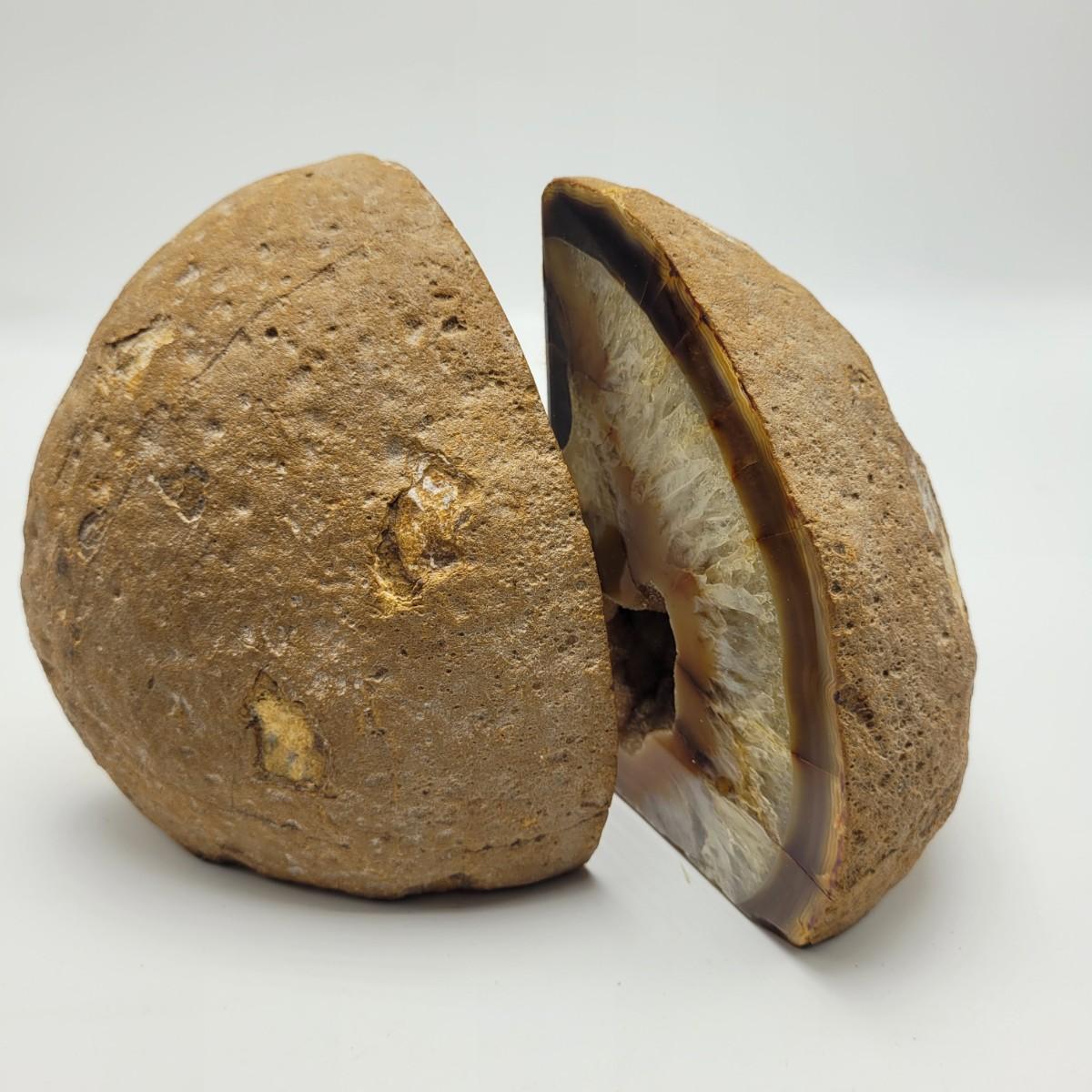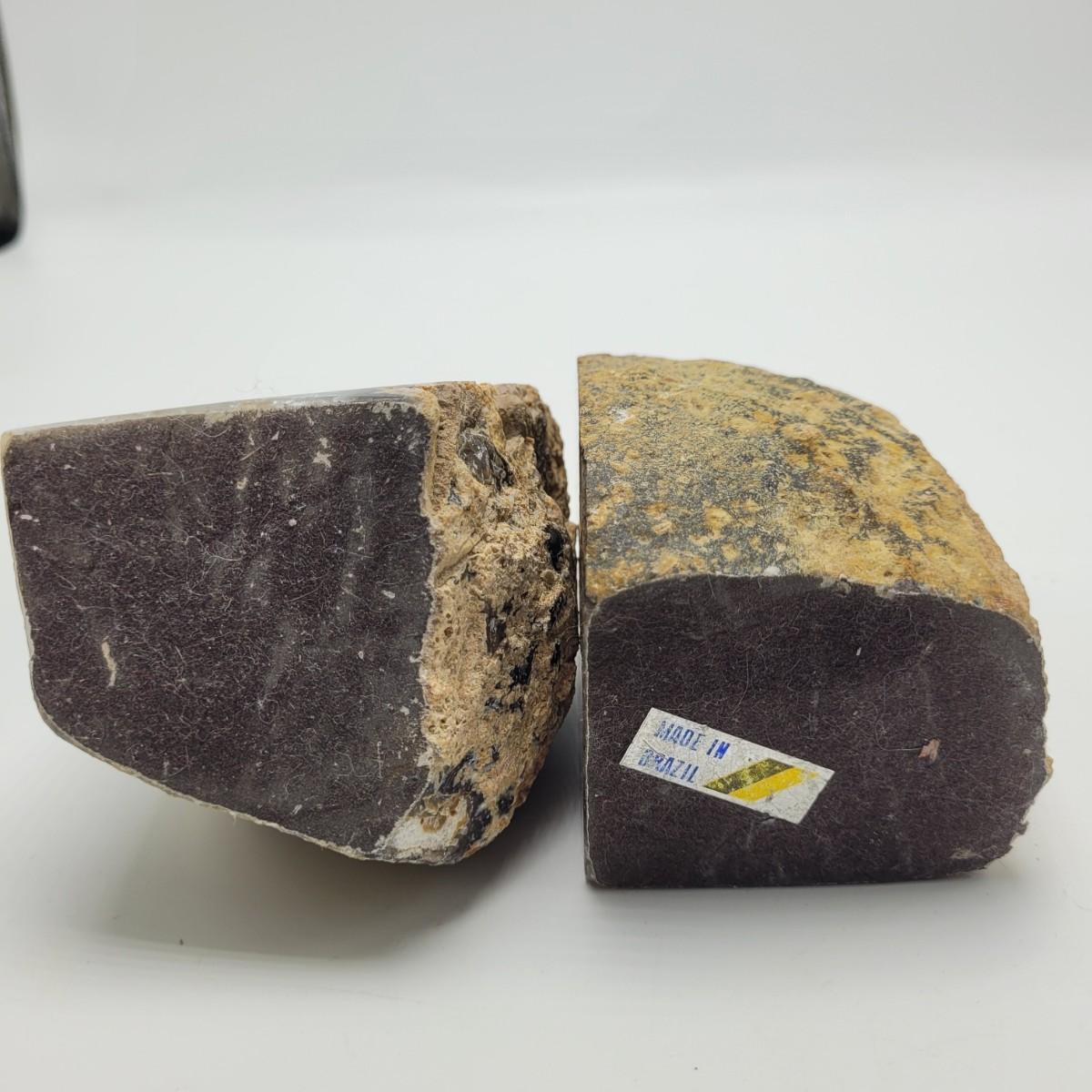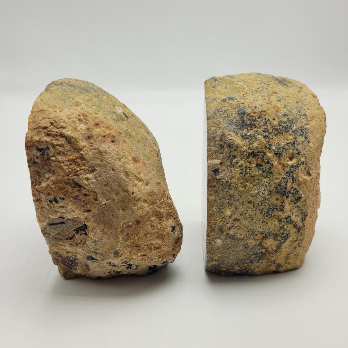 This lot includes three sets (six pieces) of geode bookends. The first set is made from wood and features a spherical split geode on both sides. These ends individually measure 5" x 6" x 9"H. The second geode is large and appears to be some form of agate. It is cut and polished from and egg shaped rock and has felt on some edges to prevent friction or scratching. The last and smallest geode is also a split rock filled with what appears to be quartz. The edges of all rocks have been polished smooth to elevate appearance.