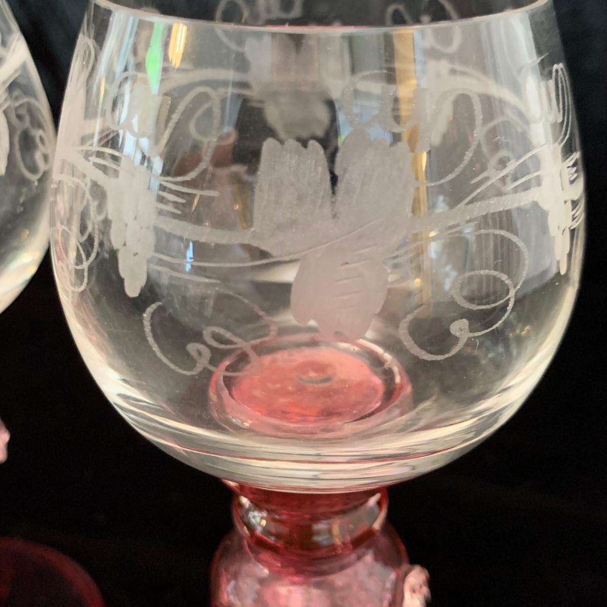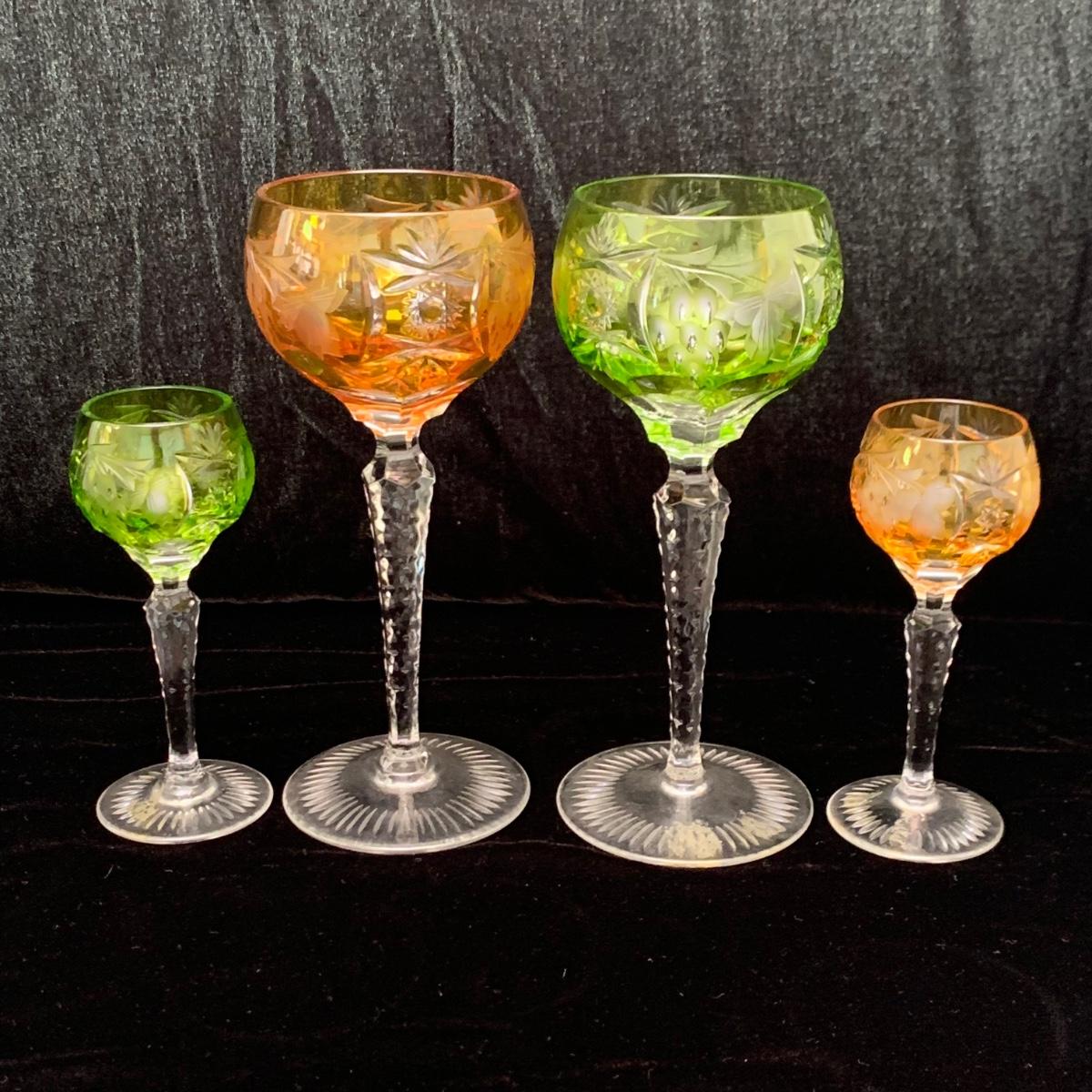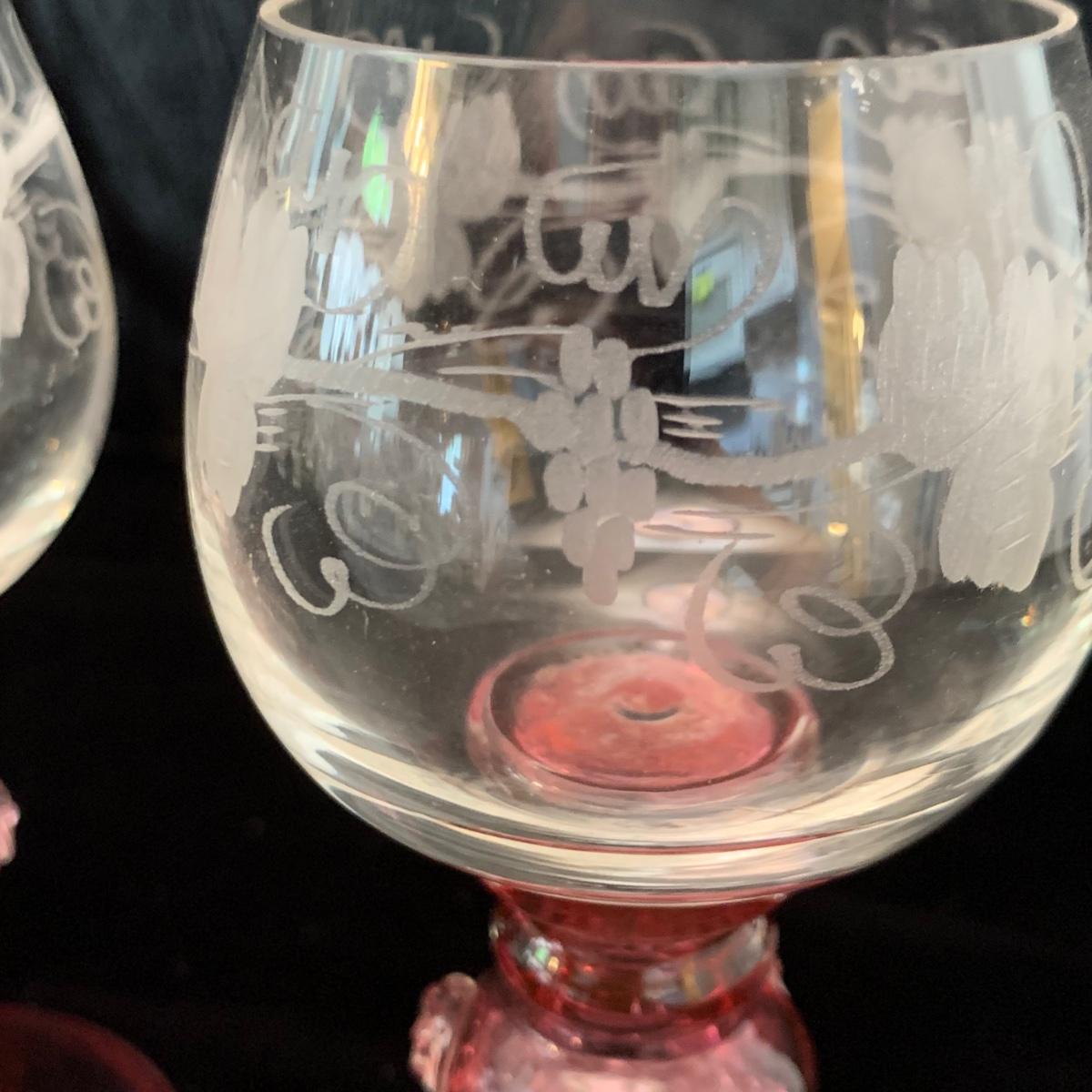 Three sets of small colorful etched glass stemware. The set of four glasses with rose colored beehive bases feature an etched grapevine design and are 6”H. The other set of four glasses has two 7”H glasses and two 4.5”H glasses, one of each size is lime green and one of each size is amber. These also have a grape design and they appear to be crystal. There is a cleanable substance on the bases of this set. The other set with the green beehive bases has 12 glasses, six that are 3.5”H and six that are 5”H.
